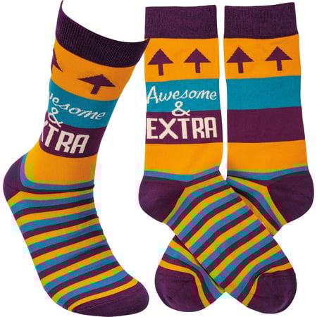 These colorful socks from our LOL Made You Smile Collection feature woven designs with coordinating "Awesome & Extra" sentiment. Cotton, nylon, spandex. These awesome and extra socks are one size fits most.
