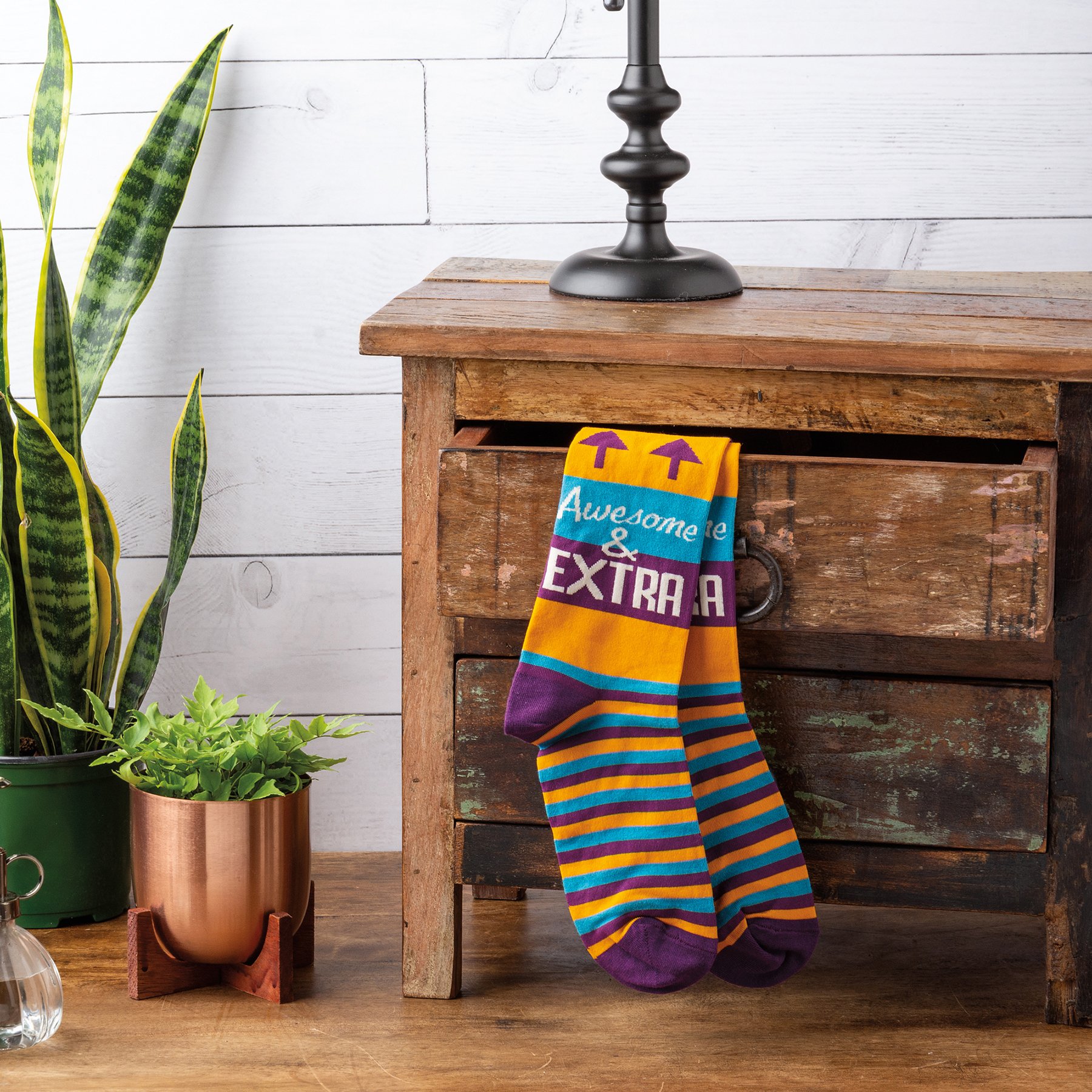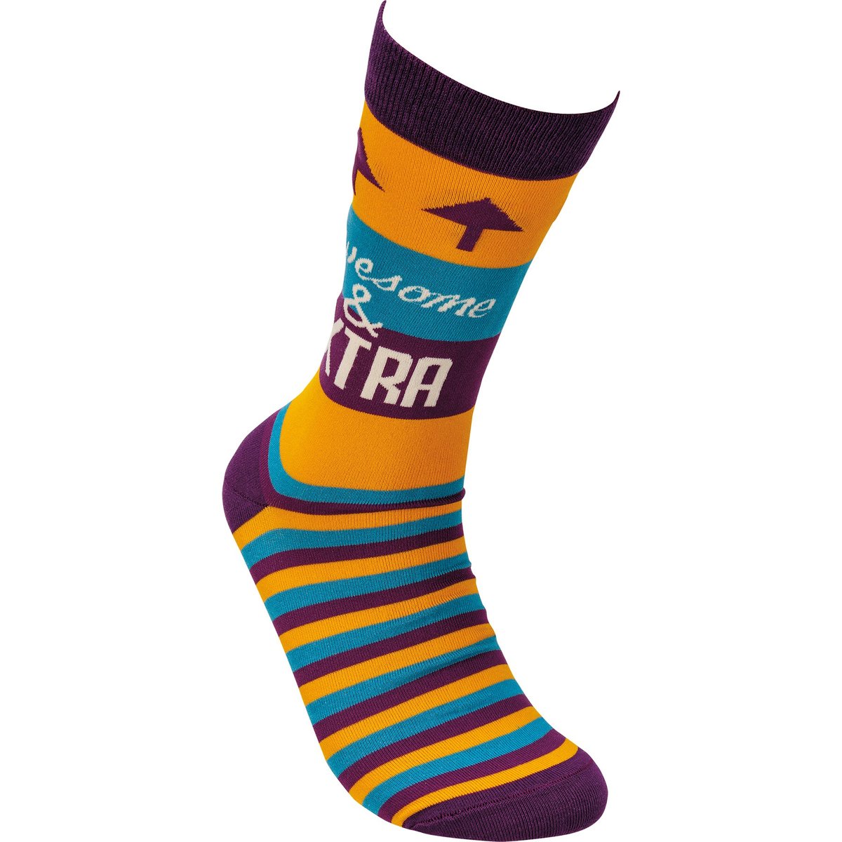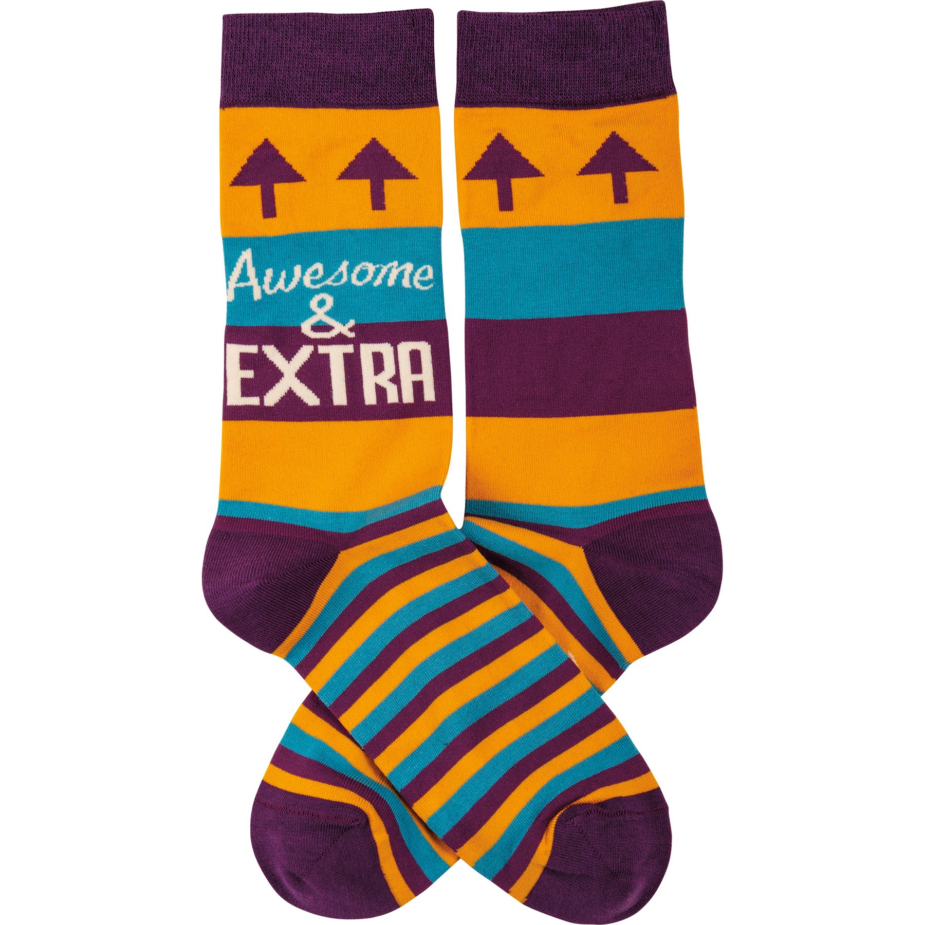 These colorful socks from our LOL Made You Smile Collection feature woven designs with coordinating "Awesome & Extra" sentiment. Cotton, nylon, spandex. These awesome and extra socks are one size fits most.