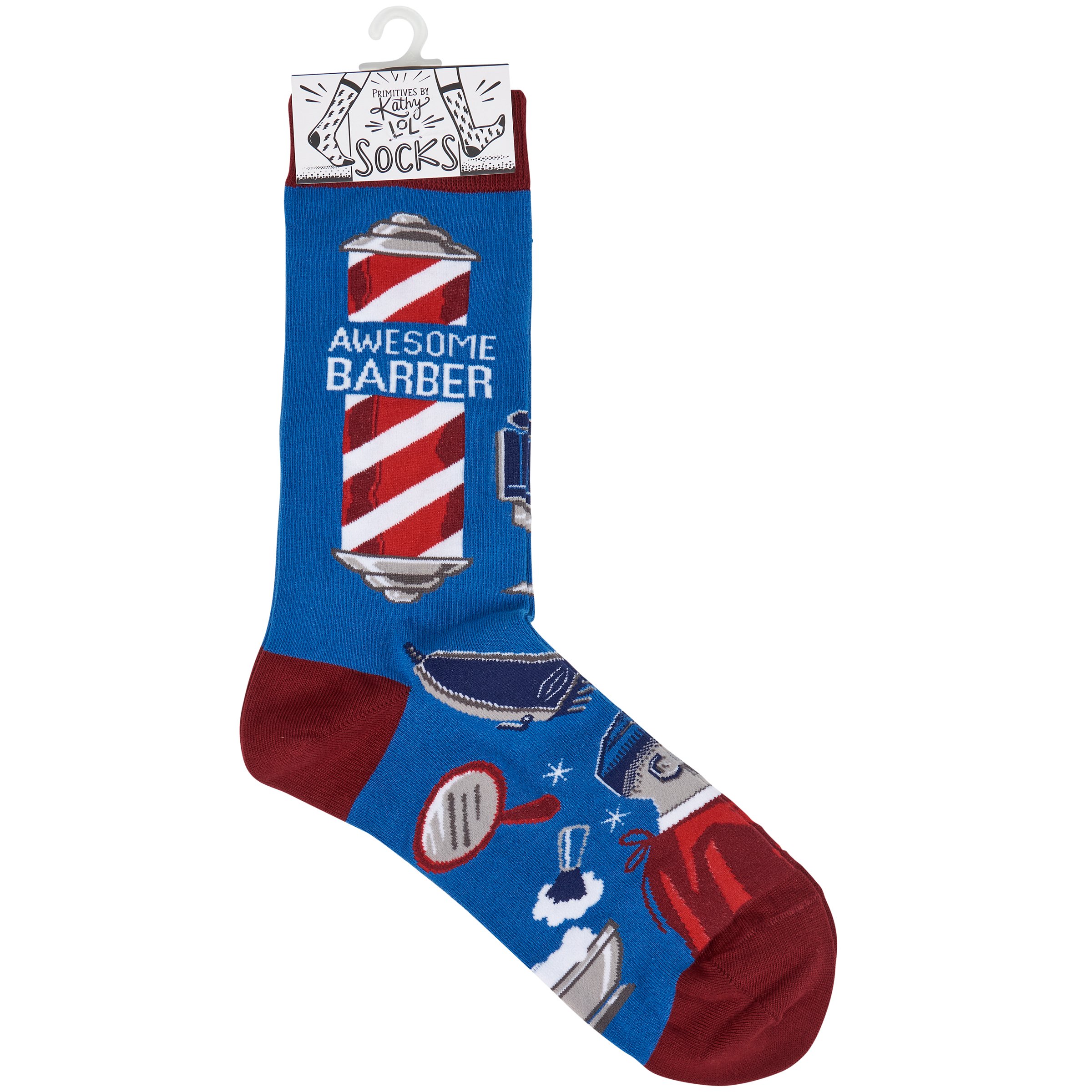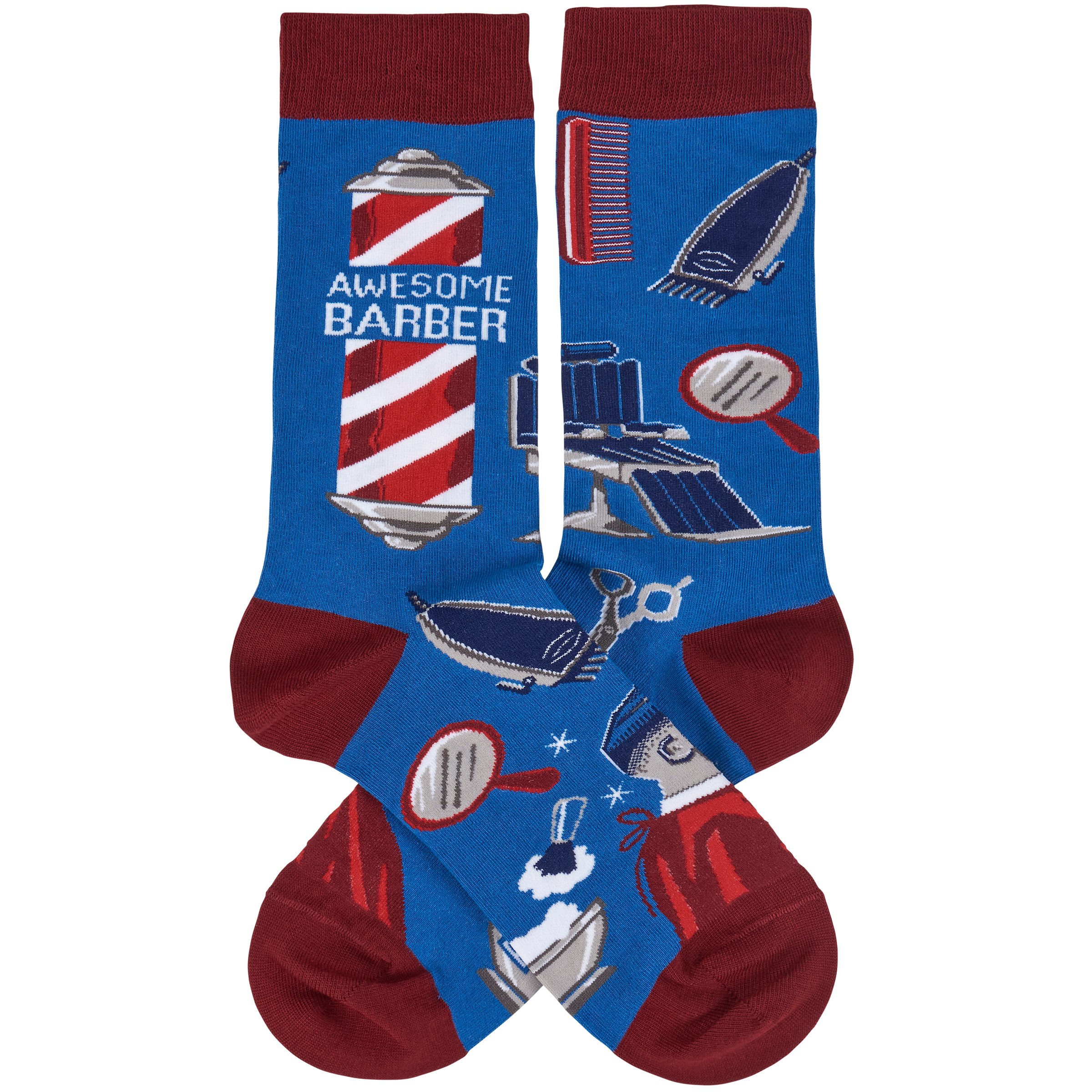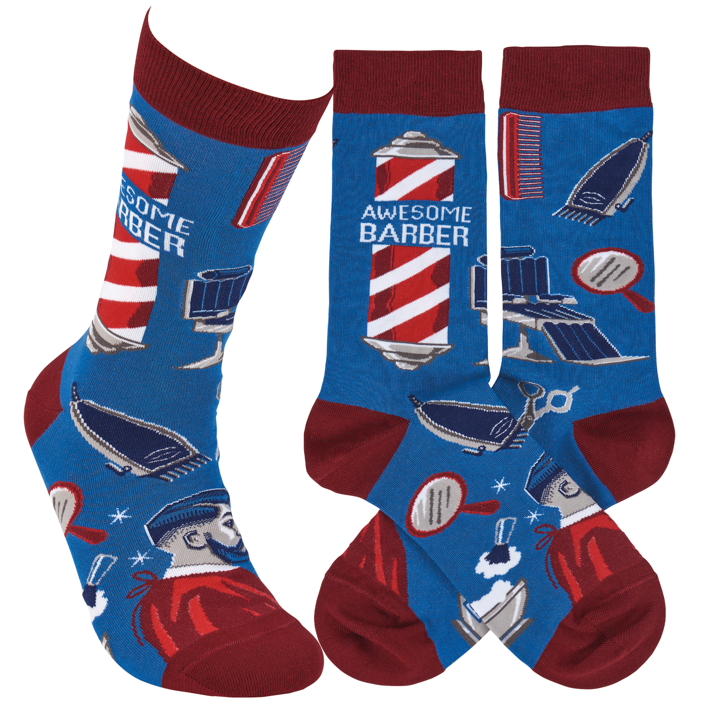 A pair of colorful socks from our LOL-Made You Smile Collection displaying unique hand illustrated designs of barbershop motifs with a fun sentiment that reads "Awesome Barber." Socks feature a one size fits most design made with cotton, nylon, and spandex. Our Awesome Barber socks come with a header card and a clear plastic hanger for display. A fun barber-themed gift perfect for everyday self-expression.