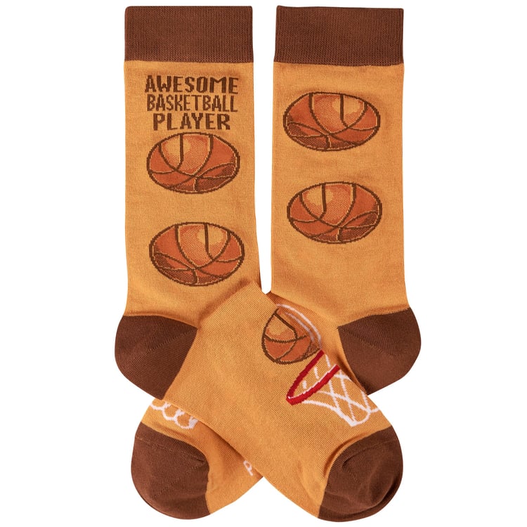 A pair of colorful socks from our LOL-Made You Smile Collection displaying playful hand illustrated designs of basketballs and basketball net with a fun sports inspired sentiment that reads "Awesome Basketball Player." These giftable socks are made with a cotton, nylon, and spandex blend for a one size fits most design. Our Awesome Basketball Player socks come with a decorative header card and a clear plastic hanger for easy rack display and gifting. A fun basketball-themed gift perfect for everyday self-expression.