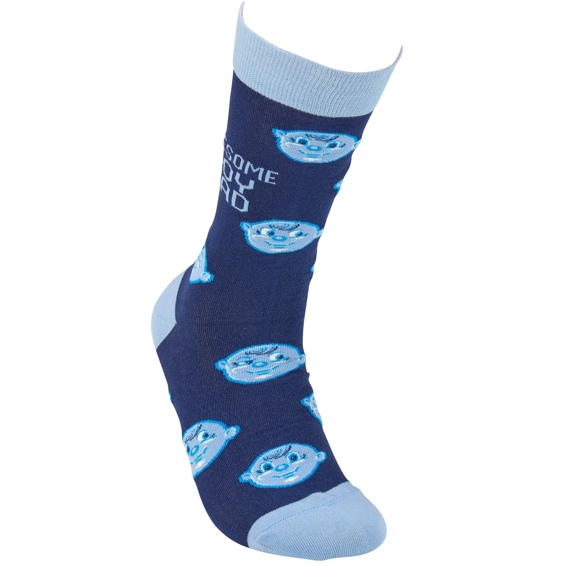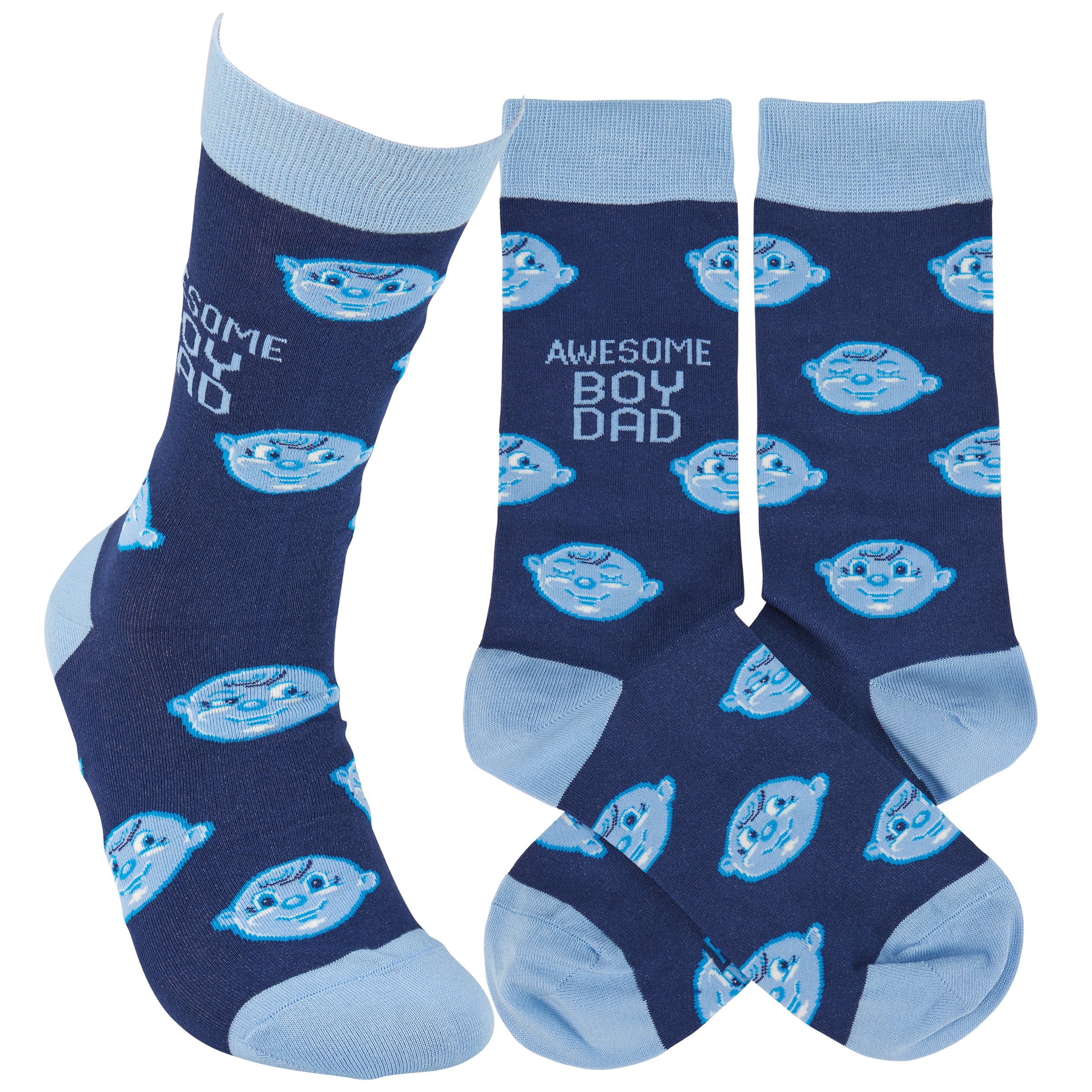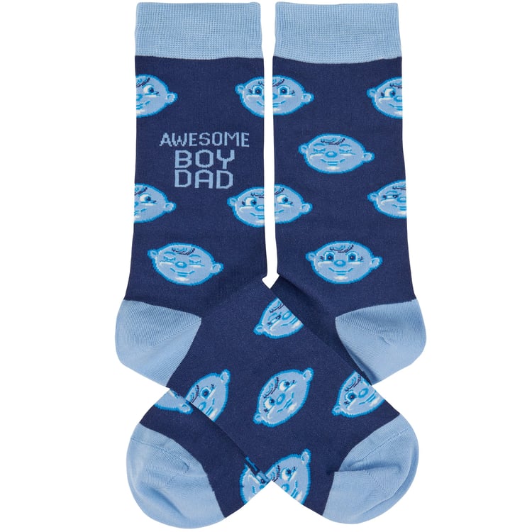 A pair of colorful socks from our Baby & Kids Collection displaying unique hand illustrated designs of different baby boy faces with a fun sentiment that reads "Awesome Boy Dad." Socks feature a one size fits most design made with cotton, nylon, and spandex. Our Awesome Boy Dad socks come with a header card and a clear plastic hanger for display. A fun dad-themed gift perfect for everyday self-expression.