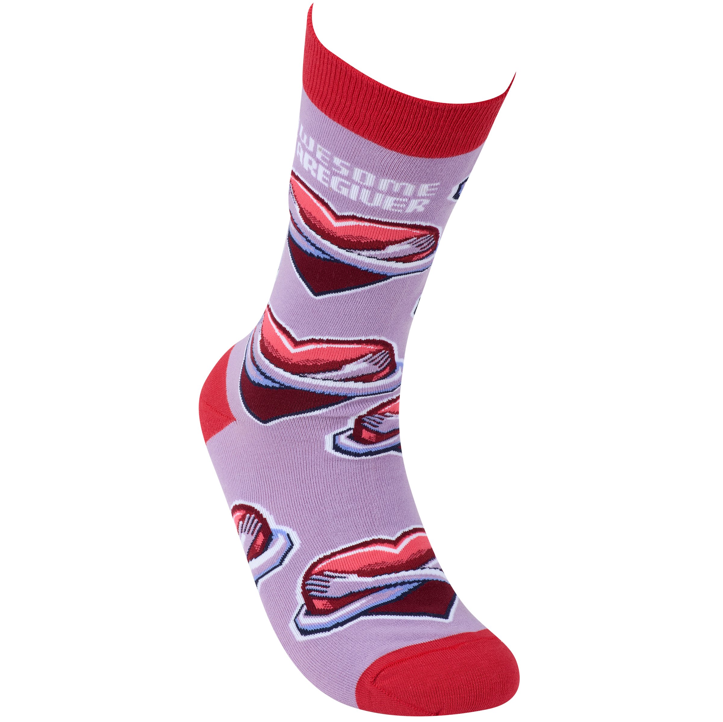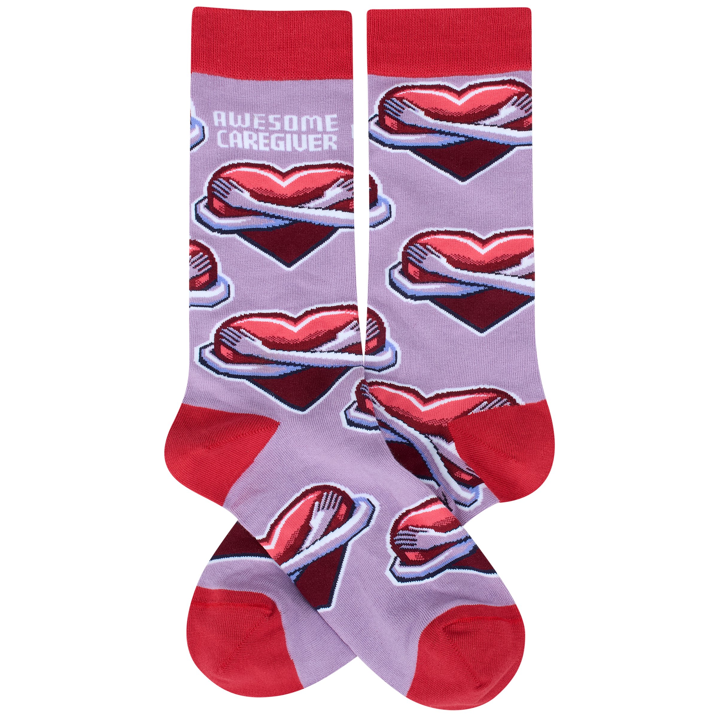 A pair of colorful socks from our LOL-Made You Smile Collection displaying playful hand illustrated designs of hearts with hugging arms and a fun caregiver inspired sentiment that reads "Awesome Caregiver." These giftable socks are made with a cotton, nylon, and spandex blend for a one size fits most design. Our Awesome Caregiver socks come with a decorative header card and a clear plastic hanger for easy rack display and gifting. A fun caregiver gift perfect for everyday self-expression.