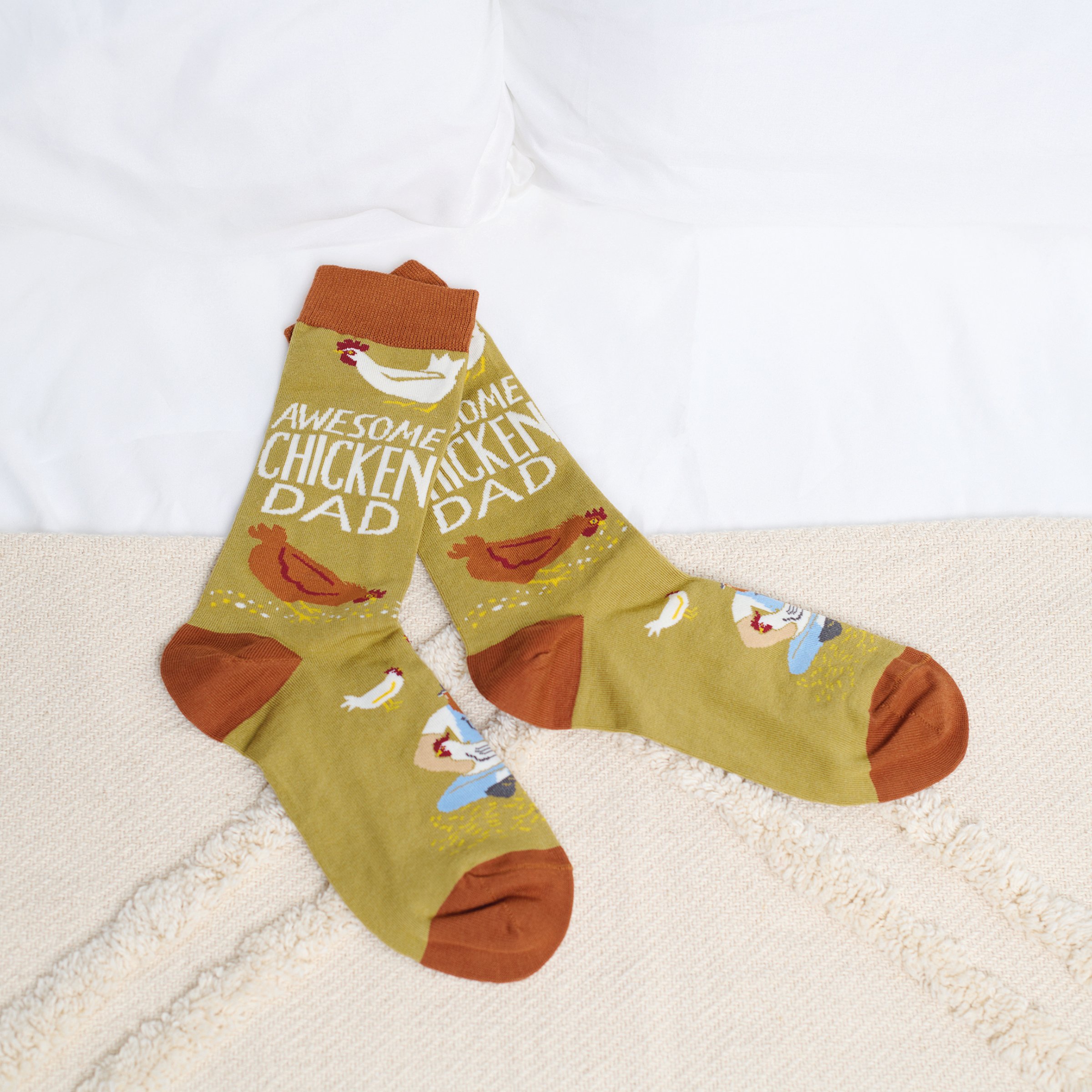 A pair of colorful woven socks from our LOL Made You Smile Collection displaying a hand illustrated design of a person caring for chickens with "Awesome Chicken Dad" sentiment. Socks feature a one size fits most design made with cotton, nylon, and spandex. Our Awesome Chicken Dad socks come with a header card and a clear plastic hanger for display. A fun everyday accessory perfect for self-expression or gifting on any occasion.