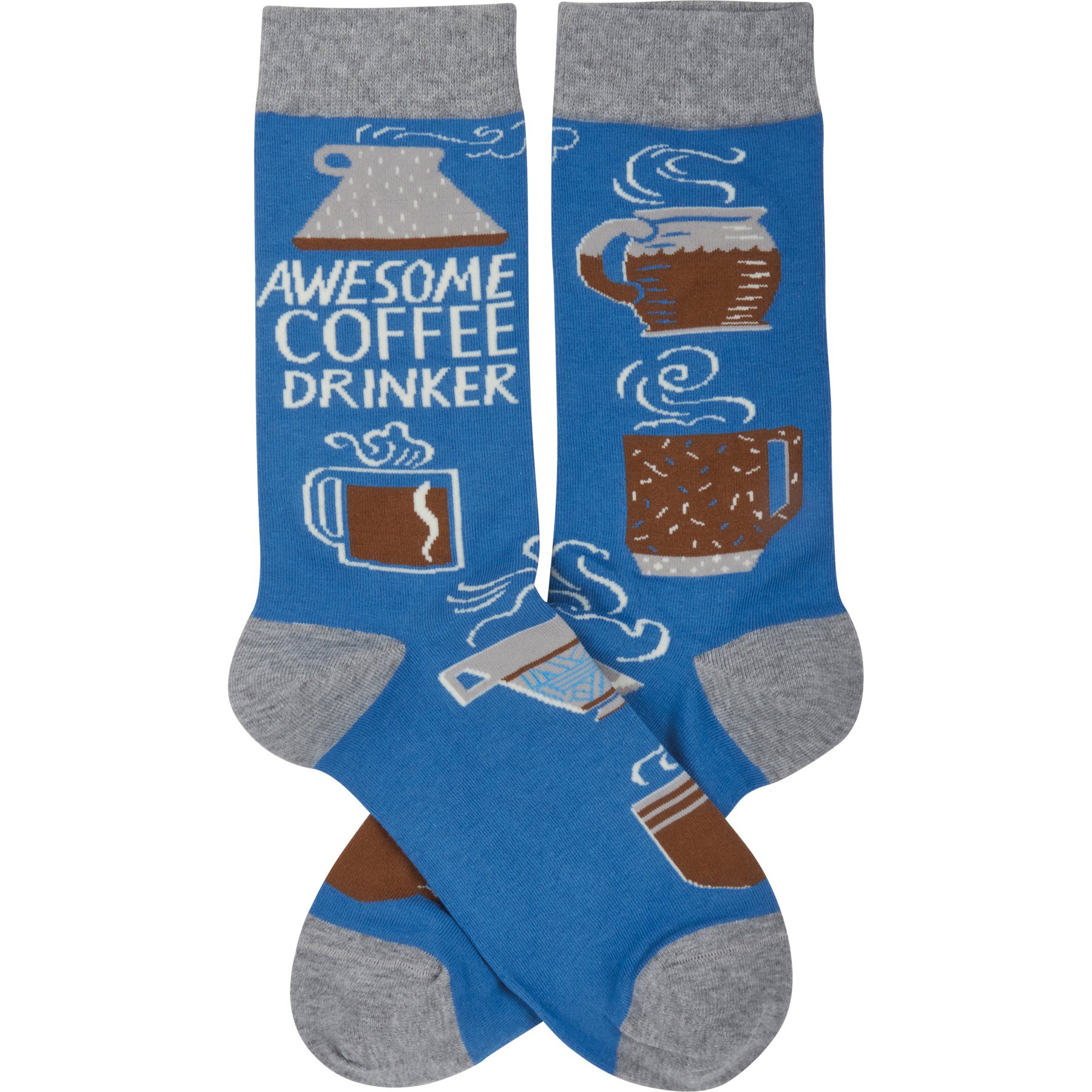 A pair of colorful woven socks from our LOL Made You Smile Collection displaying hand illustrated designs of various coffee drinks with "Awesome Coffee Drinker" sentiment. Socks feature a one size fits most design made with cotton, nylon, and spandex. Our Awesome Coffee Drinker socks come with a header card and a clear plastic hanger for display. A fun everyday accessory perfect for self-expression or gifting on any occasion.