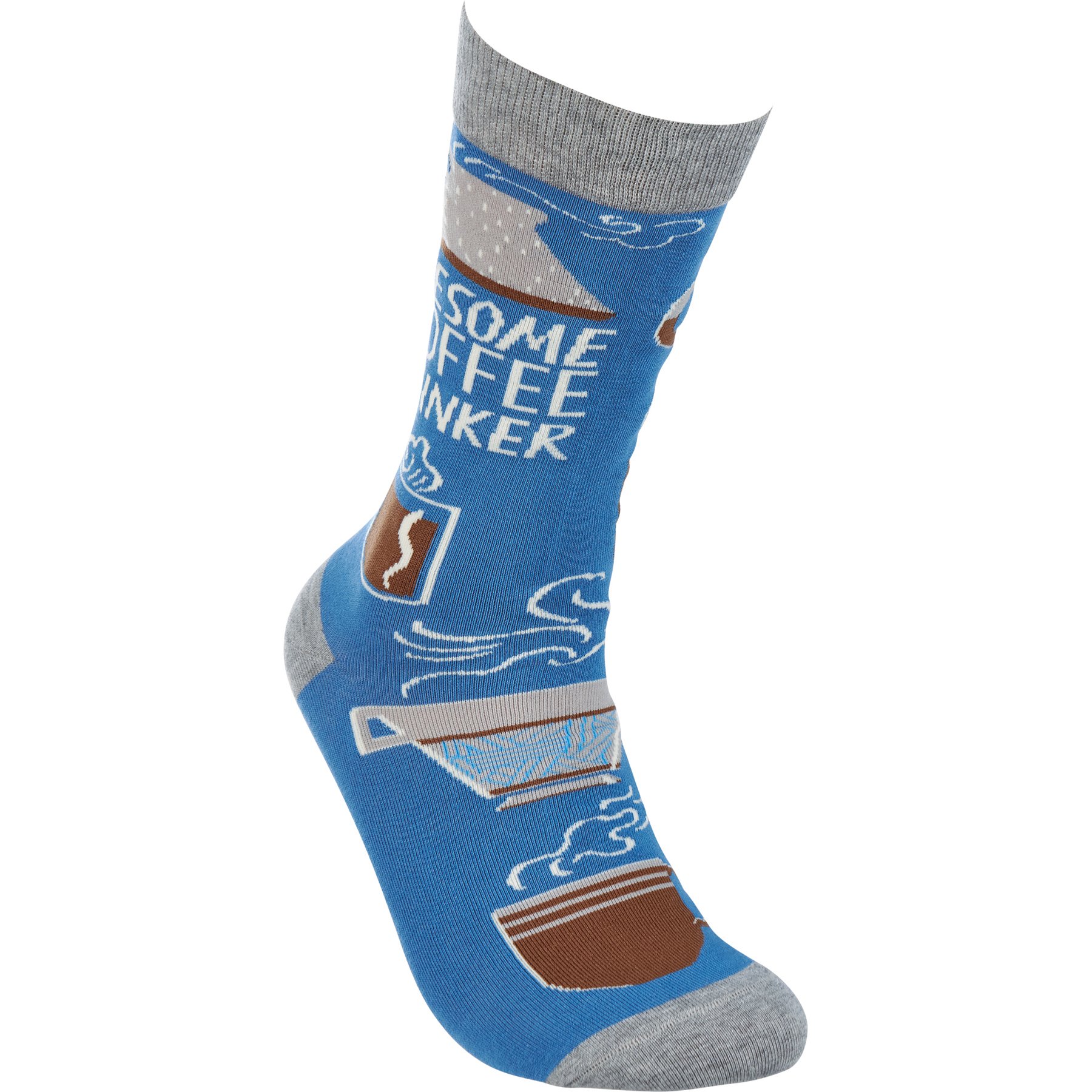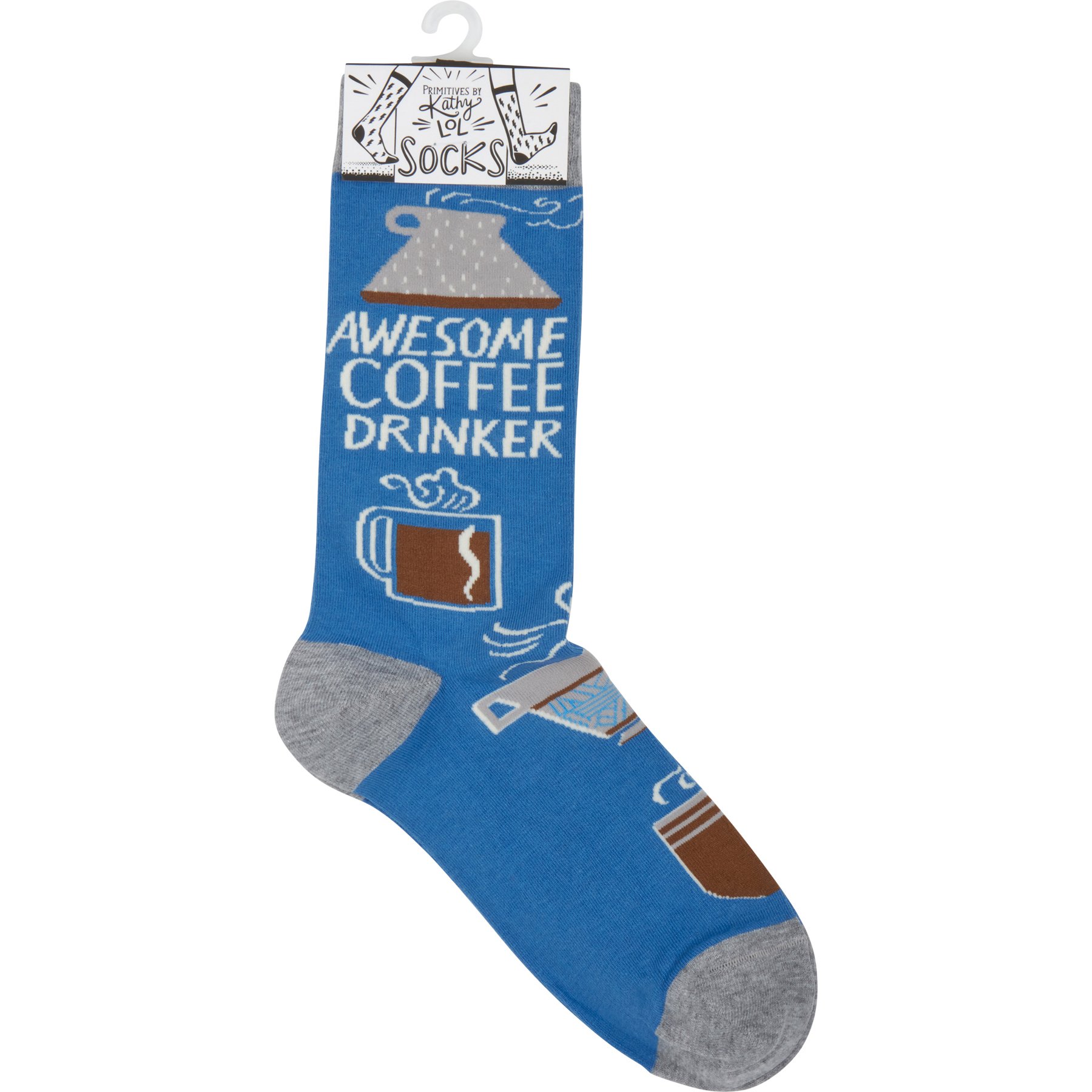 A pair of colorful woven socks from our LOL Made You Smile Collection displaying hand illustrated designs of various coffee drinks with "Awesome Coffee Drinker" sentiment. Socks feature a one size fits most design made with cotton, nylon, and spandex. Our Awesome Coffee Drinker socks come with a header card and a clear plastic hanger for display. A fun everyday accessory perfect for self-expression or gifting on any occasion.