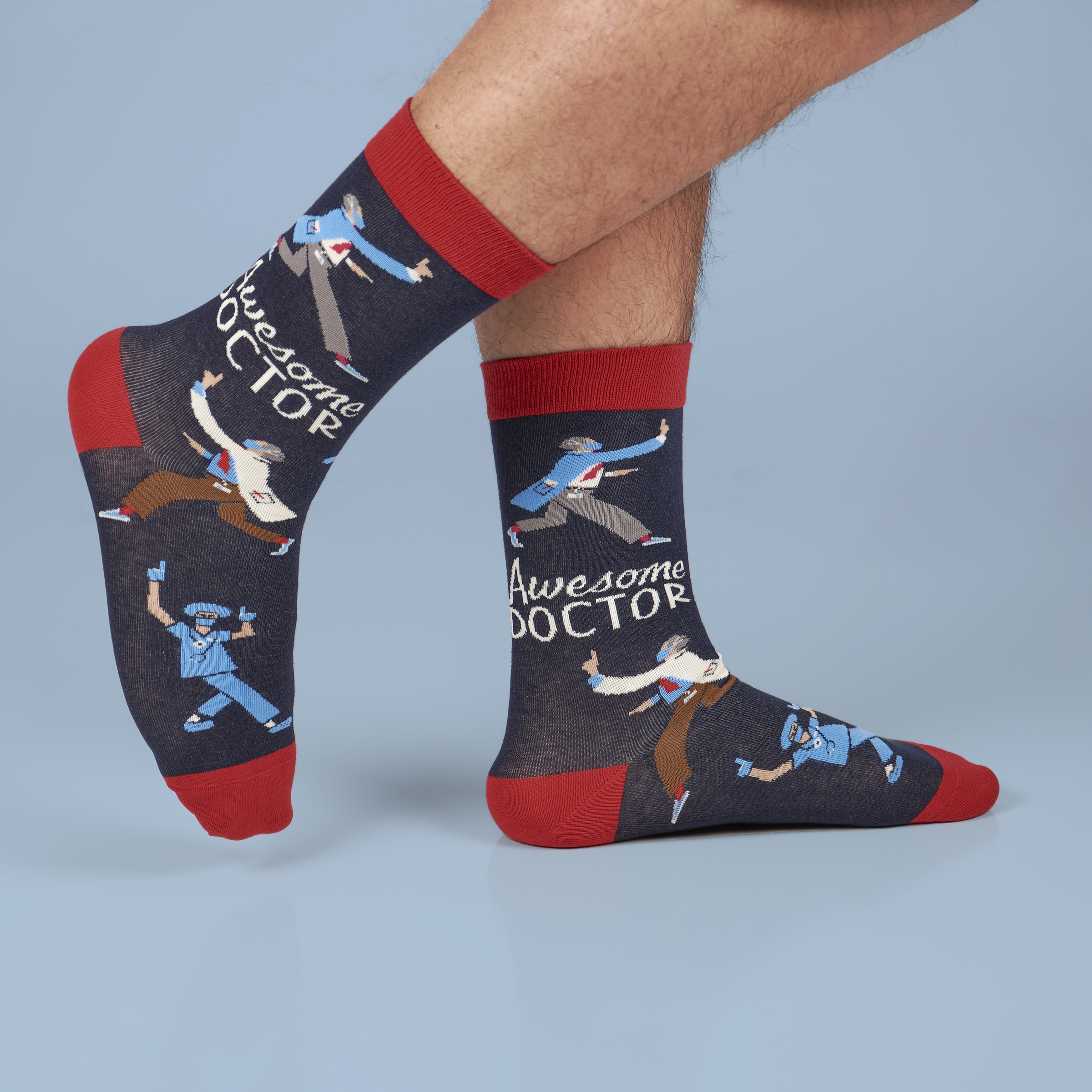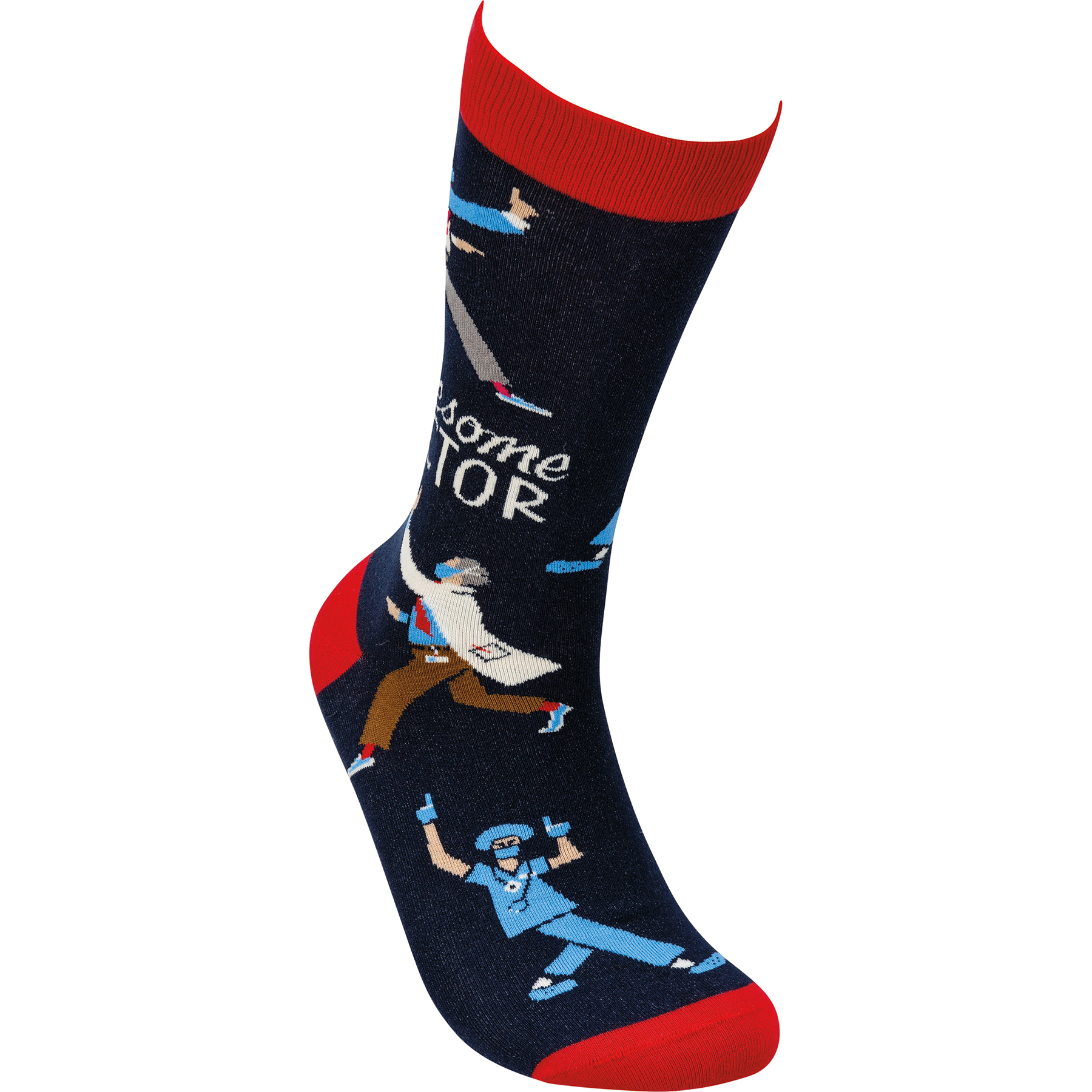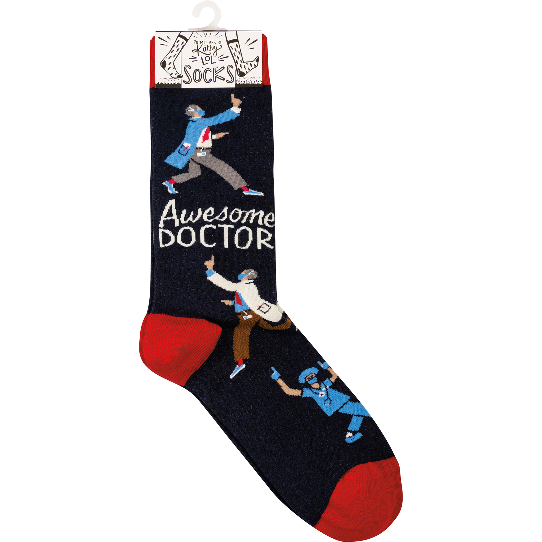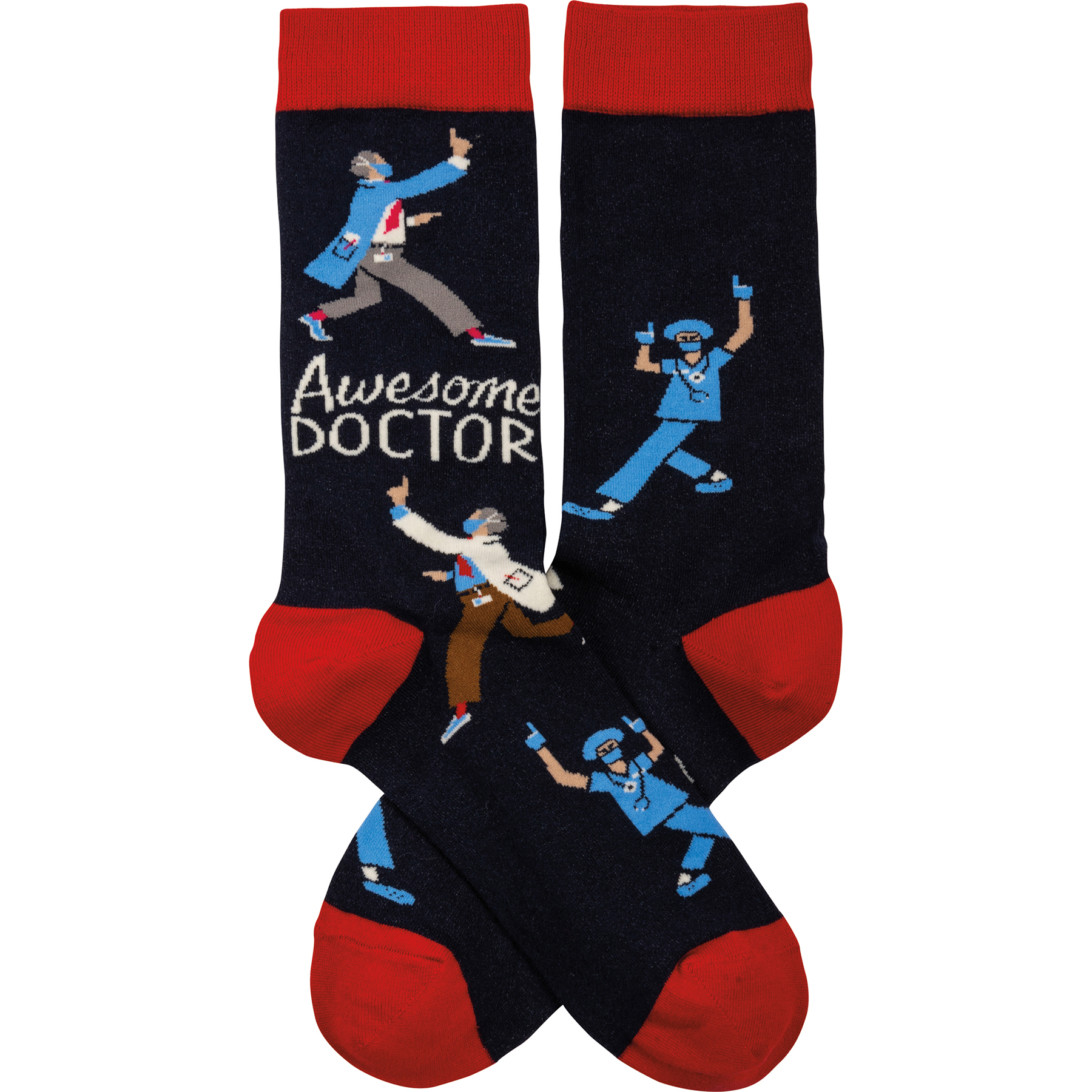 These colorful socks feature woven designs with coordinating "Awesome Doctor" sentiment. Cotton, nylon, spandex. One size fits most.