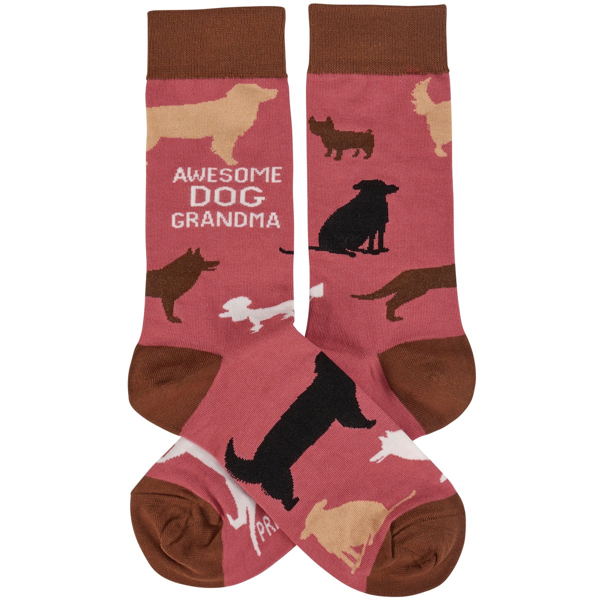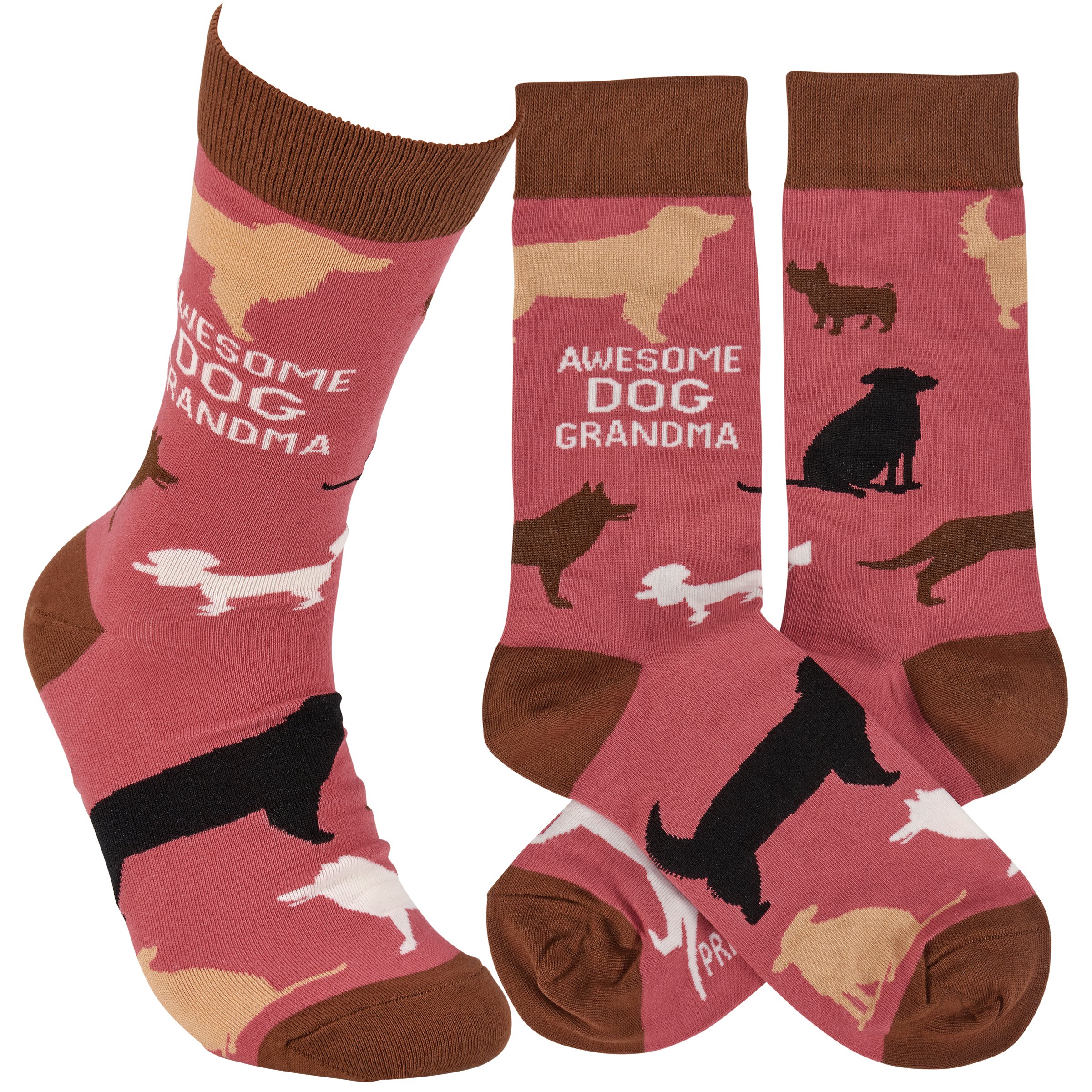 A pair of colorful socks from our Pet Collection displaying unique hand illustrated designs of different dogs with a fun sentiment that reads "Awesome Dog Grandma." Socks feature a one size fits most design made with cotton, nylon, and spandex. Our Awesome Dog Grandma socks come with a header card and a clear plastic hanger for display. A fun pet-themed gift perfect for everyday self-expression.