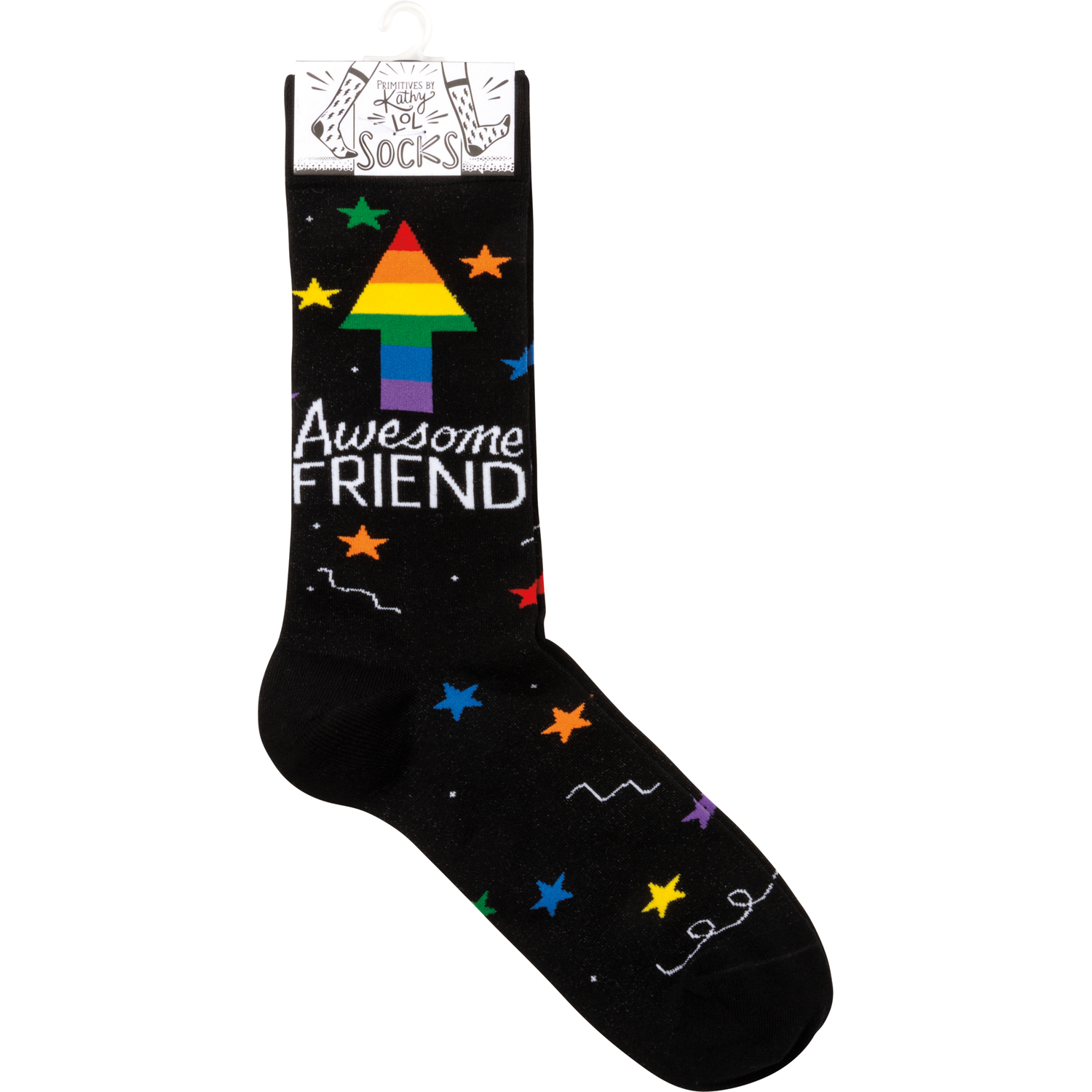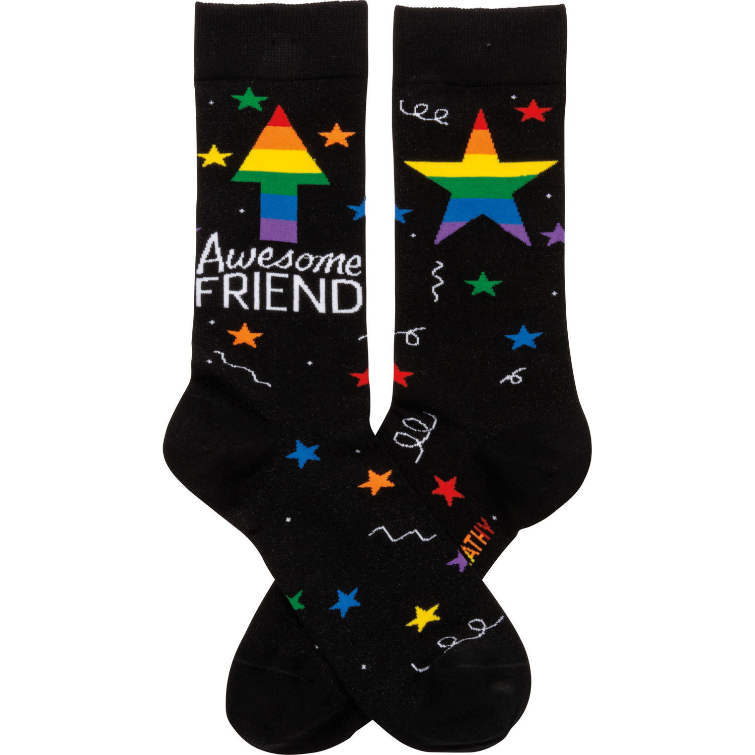 These colorful socks from our LOL Made You Smile Collection feature woven designs with coordinating "Awesome Friend" sentiment. Cotton, nylon, spandex. These awesome star friend socks are one size fits most.
