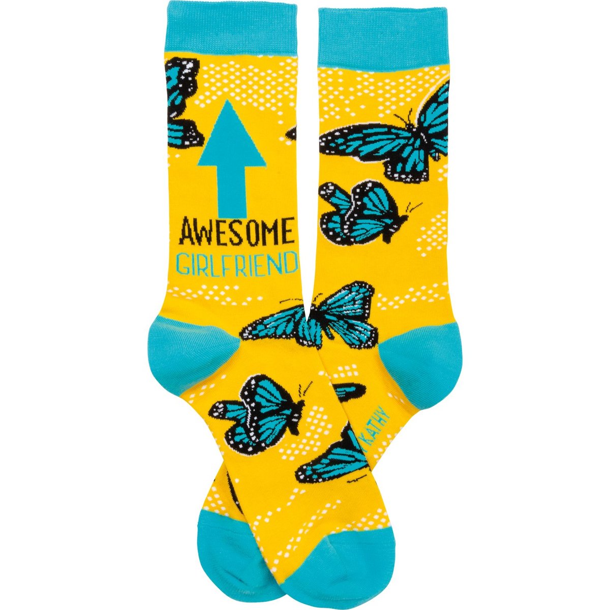 These colorful socks from our LOL Made You Smile Collection feature woven designs with coordinating "Awesome Girlfriend" sentiment. Cotton, nylon, spandex. These awesome girlfriend socks are one size fits most.