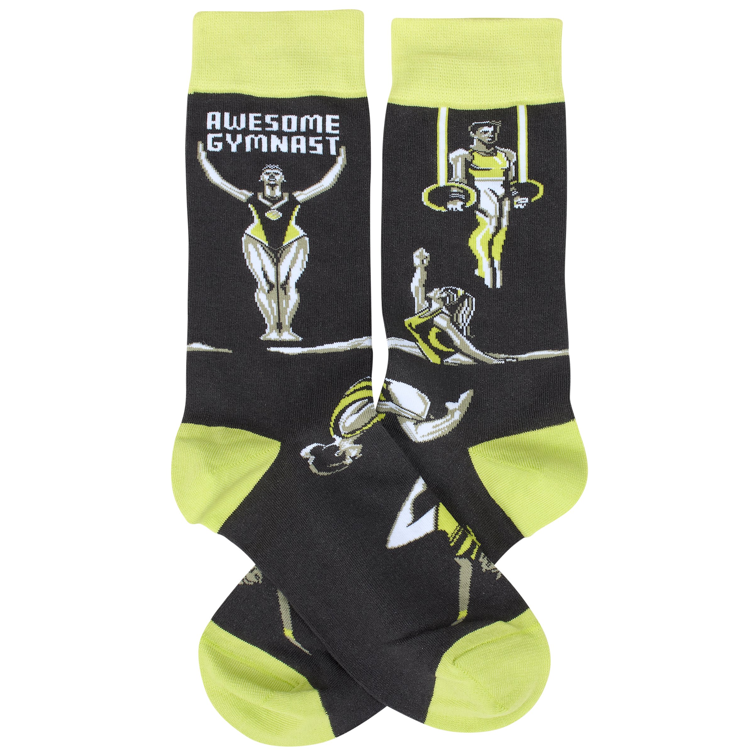 A pair of colorful socks from our LOL-Made You Smile Collection displaying a playful hand illustrated design of various gymnasts with a fun sports inspired sentiment that reads "Awesome Gymnast." These giftable socks are made with a cotton, nylon, and spandex blend for a one size fits most design. Our Awesome Gymnast socks come with a decorative header card and a clear plastic hanger for easy rack display and gifting. A fun gift for gymnasts perfect for everyday self-expression.