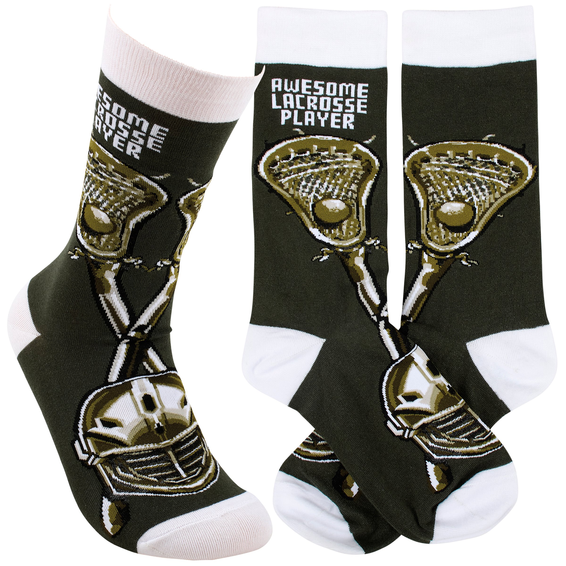 A pair of colorful socks from our LOL-Made You Smile Collection displaying a playful hand illustrated design of lacrosse gear with a fun sports inspired sentiment that reads "Awesome Lacrosse Player." These giftable socks are made with a cotton, nylon, and spandex blend for a one size fits most design. Our Awesome Lacrosse Player socks come with a decorative header card and a clear plastic hanger for easy rack display and gifting. A fun gift for lacrosse players perfect for everyday self-expression.