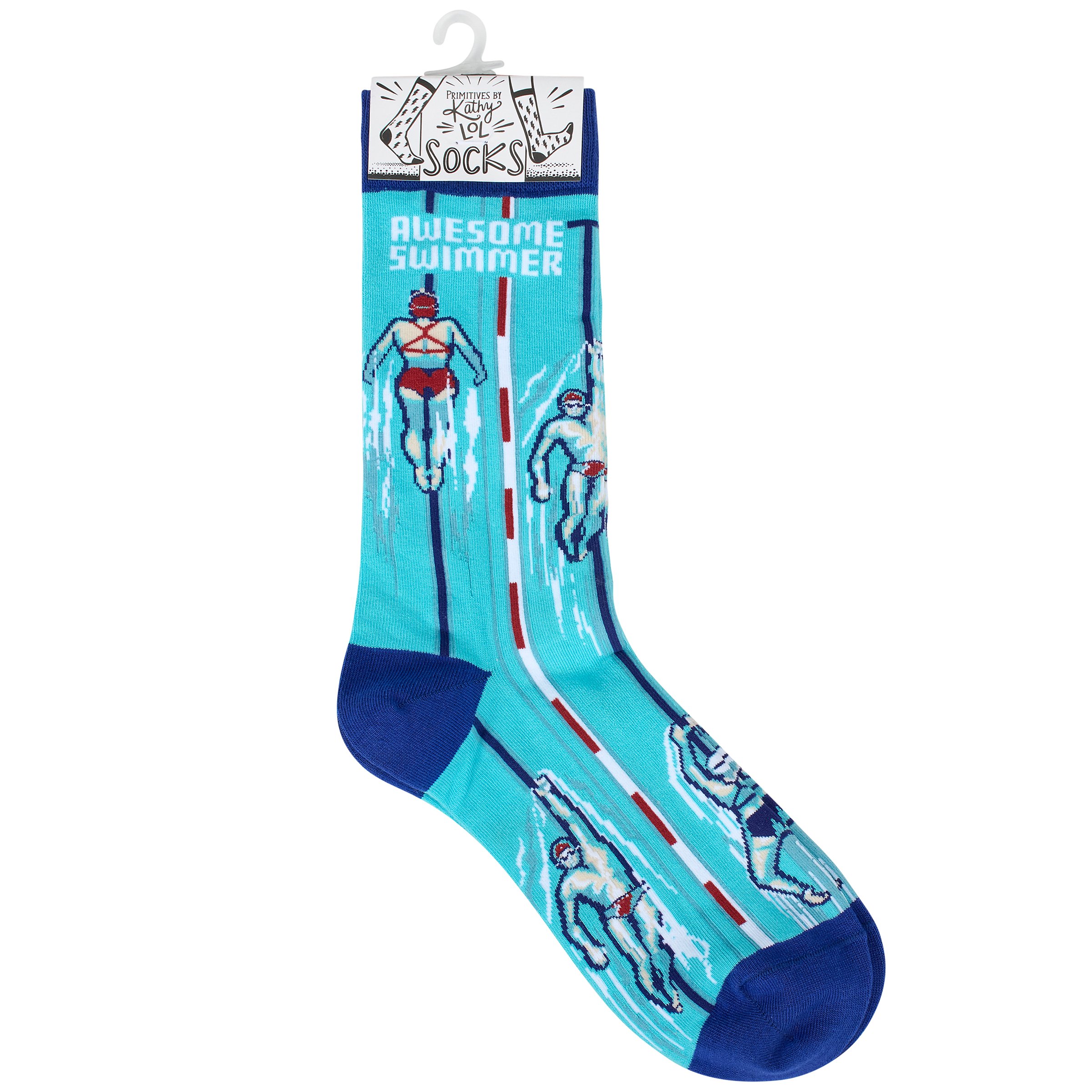 A pair of colorful socks from our LOL-Made You Smile Collection displaying a playful hand illustrated design of various swimmers in a pool with a fun sports inspired sentiment that reads "Awesome Swimmer." These giftable socks are made with a cotton, nylon, and spandex blend for a one size fits most design. Our Awesome Swimmer socks come with a decorative header card and a clear plastic hanger for easy rack display and gifting. A fun gift for swimmers perfect for everyday self-expression.