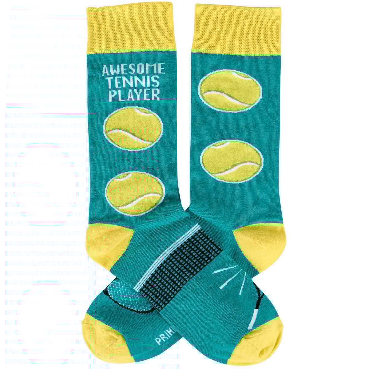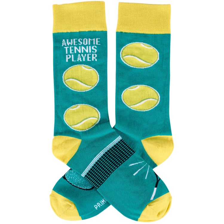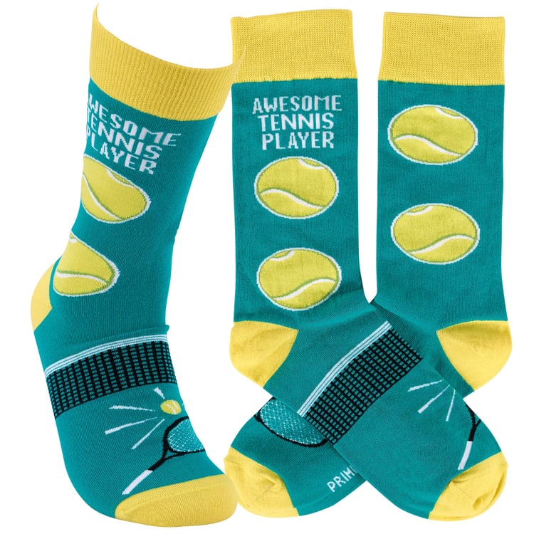 A pair of colorful socks from our LOL-Made You Smile Collection displaying playful hand illustrated designs of tennis balls and tennis racket with a fun sports inspired sentiment that reads "Awesome Tennis Player." These giftable socks are made with a cotton, nylon, and spandex blend for a one size fits most design. Our Awesome Tennis Player socks come with a decorative header card and a clear plastic hanger for easy rack display and gifting. A fun tennis-themed gift perfect for everyday self-expression.