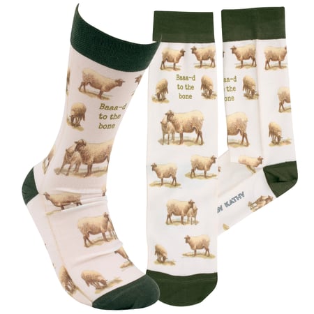 A pair of fun socks from our Farmhouse Collection displaying an all-over design of vintage sheep art with a funny farm animal pun on the front that reads "Baaa-d To The Bone" as well as green color accents on the cuff, heel, and toe. These giftable socks are made with a spandex blend for a one size fits most design. Our Baaa-d To The Bone socks come with a decorative header card and a clear plastic hanger for easy rack display and gifting. A fun farm themed gift perfect for everyday self-expression.