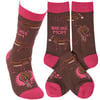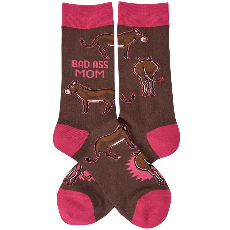 A pair of colorful socks from our Mother's Day Collection displaying playful hand illustrated designs of donkeys with a fun mom-themed sentiment that reads "Bad Ass Mom." These giftable socks are made with a cotton, nylon, and spandex blend for a one size fits most design. Our Bad Ass Mom socks come with a decorative header card and a clear plastic hanger for easy rack display and gifting. A fun mother's day gift perfect for everyday self-expression.