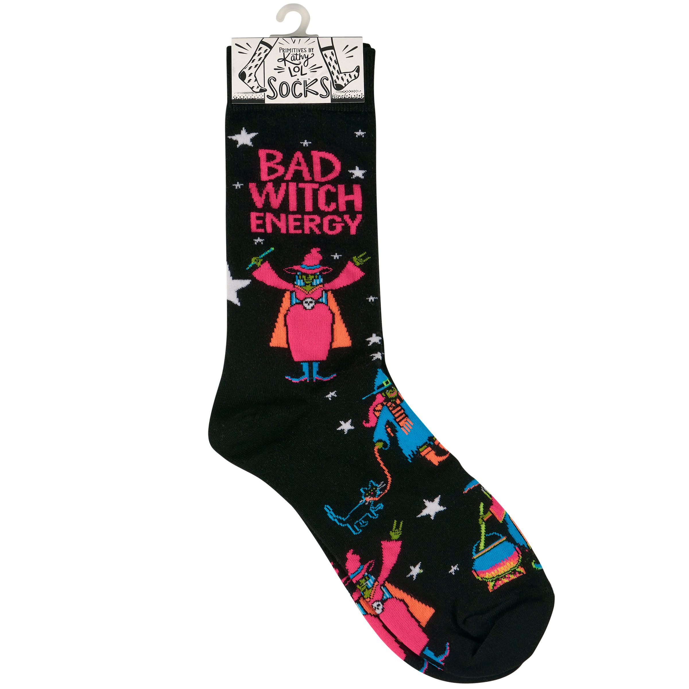 A pair of colorful socks from our Halloween Collection displaying unique hand illustrated designs of witches in a fun neon color palette with a funny witch-themed sentiment that reads "Bad Witch Energy." Seasonal socks feature a one size fits most design made with cotton, nylon, and spandex. Our Bad Witch Energy socks come with a header card and a clear plastic hanger for display. A fun Halloween-themed gift perfect for seasonal self-expression.
