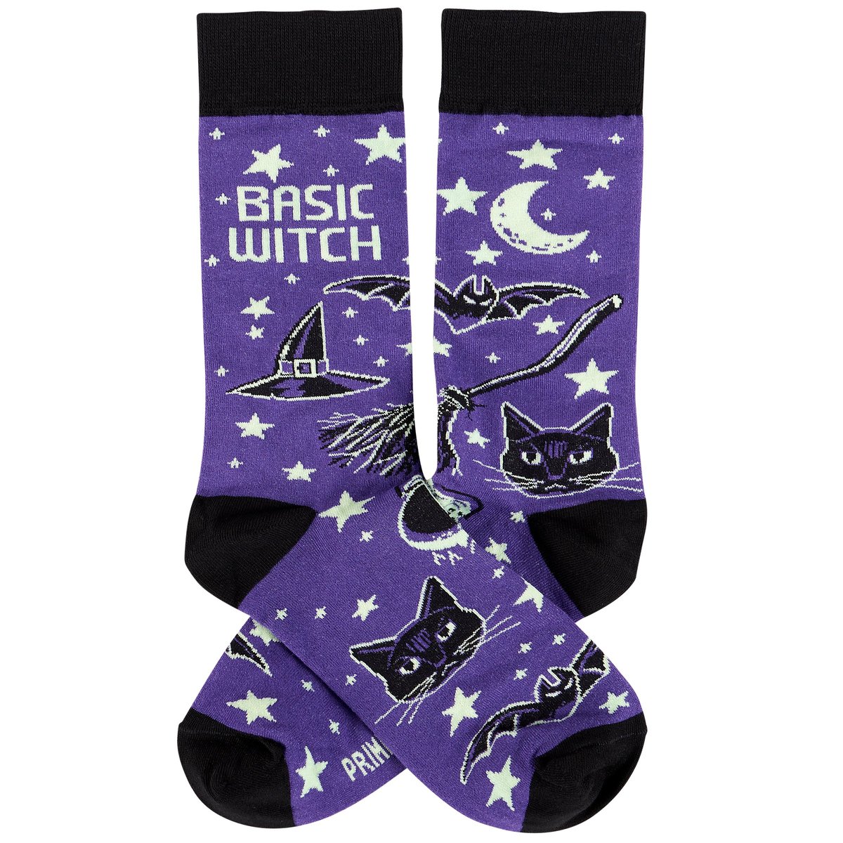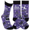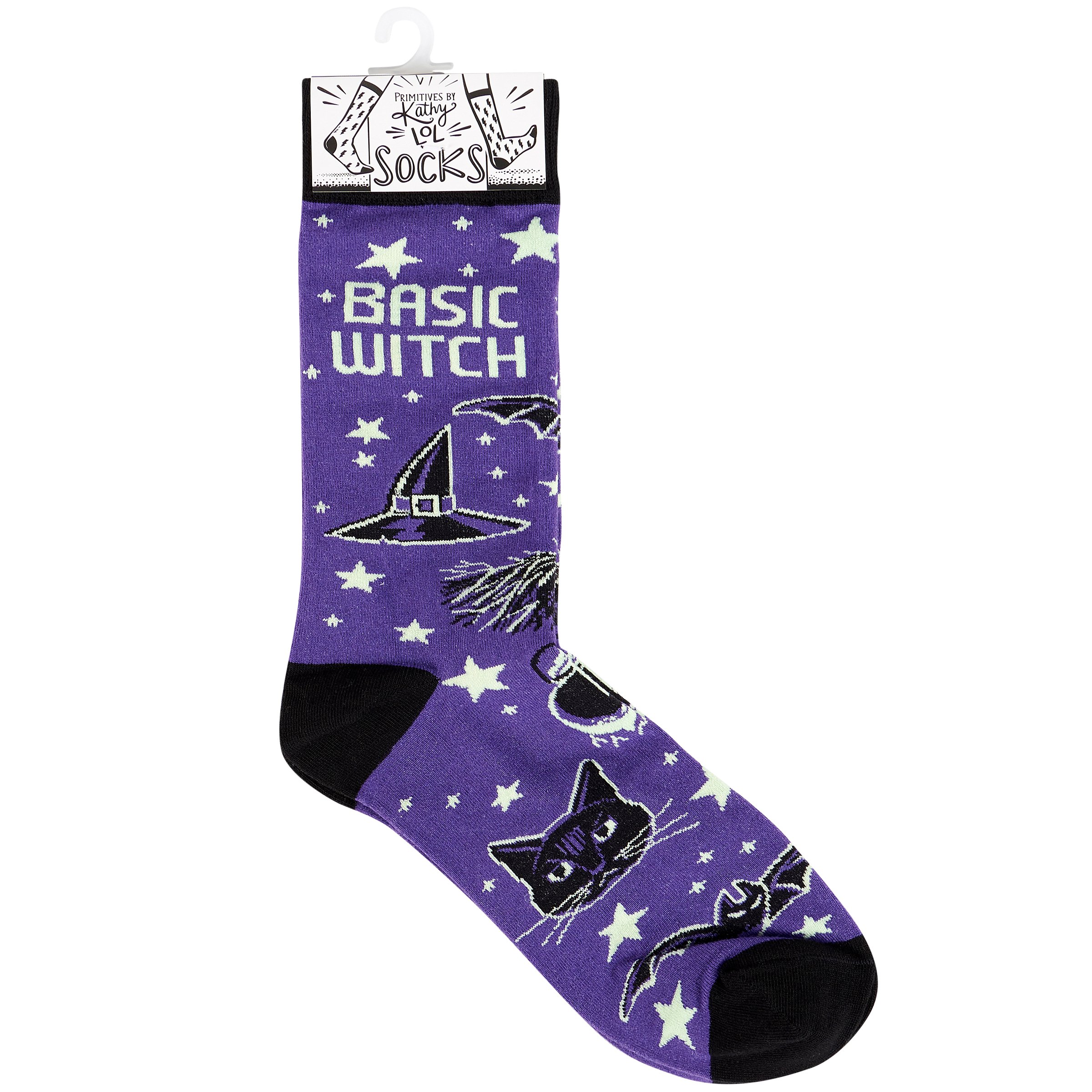 A pair of colorful socks from our Halloween Collection displaying playful hand illustrated designs of Halloween motifs including witch items with a humorous seasonal sentiment that reads "Basic Witch." These giftable socks are made with a cotton, nylon, and spandex blend for a one size fits most design. Our Basic Witch socks come with a decorative header card and a clear plastic hanger for easy rack display and gifting. A funny Halloween-themed gift perfect for seasonal self-expression.