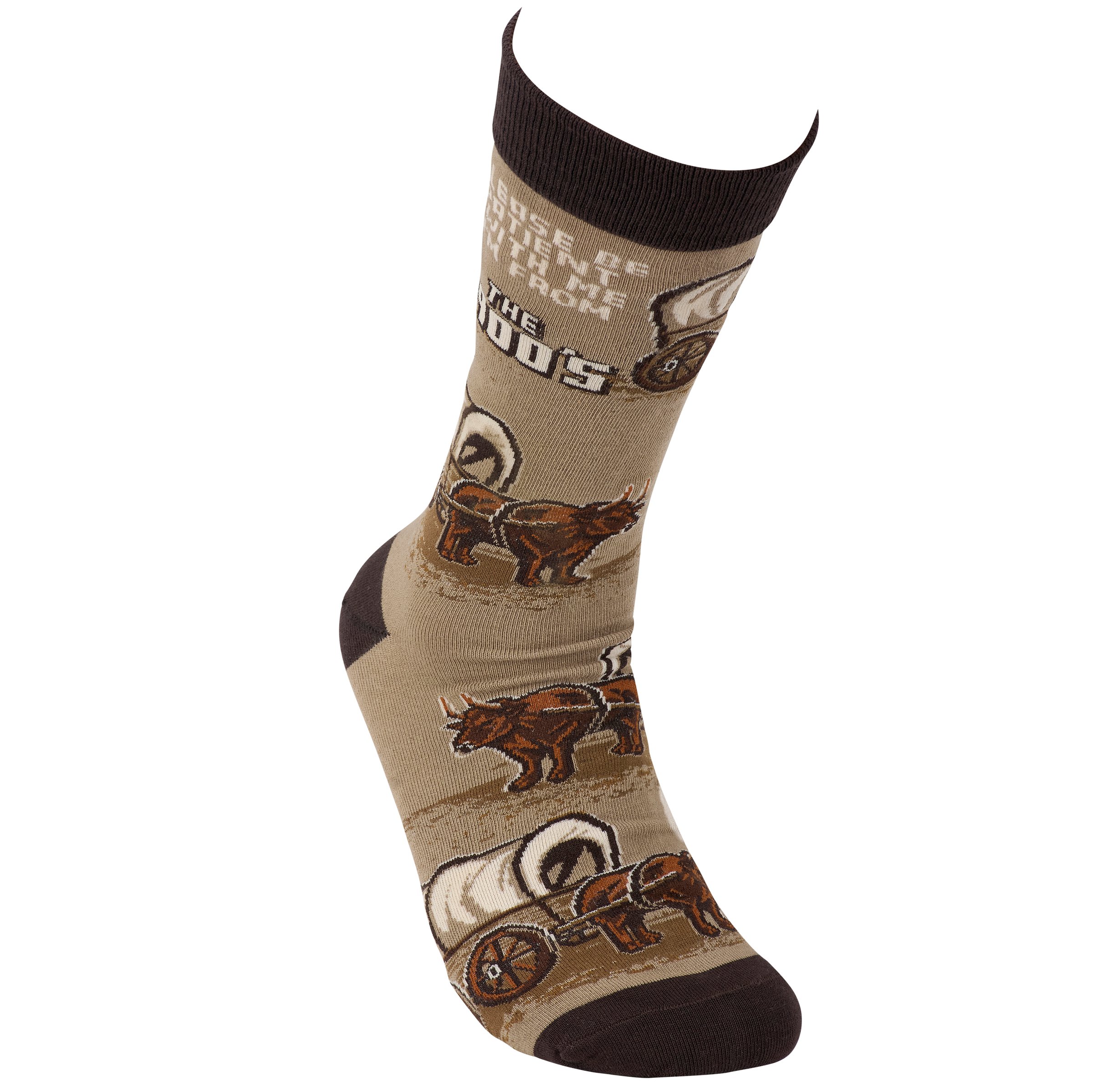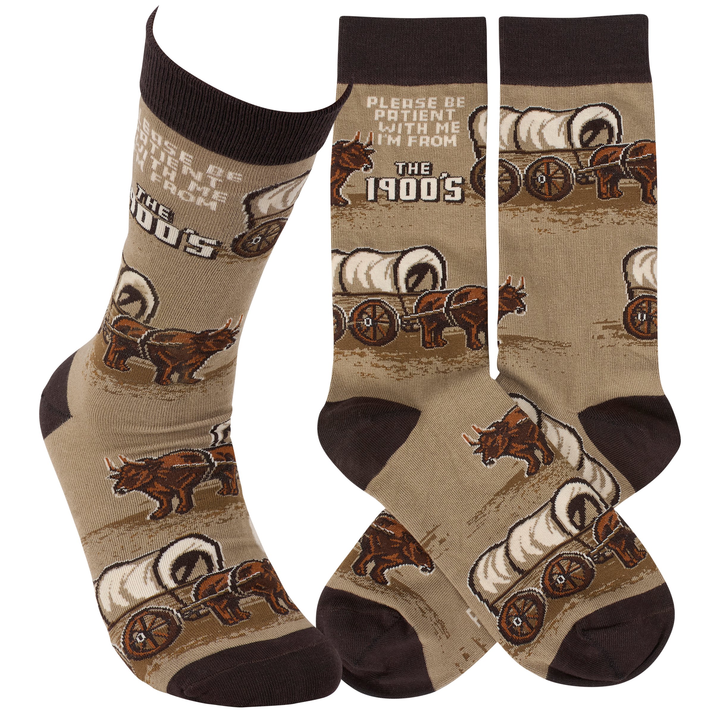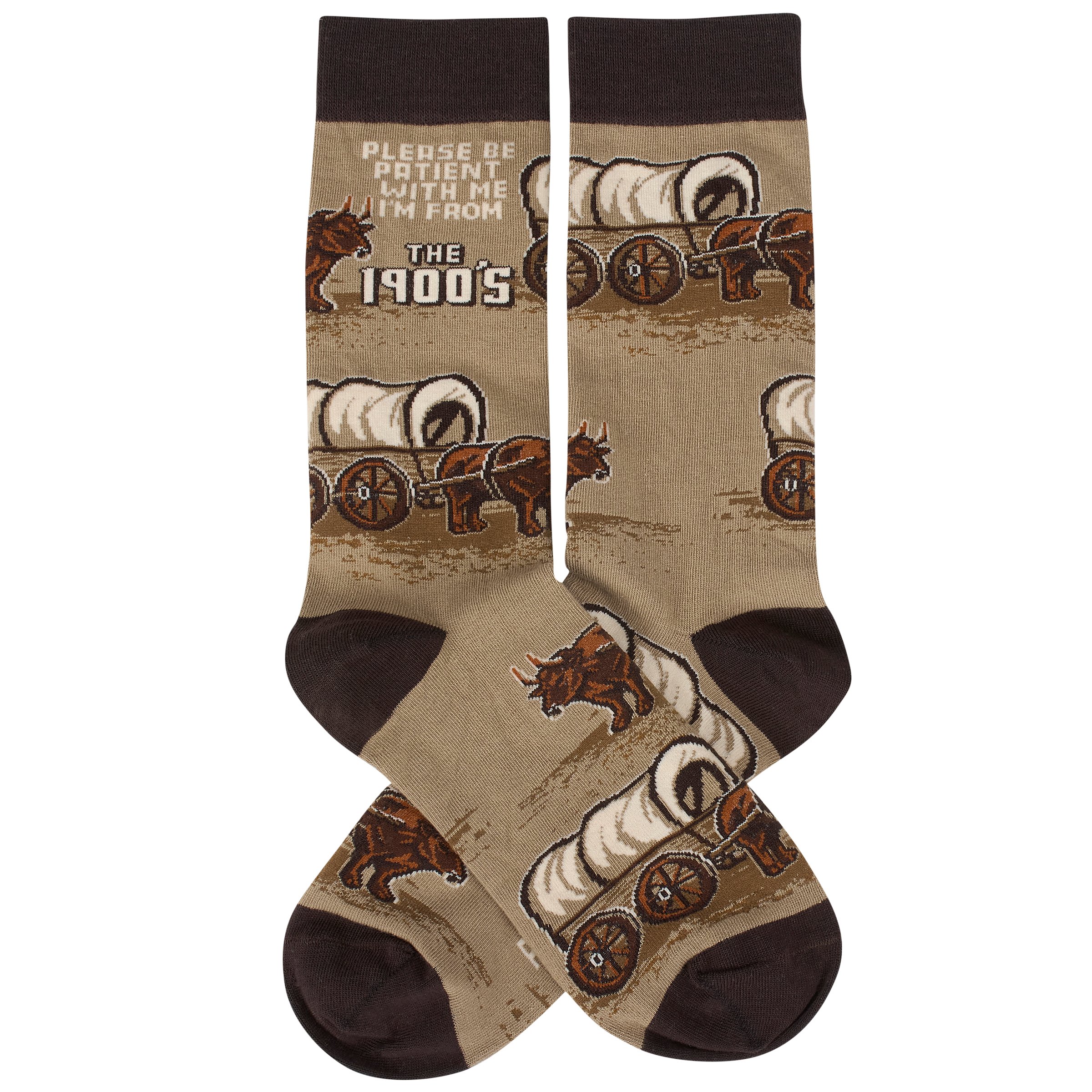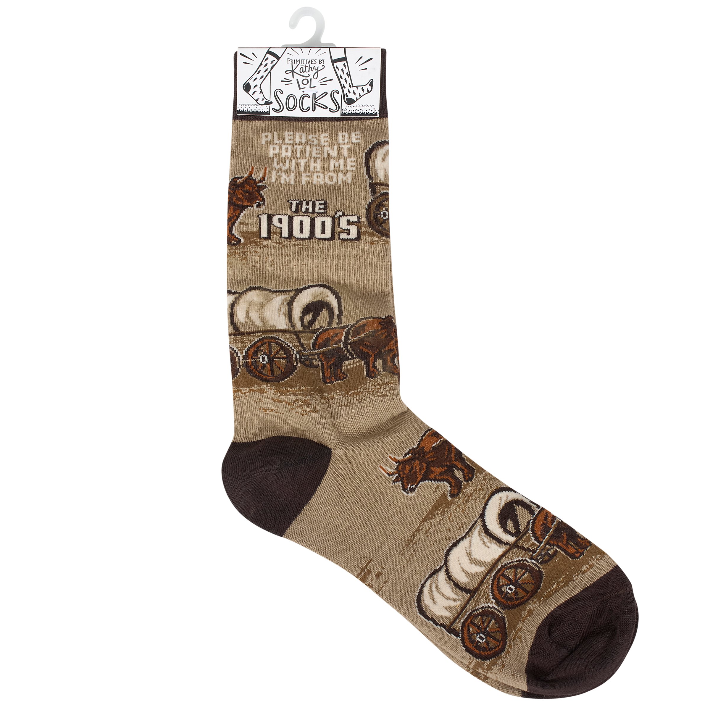 A pair of colorful socks from our LOL-Made You Smile Collection displaying a playful hand illustrated design of covered wagons and oxen with a funny sentiment that reads "Please Be Patient With Me - I'm From The 1900's." These giftable socks are made with a cotton, nylon, and spandex blend for a one size fits most design. Our Be Patient I'm From The 1900's socks come with a decorative header card and a clear plastic hanger for easy rack display and gifting. A fun gift perfect for everyday self-expression.