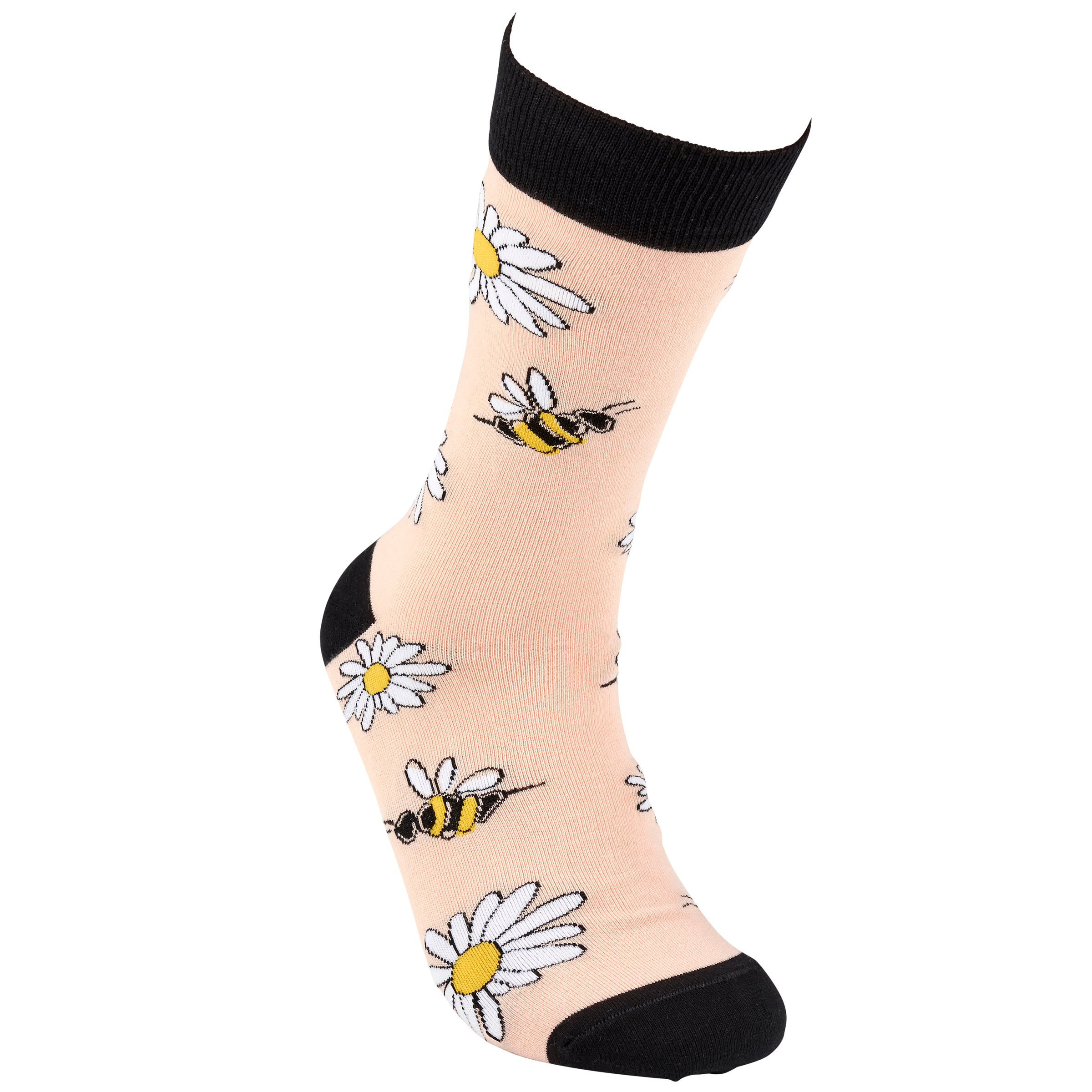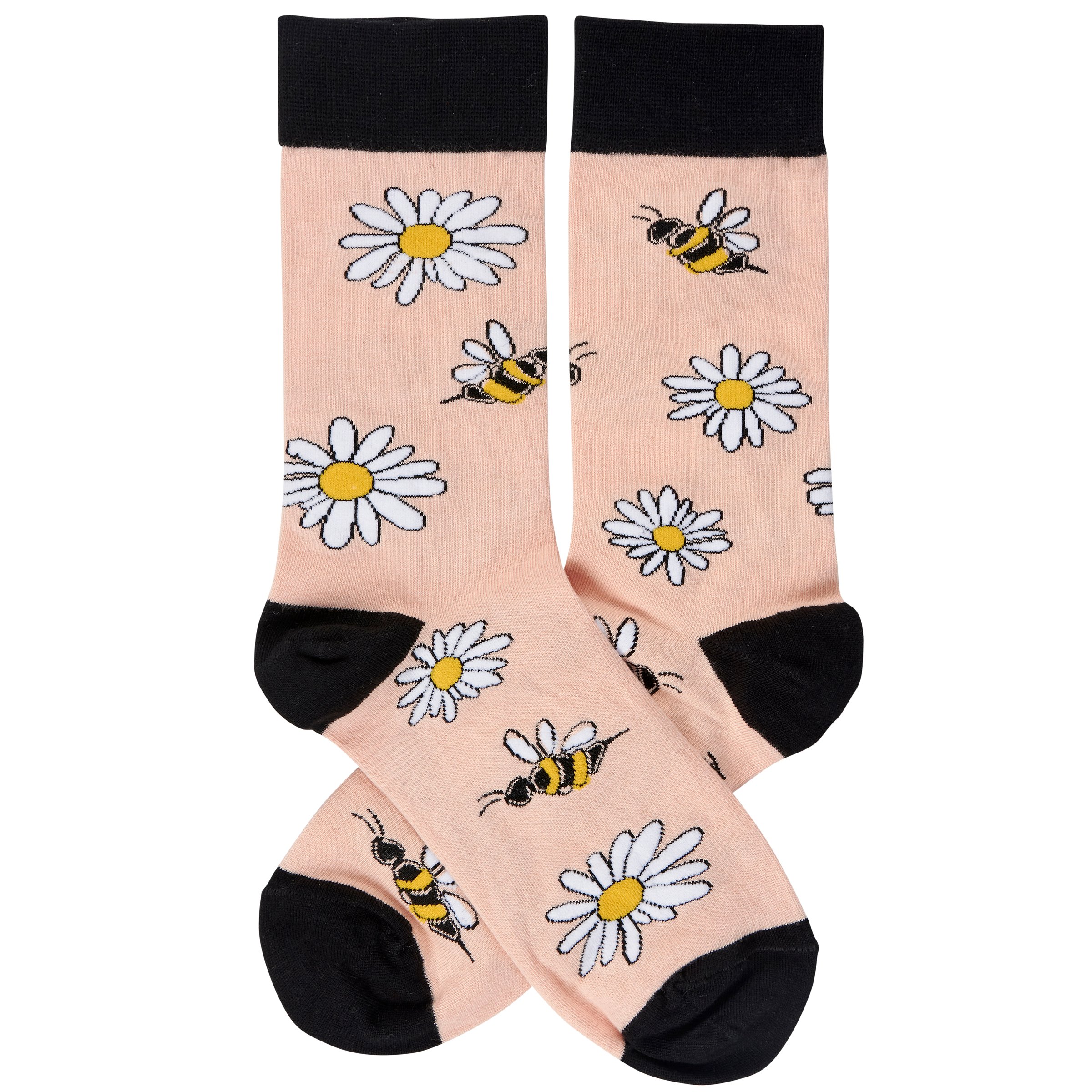 A pair of colorful socks from our Garden Collection displaying hand illustrated designs of bees and daisies on light pink background. Socks feature a one size fits most design made with cotton, nylon, and spandex. Our Bees & Daisies socks come with a header card and a clear plastic hanger for display. A charming garden-themed gift perfect for everyday self-expression.