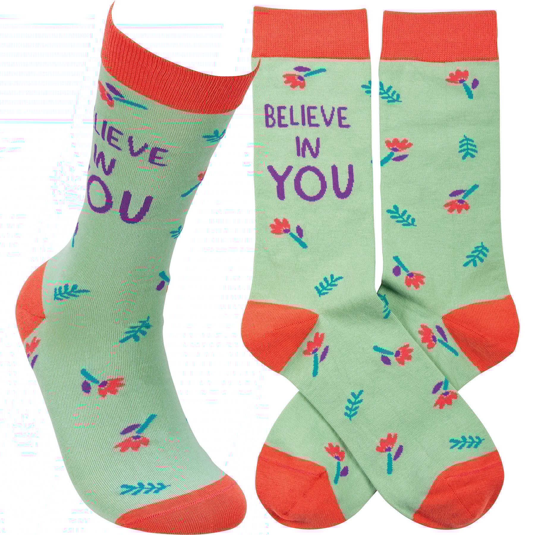 These colorful socks feature woven floral designs with coordinating "Believe In You" sentiment. Cotton, nylon, spandex. One size fits most.