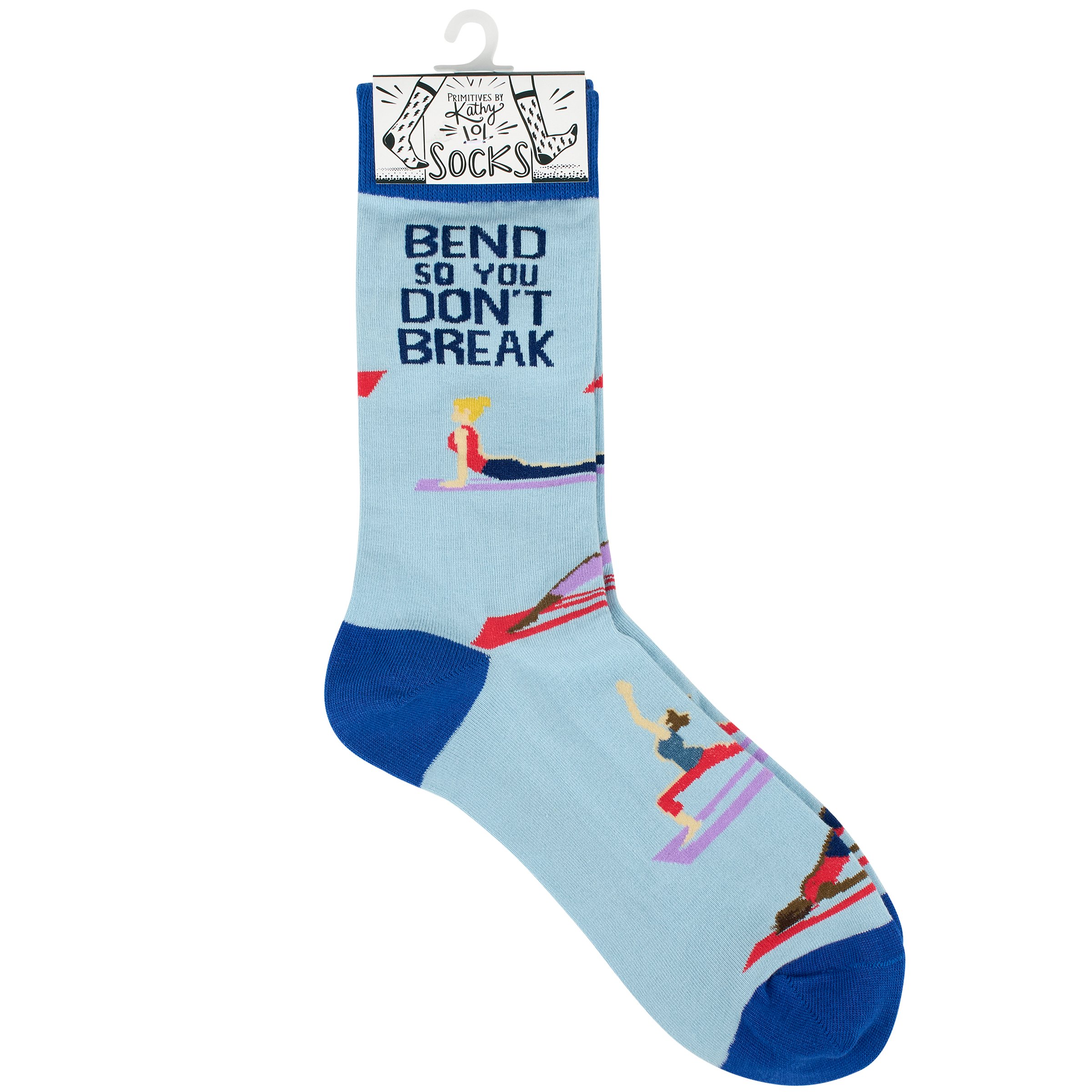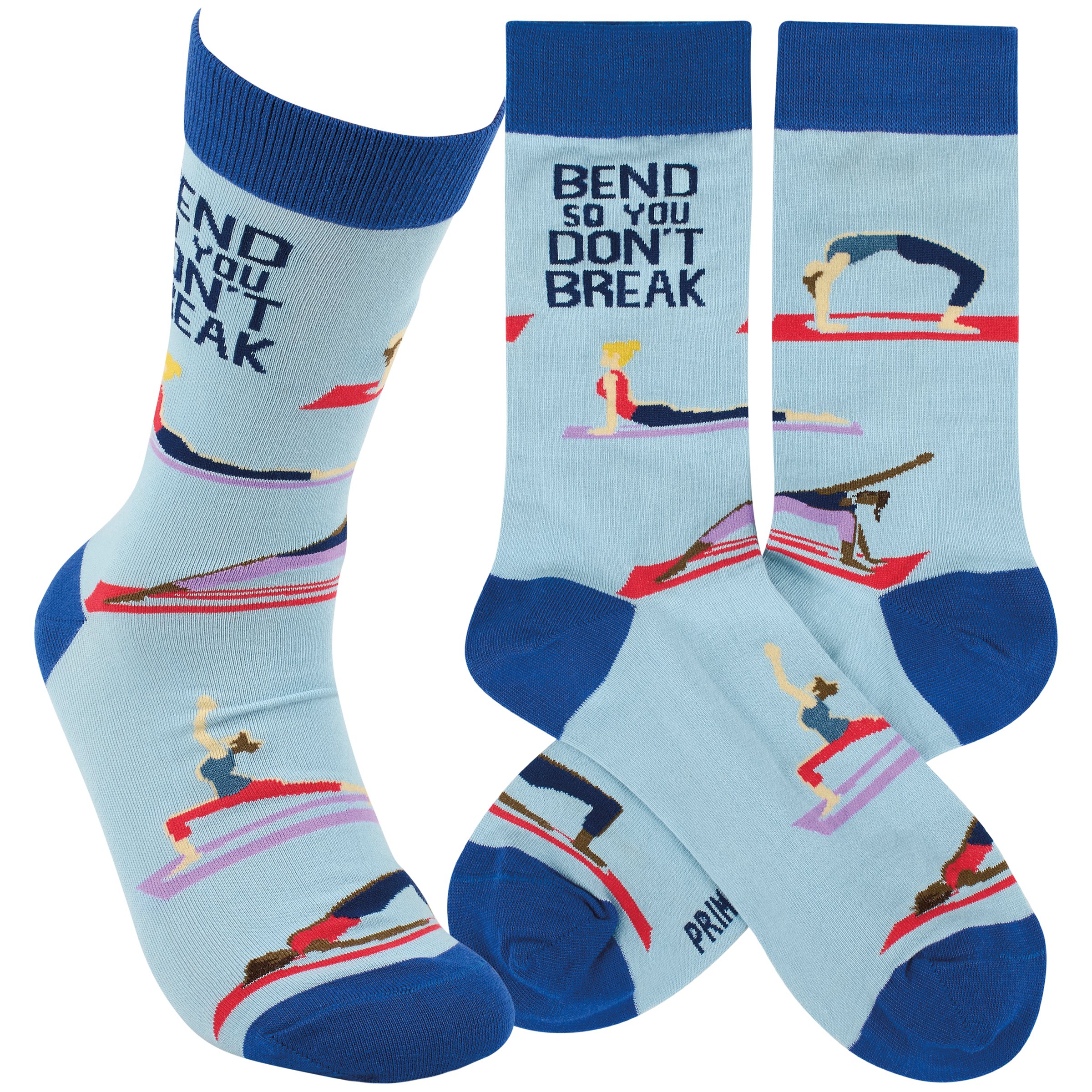 A pair of colorful socks from our LOL-Made You Smile Collection displaying a playful hand illustrated design of various people in yoga poses with a funny sentiment that reads "Bend So You Don't Break." These giftable socks are made with a cotton, nylon, and spandex blend for a one size fits most design. Our Bend So You Don't Break socks come with a decorative header card and a clear plastic hanger for easy rack display and gifting. A fun yoga gift perfect for everyday self-expression.