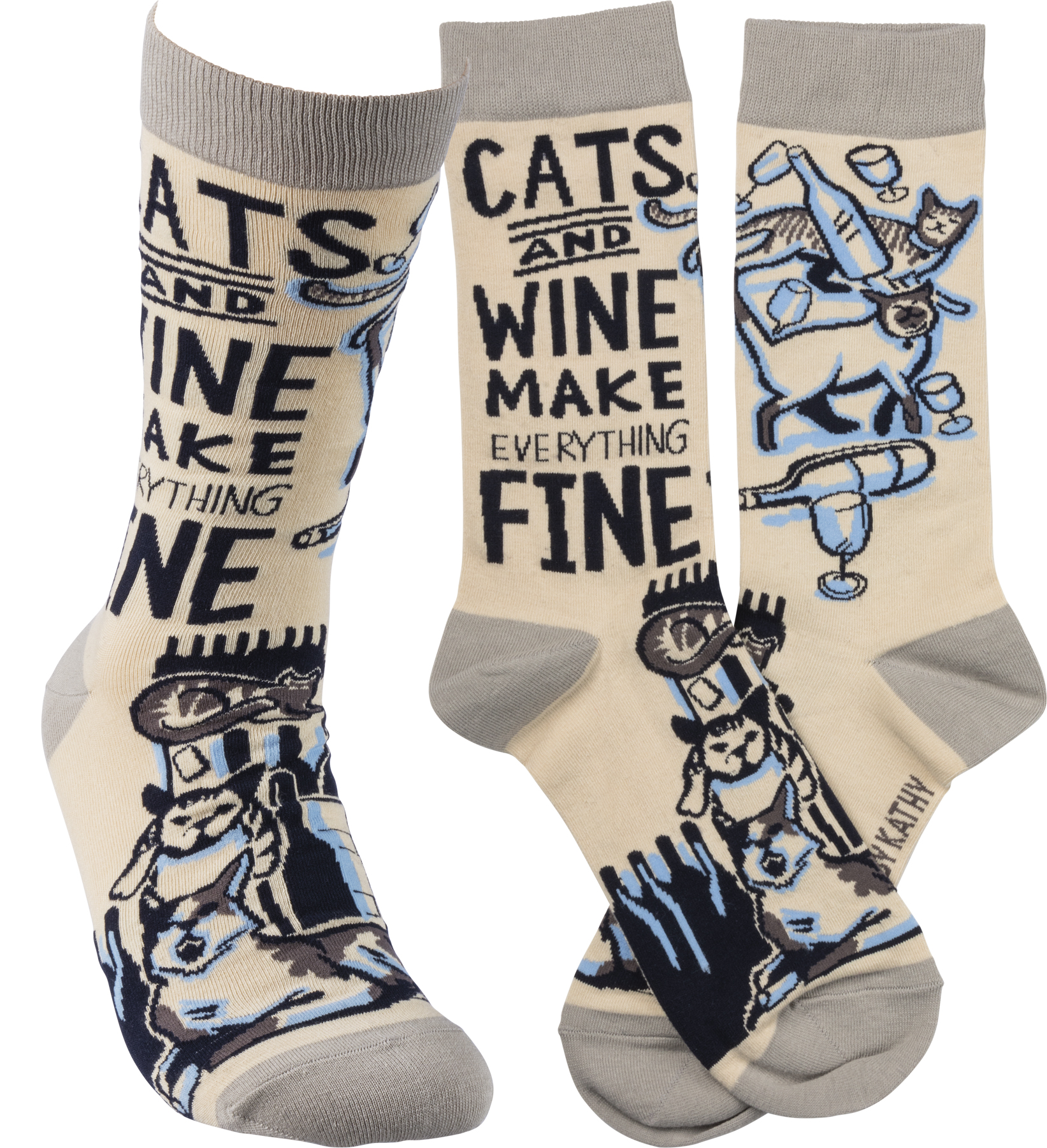 These colorful socks from our best-selling Pet Collection feature woven designs with coordinating "Cats And Wine Make Everything Fine" sentiment. Cotton, nylon, spandex. Our Cats And Wine Make Everything Fine socks are one size fits most.