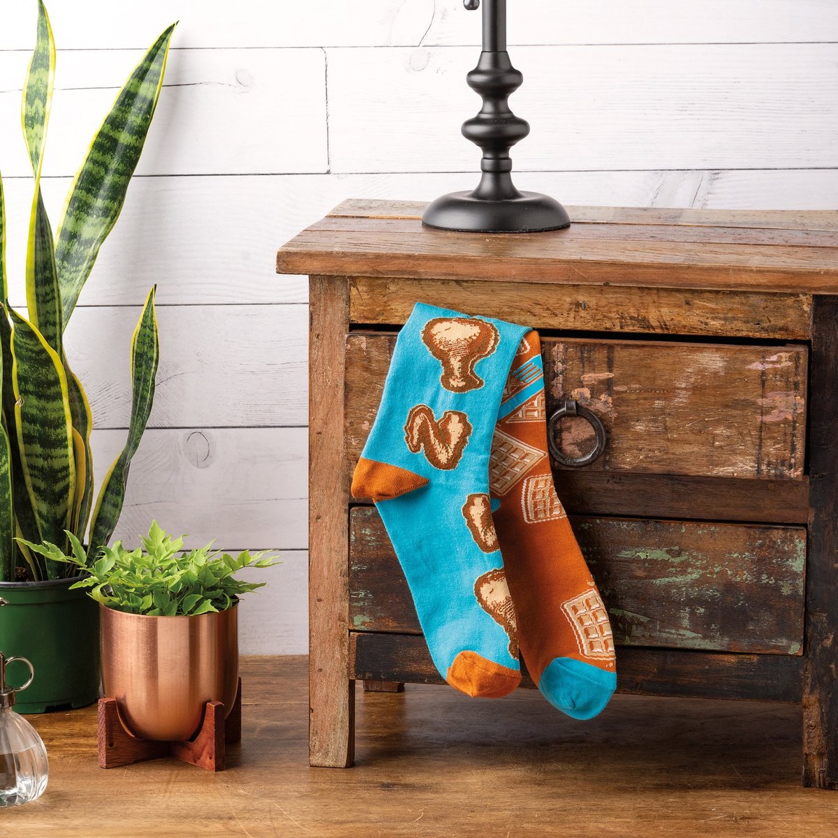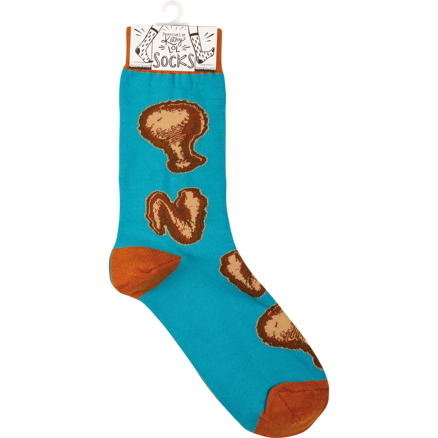 These mismatched socks from our LOL Made You Smile Collection feature woven Chicken & Waffles designs, one on each sock. Cotton, nylon, spandex. These chicken and waffle socks are one size fits most.