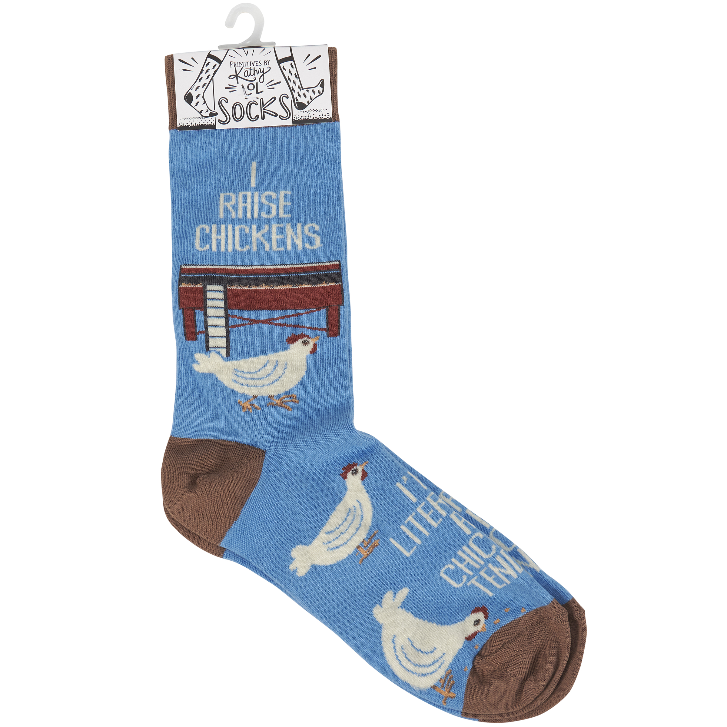 A pair of colorful socks from our Homestead Collection displaying unique hand illustrated designs of a farmer and chickens with a fun sentiment that reads "I Raise Chickens - I'm Literally A Chicken Tender." Socks feature a one size fits most design made with cotton, nylon, and spandex. Our Chicken Tender socks come with a header card and a clear plastic hanger for display. A fun farmer-themed gift perfect for everyday self-expression.
