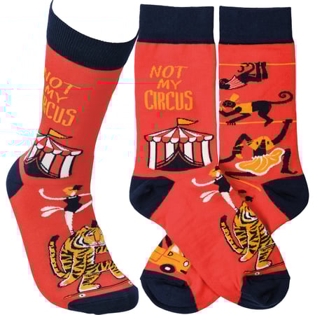 These mismatched socks from our LOL Made You Smile Collection feature woven designs with coordinating "Not My Circus Not My Monkeys" sentiment. Cotton, nylon, spandex. These Circus and Monkeys socks are one size fits most.
