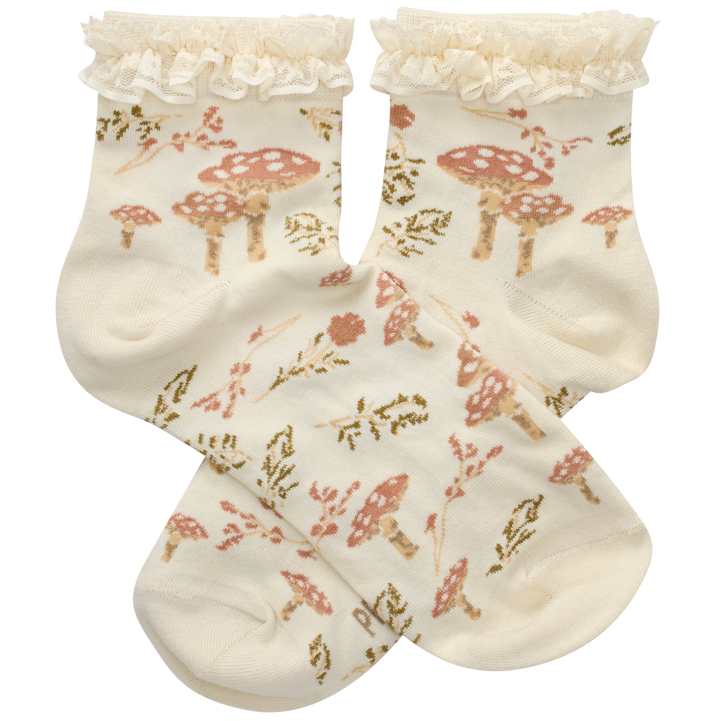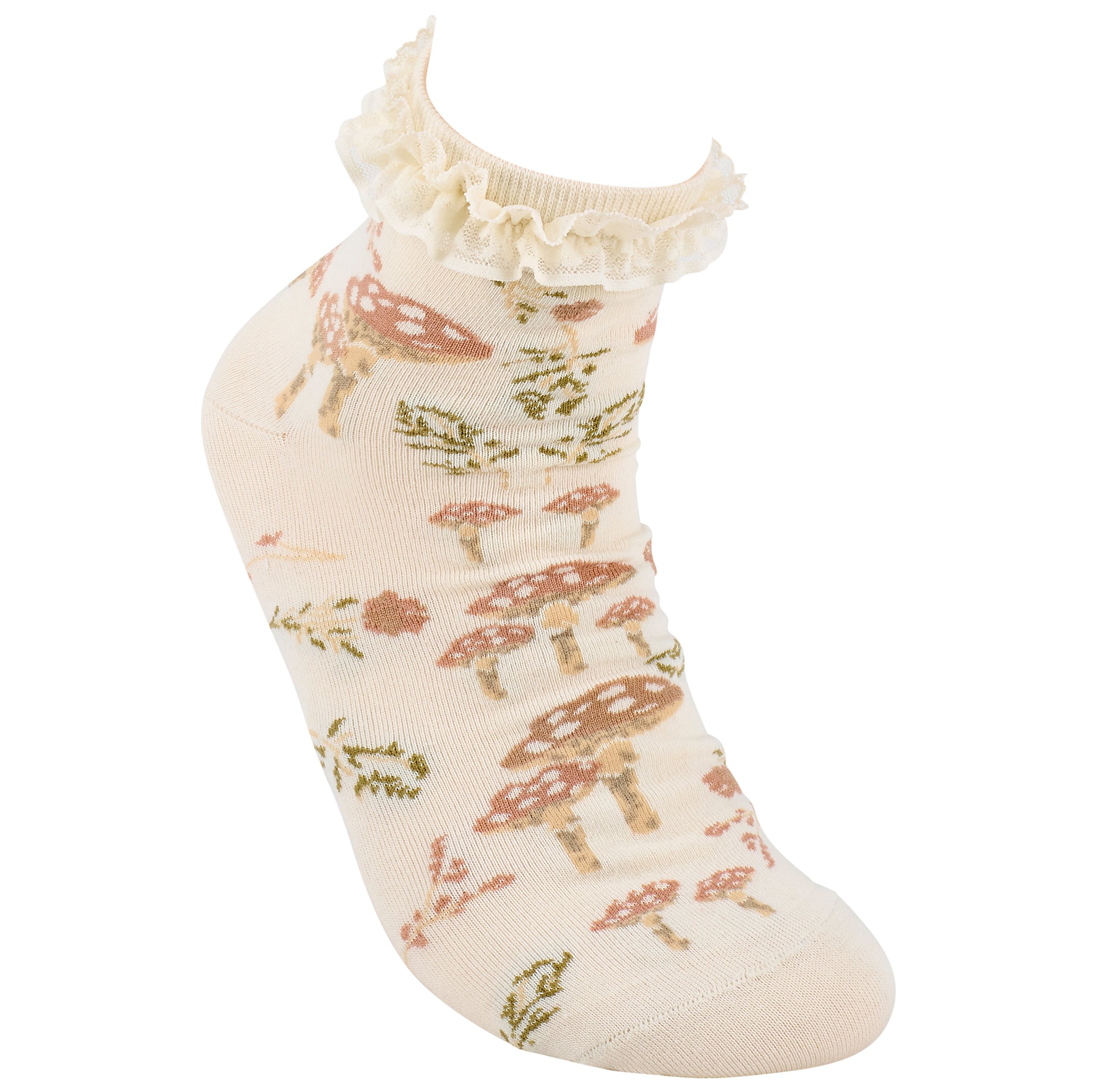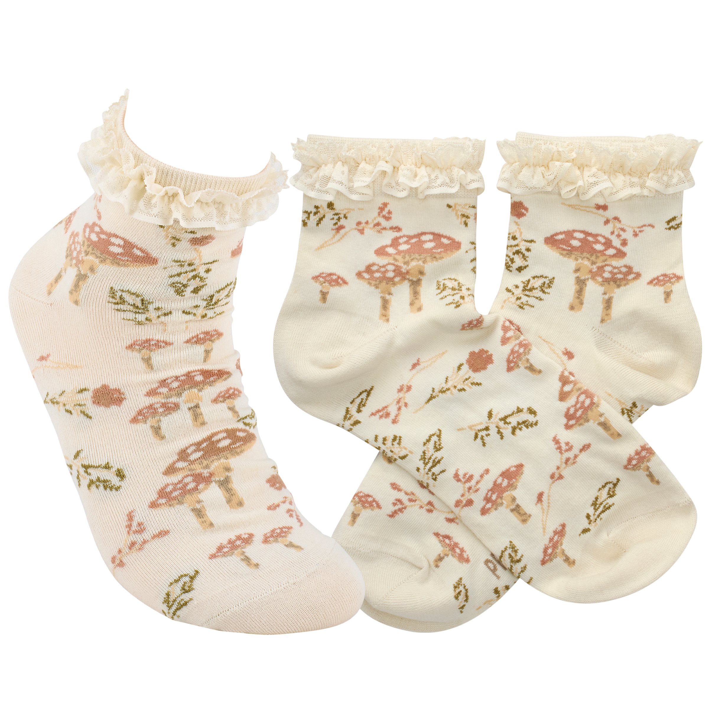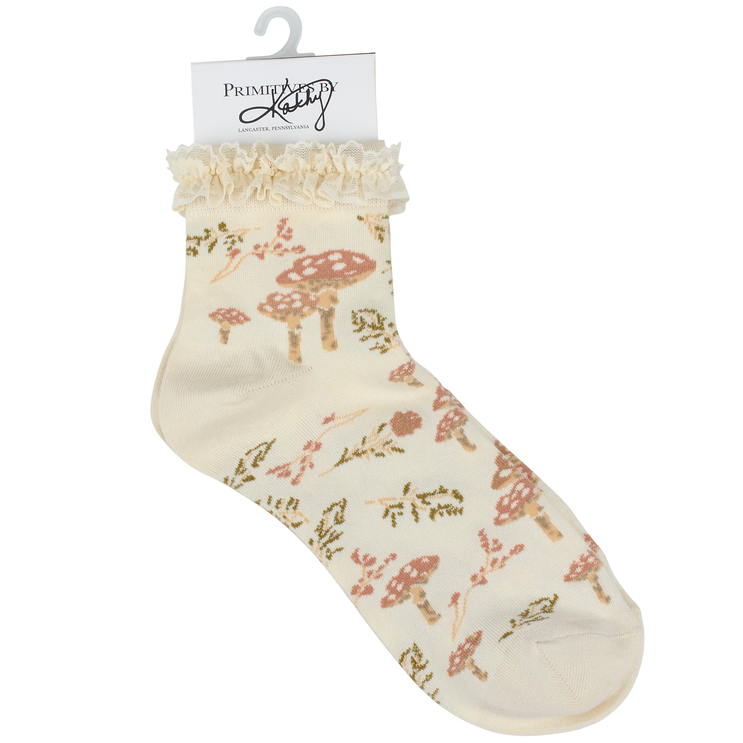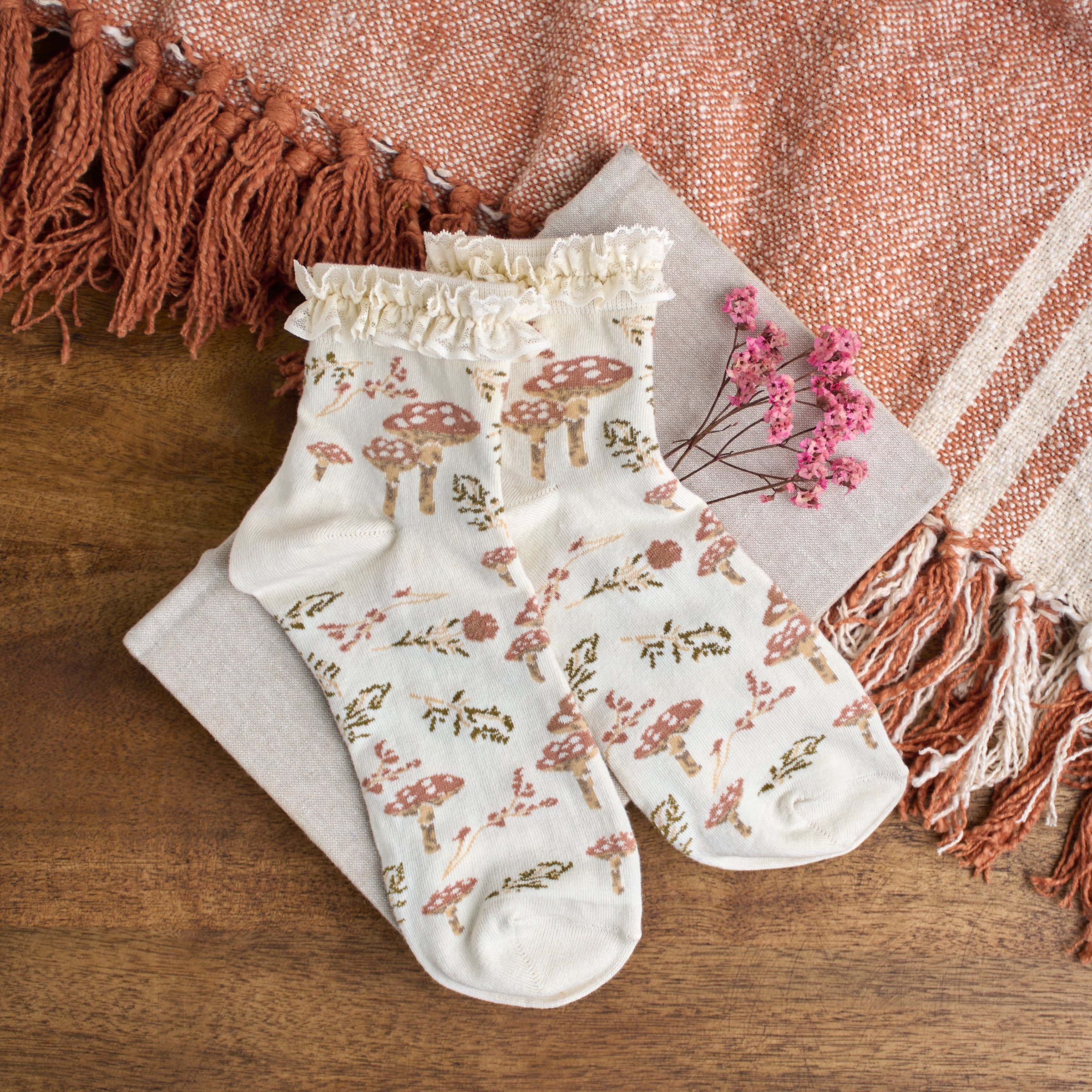 A pair of whimsical socks from our Cottagecore Collection displaying woven designs of mushrooms and complementing cottage garden imagery with cute ruffle trim along the cuff. Cottage garden designs are replicated from original art hand painted in a unique watercolor style. These giftable socks are made with a cotton, nylon, and spandex blend for a one size fits most design. Our Cottage Garden socks come with a decorative header card and a clear plastic hanger for easy rack display and gifting. A nature themed gift perfect for everyday self-expression.