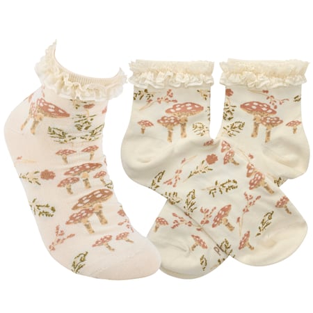 A pair of whimsical socks from our Cottagecore Collection displaying woven designs of mushrooms and complementing cottage garden imagery with cute ruffle trim along the cuff. Cottage garden designs are replicated from original art hand painted in a unique watercolor style. These giftable socks are made with a cotton, nylon, and spandex blend for a one size fits most design. Our Cottage Garden socks come with a decorative header card and a clear plastic hanger for easy rack display and gifting. A nature themed gift perfect for everyday self-expression.