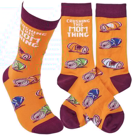 A pair of colorful socks from our Mother's Day Collection displaying playful hand illustrated designs of various crushed cans with a fun mom-themed sentiment that reads "Crushing This Mom Thing." These giftable socks are made with a cotton, nylon, and spandex blend for a one size fits most design. Our Crushing This Mom Thing socks come with a decorative header card and a clear plastic hanger for easy rack display and gifting. A fun mother's day gift perfect for everyday self-expression.