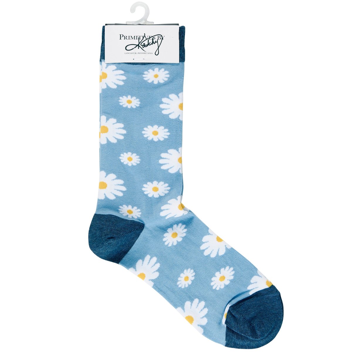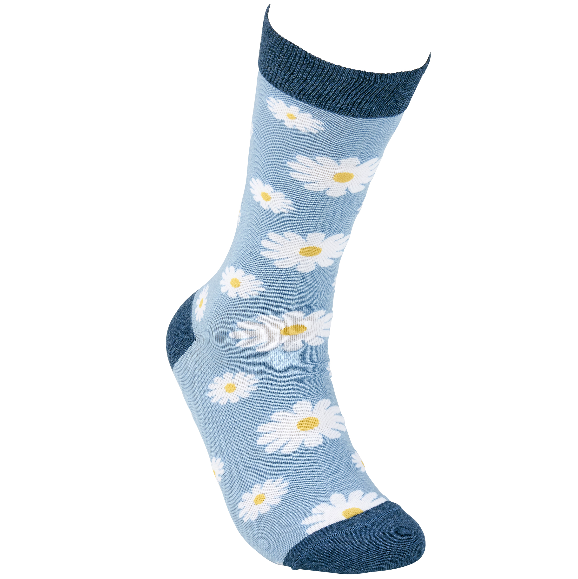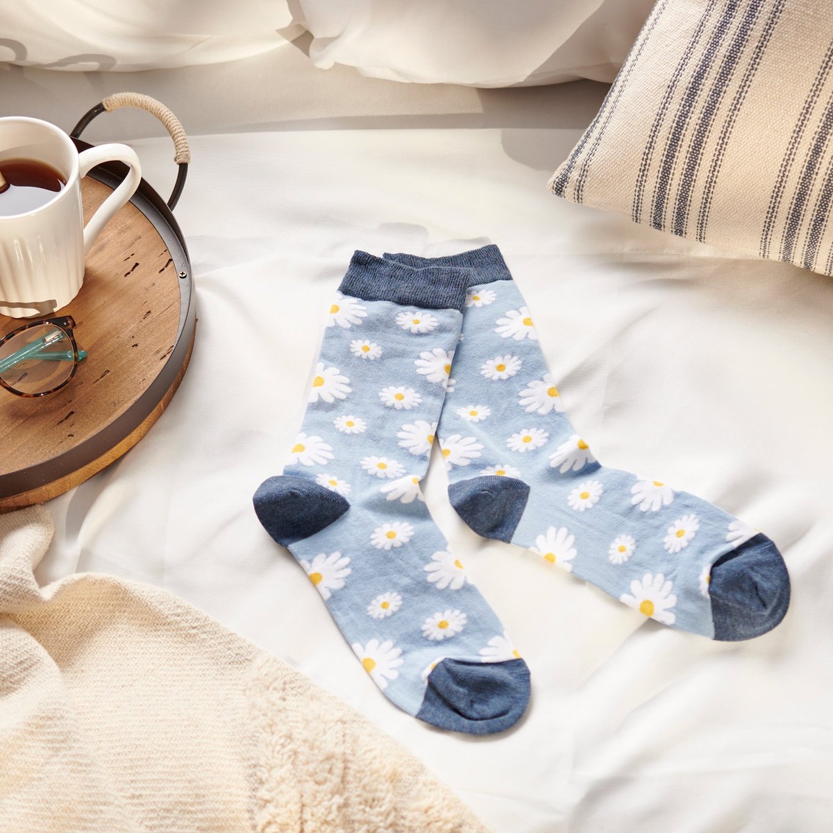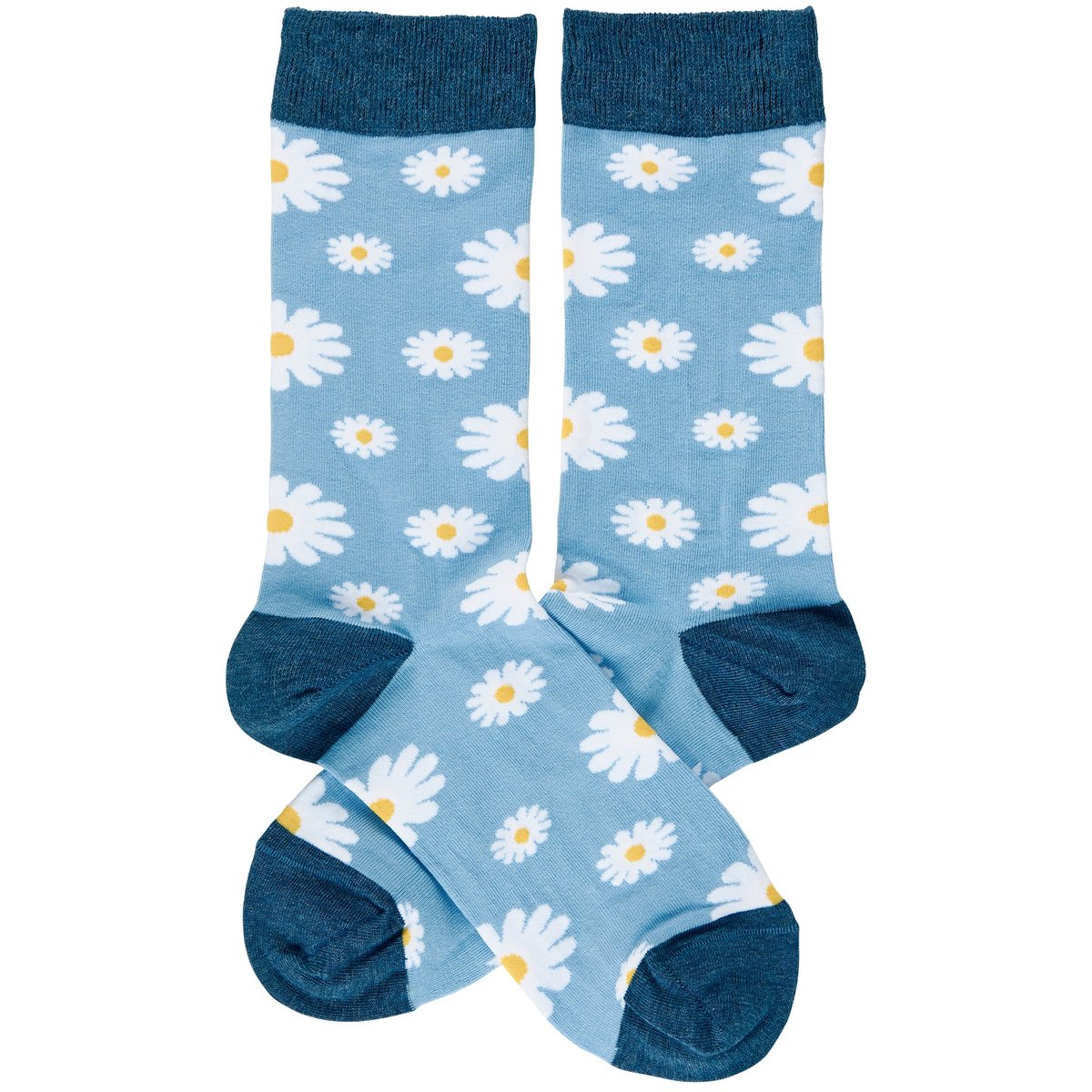 A pair of colorful socks from our Garden Collection displaying hand illustrated designs of daisies on light blue background. Socks feature a one size fits most design made with cotton, nylon, and spandex. Our Daisies socks come with a header card and a clear plastic hanger for display. A charming garden-themed gift perfect for everyday self-expression.