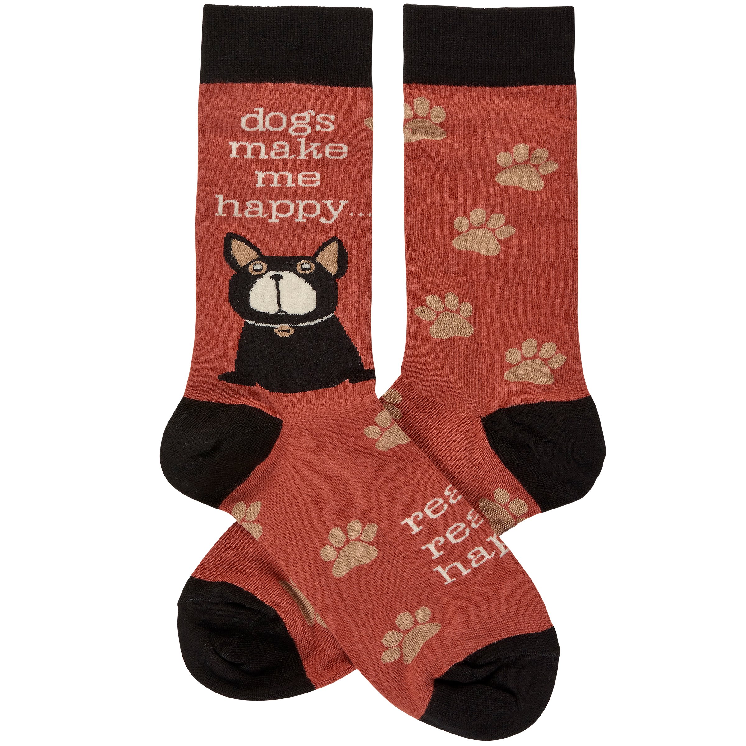 A pair of colorful woven socks from our Pet Collection displaying a rustic design of a dog and pawprints with a fun pet-themed sentiment that reads "Dogs Make Me Happy... Really Really Happy." Socks feature a one size fits most design made with cotton, nylon, and spandex. Our Dogs Make Me Happy socks come with a header card and a clear plastic hanger for display. A fun pet-themed accessory perfect for self-expression or gifting on any occasion.