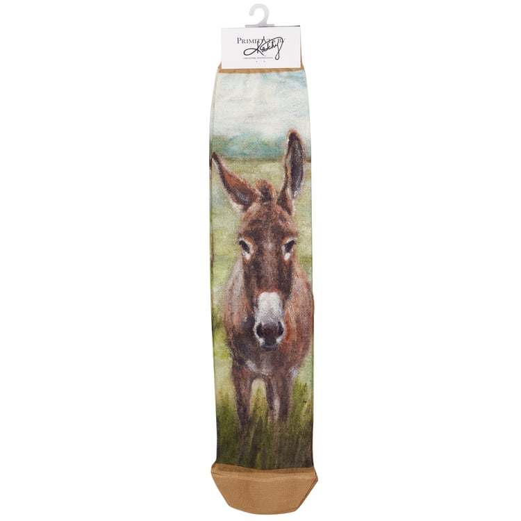 A pair of colorful knee-high socks from our Farmhouse Collection displaying a hand painted design of donkeys in a field on each sock. Donkey design is digitally printed replicating original artwork painted onto burlap canvas, giving the art a unique depth and texture. These giftable socks feature a knee-high length to easily show off the full design made with a spandex blend for a one size fits most design. Our knee-high Donkey socks come with a decorative header card and a clear plastic hanger for easy rack display and gifting. A charming farm-themed gift perfect for everyday self-expression.