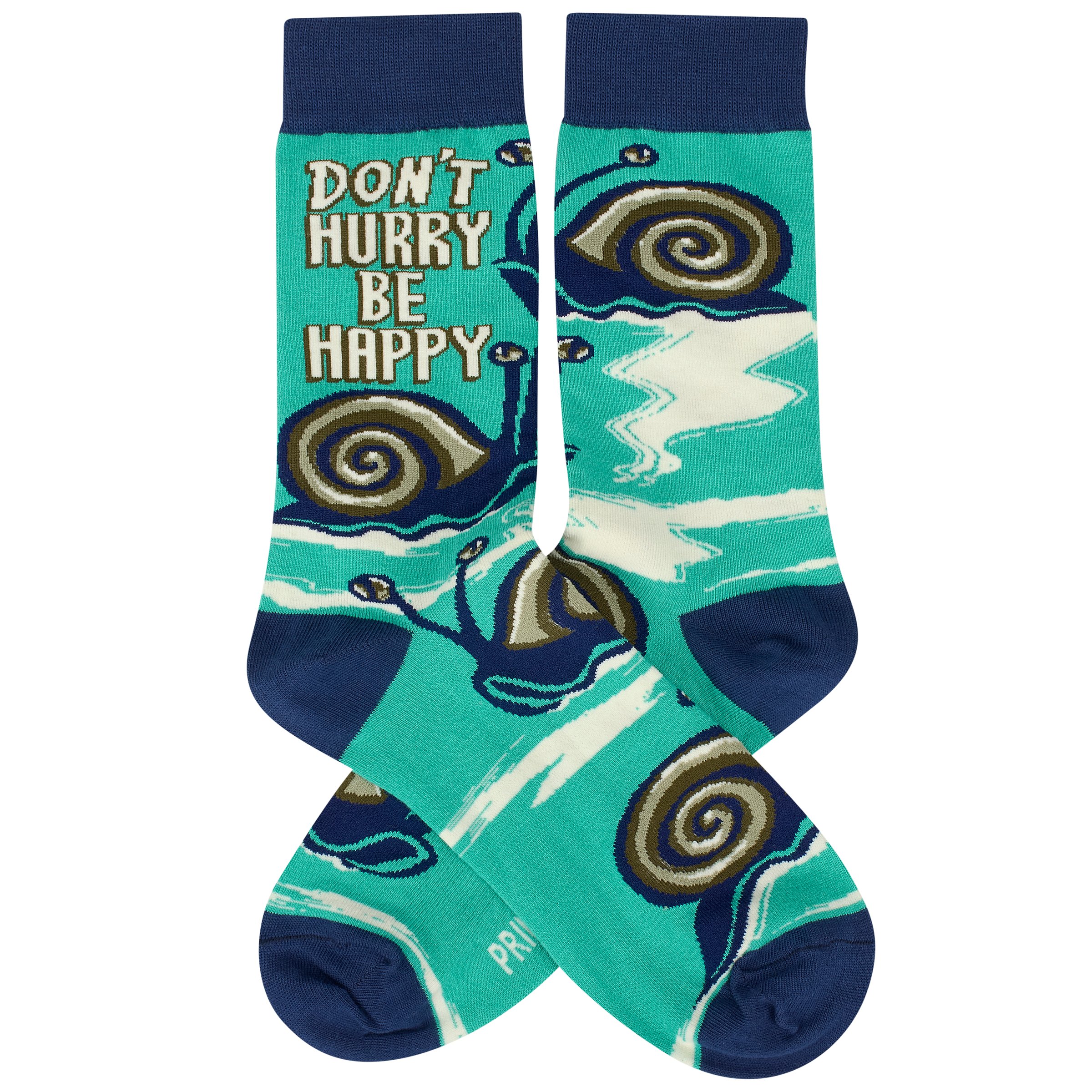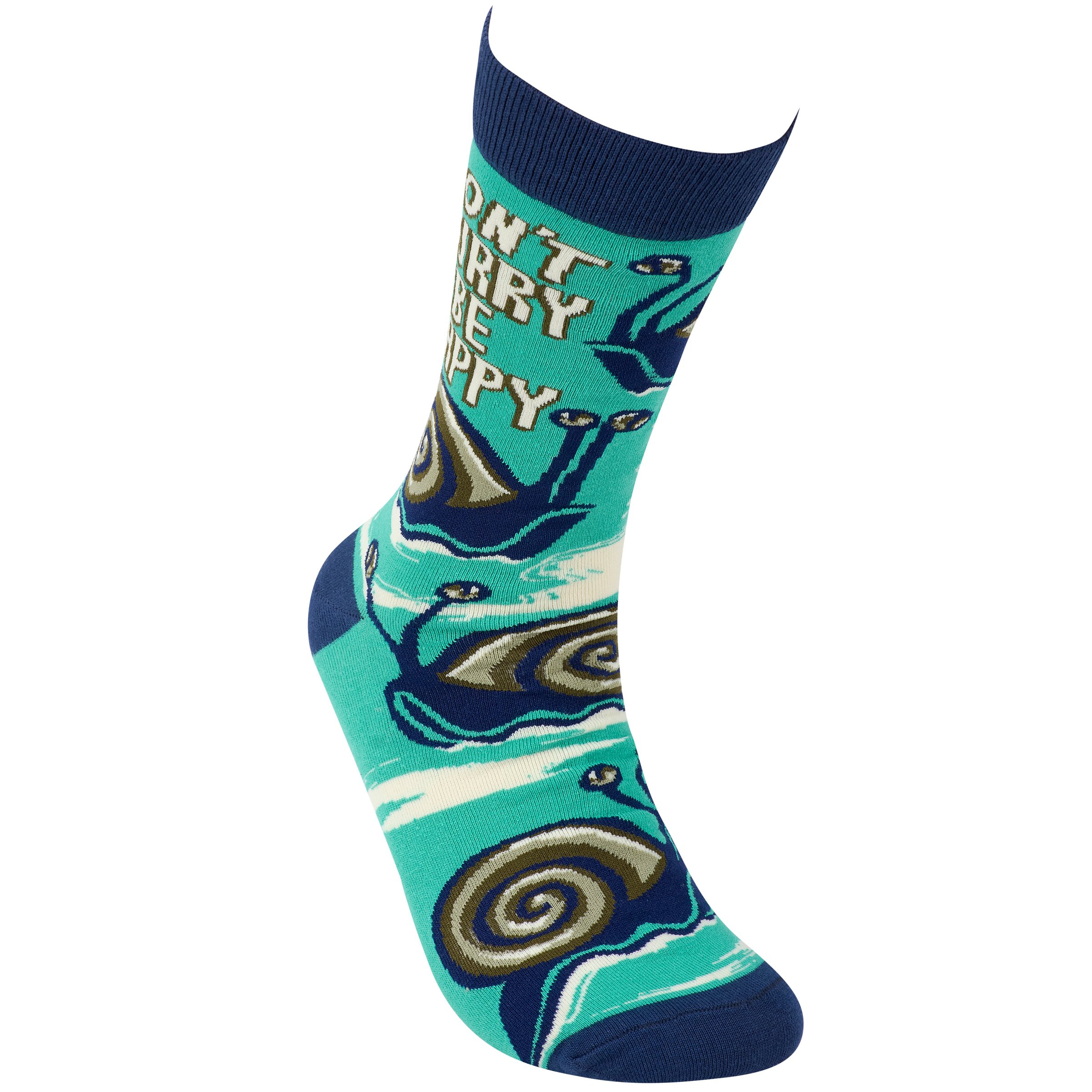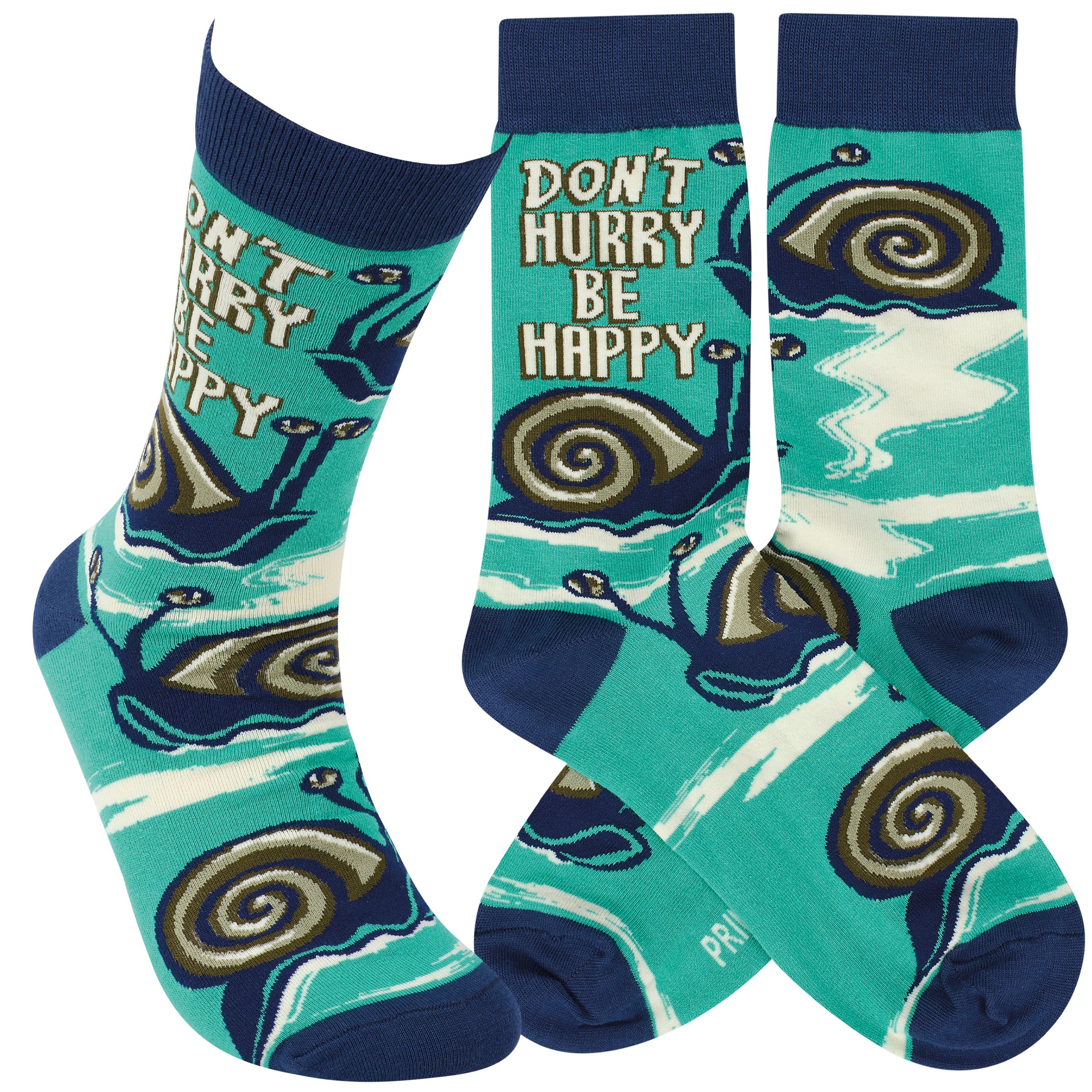 A pair of colorful socks from our LOL-Made You Smile Collection displaying playful hand illustrated designs of snails with a fun inspirational sentiment that reads "Don't Hurry Be Happy." These giftable socks are made with a cotton, nylon, and spandex blend for a one size fits most design. Our Don't Hurry Be Happy socks come with a decorative header card and a clear plastic hanger for easy rack display and gifting. A fun inspirational gift perfect for everyday self-expression.