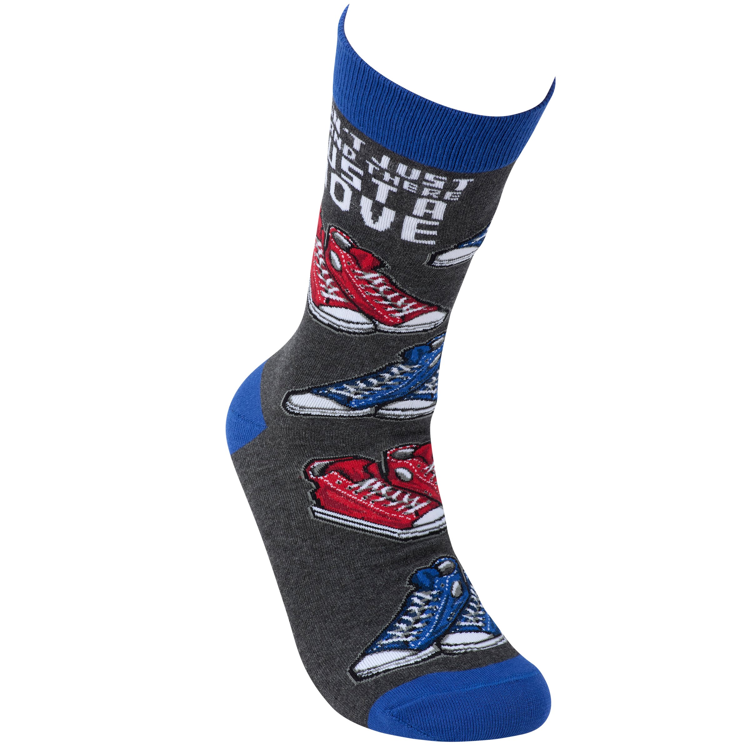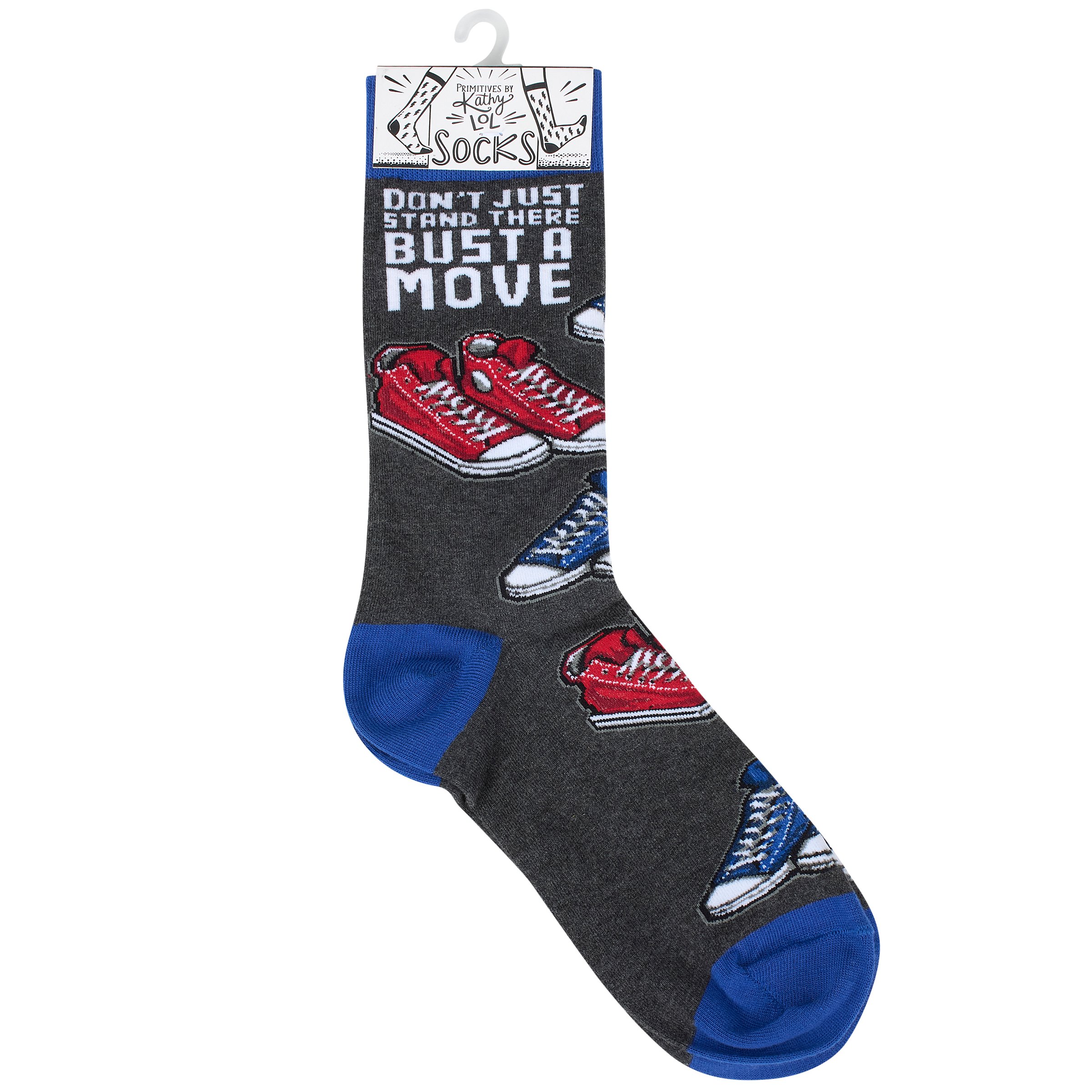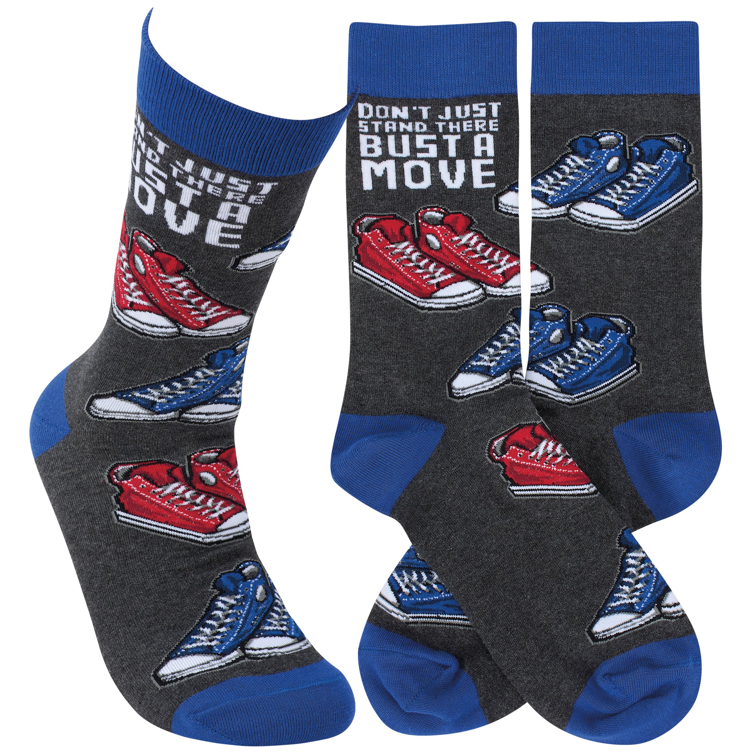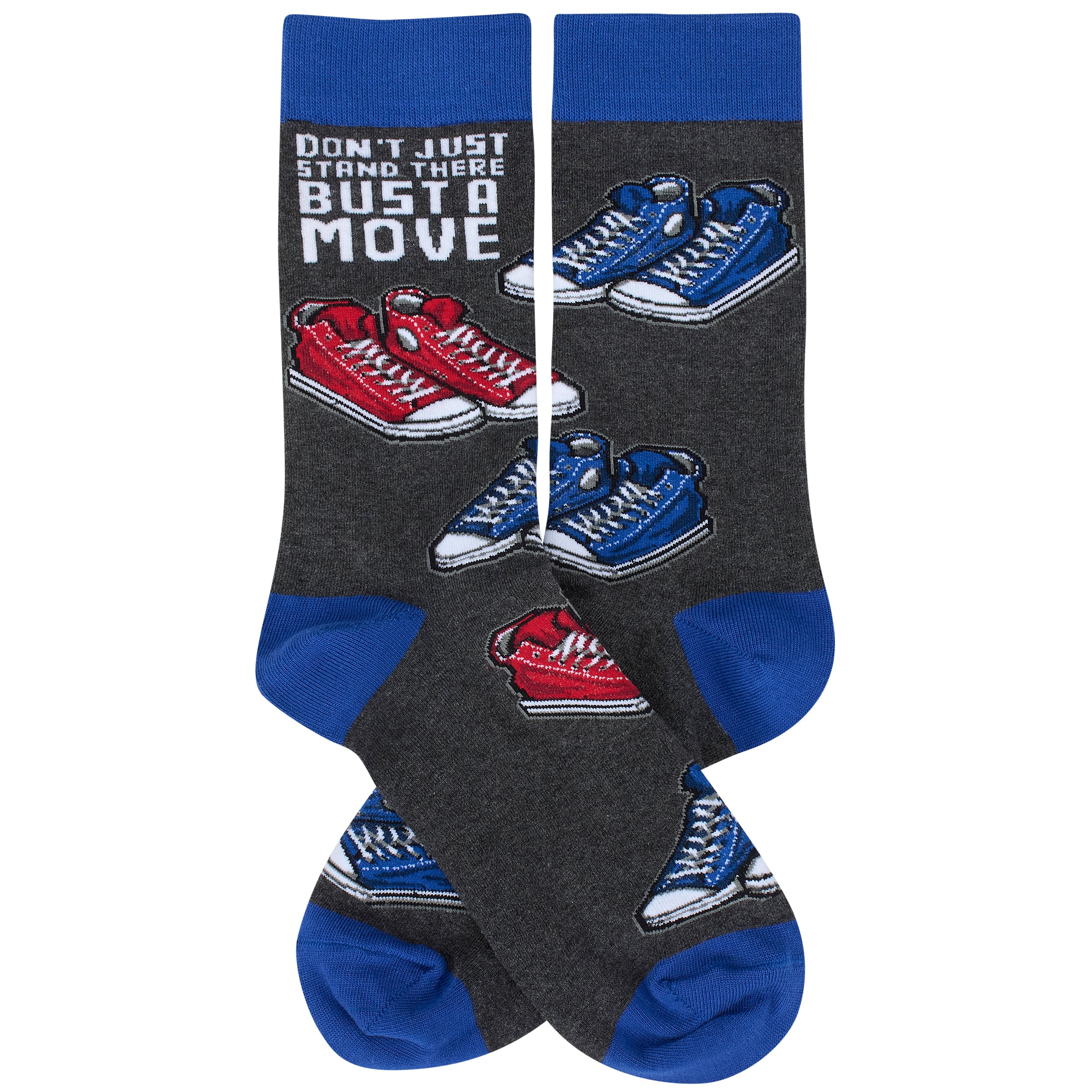 A pair of colorful socks from our LOL-Made You Smile Collection displaying playful hand illustrated designs of various sneakers with a fun sentiment that reads "Don't Just Stand There - Bust A Move." These giftable socks are made with a cotton, nylon, and spandex blend for a one size fits most design. Our Bust A Move socks come with a decorative header card and a clear plastic hanger for easy rack display and gifting. A funny gift perfect for everyday self-expression.