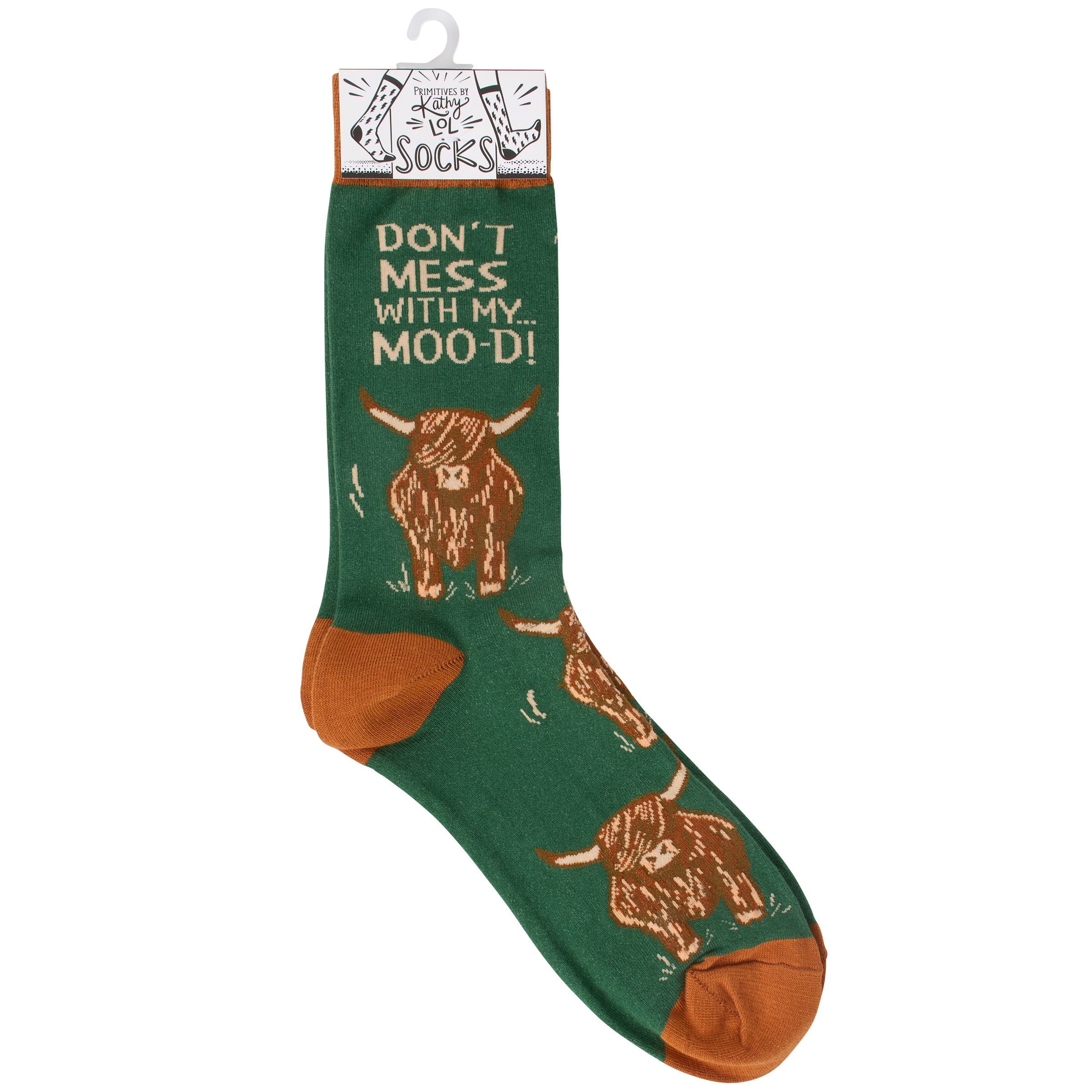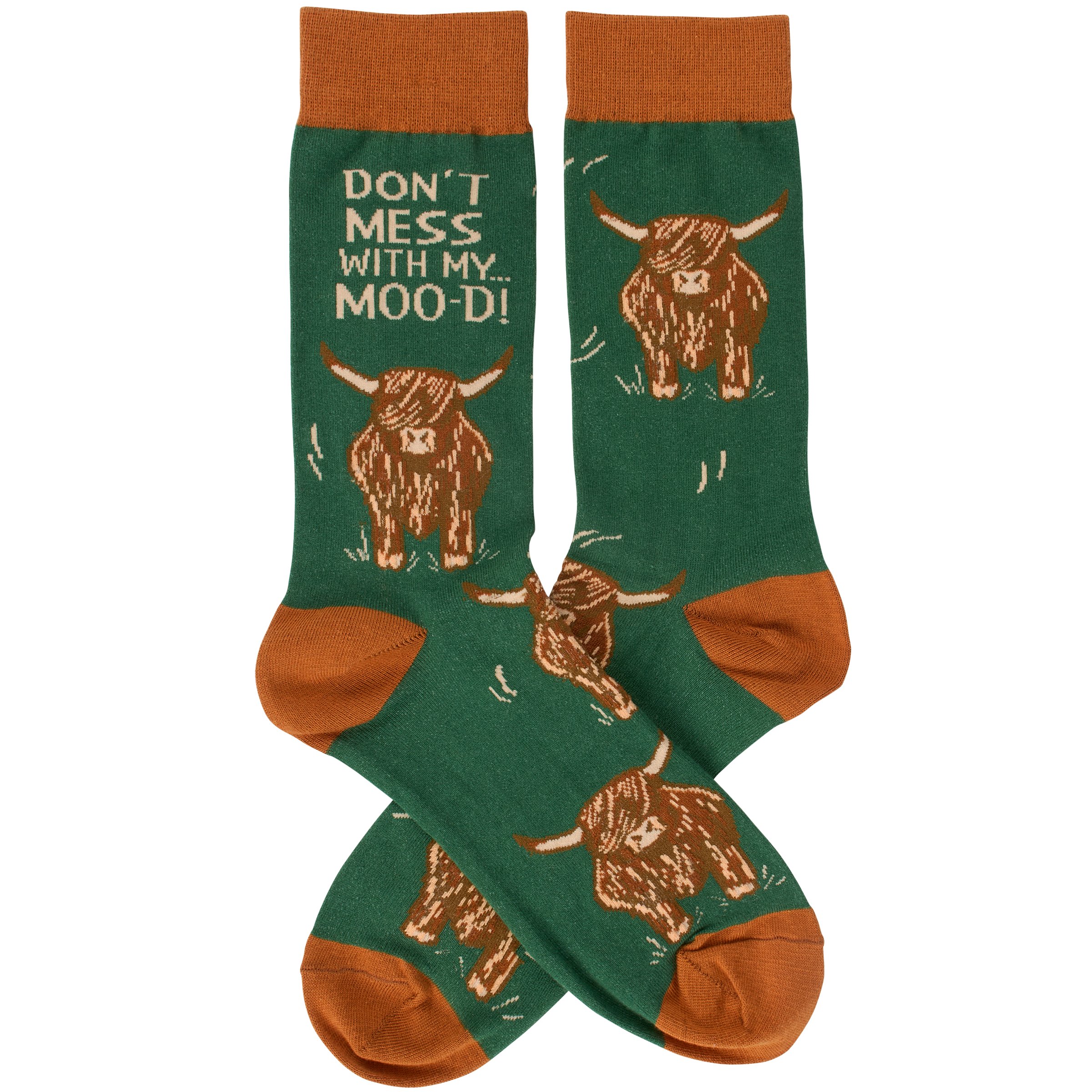 A pair of colorful socks from our Homestead Collection displaying playful hand illustrated designs of highland cows with a fun farm inspired sentiment that reads "Don't Mess With My Moo-d!" These giftable socks are made with a cotton, nylon, and spandex blend for a one size fits most design. Our Don't Mess With My Moo-d socks come with a decorative header card and a clear plastic hanger for easy rack display and gifting. A fun farm themed gift perfect for everyday self-expression.