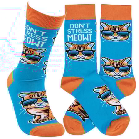 A pair of colorful socks from our Pet Collection displaying playful hand illustrated designs of cats wearing sunglasses with a fun pet inspired sentiment that reads "Don't Stress Meowt." These giftable socks are made with a cotton, nylon, and spandex blend for a one size fits most design. Our Don't Stress Meowt socks come with a decorative header card and a clear plastic hanger for easy rack display and gifting. A fun cat-themed gift perfect for everyday self-expression.