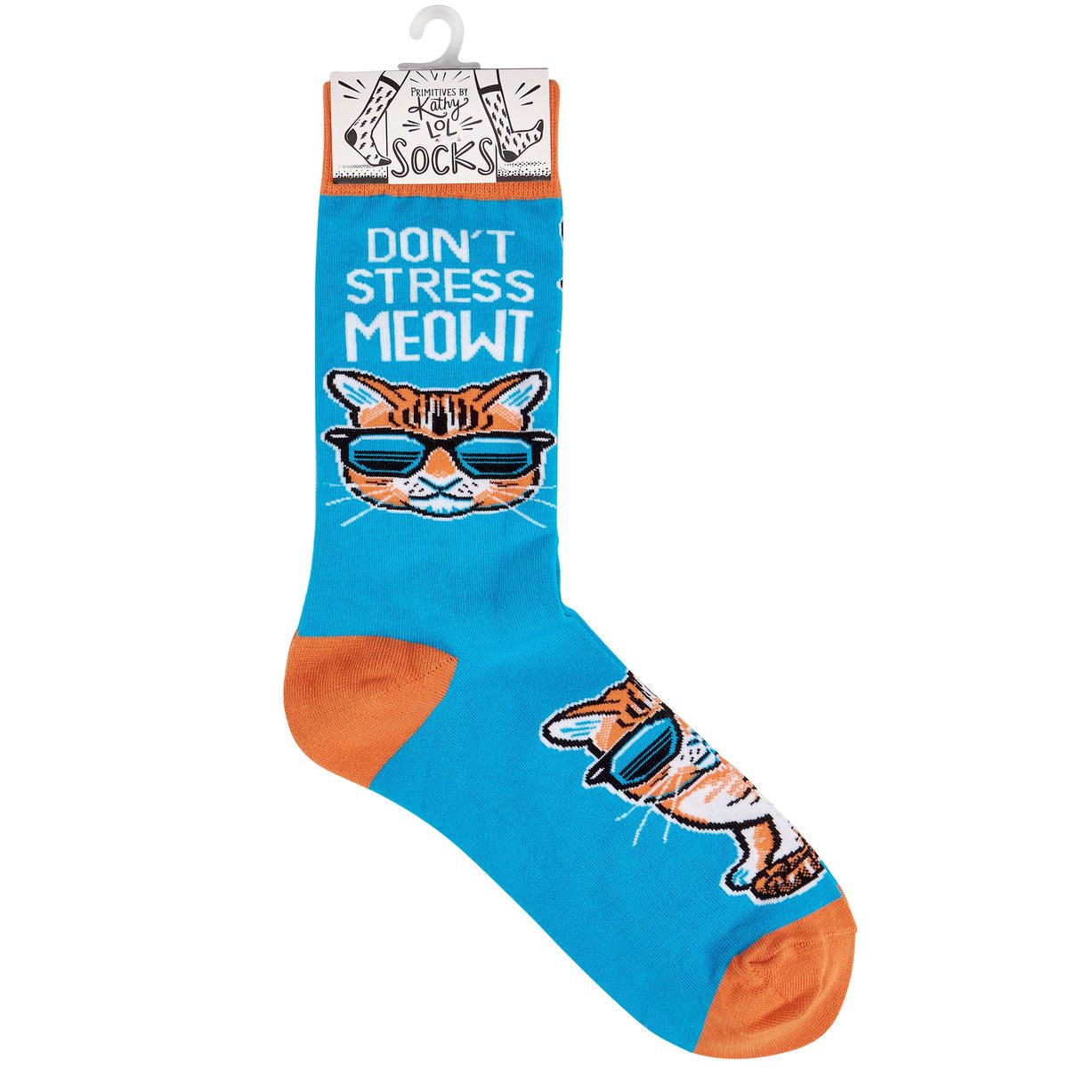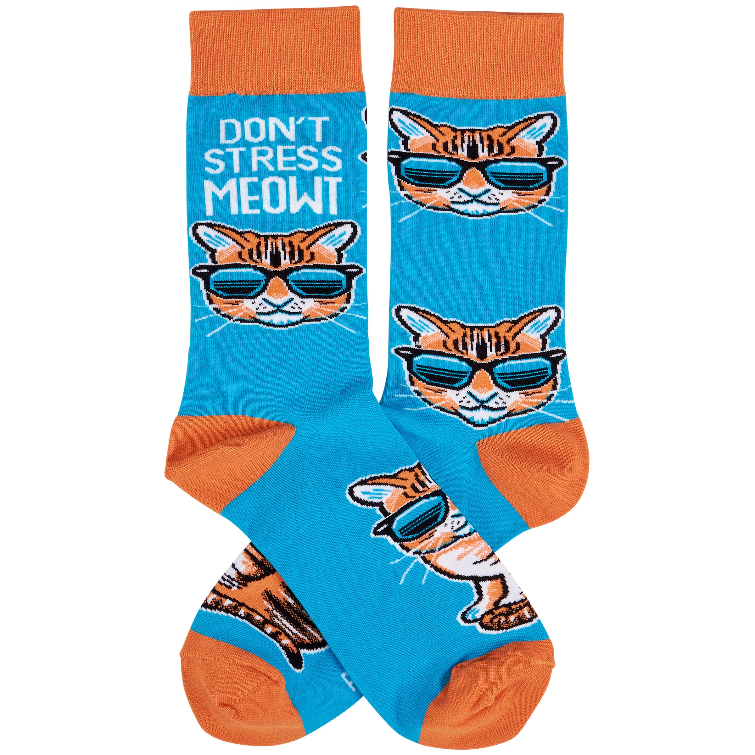 A pair of colorful socks from our Pet Collection displaying playful hand illustrated designs of cats wearing sunglasses with a fun pet inspired sentiment that reads "Don't Stress Meowt." These giftable socks are made with a cotton, nylon, and spandex blend for a one size fits most design. Our Don't Stress Meowt socks come with a decorative header card and a clear plastic hanger for easy rack display and gifting. A fun cat-themed gift perfect for everyday self-expression.