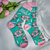 A pair of colorful socks from our LOL-Made You Smile Collection displaying playful hand illustrated designs of a doughnut character and sprinkles in a fun retro style with a food inspired sentiment that reads "Eat More Hole Foods." These giftable socks are made with a cotton, nylon, and spandex blend for a one size fits most design. Our Eat More Hole Foods socks come with a decorative header card and a clear plastic hanger for easy rack display and gifting. A fun food-themed gift perfect for everyday self-expression.