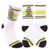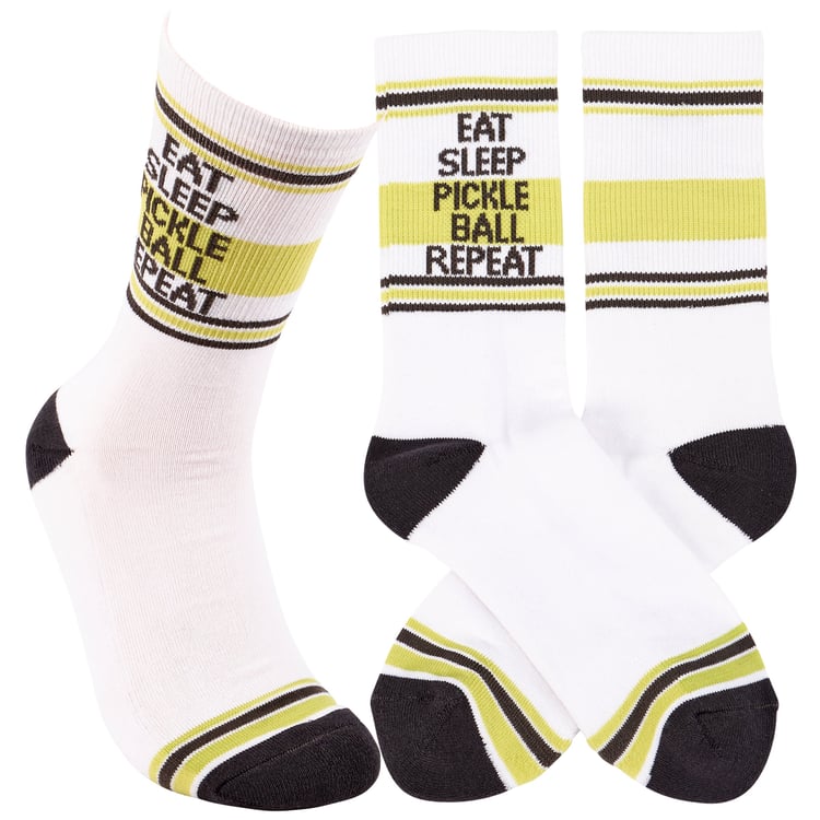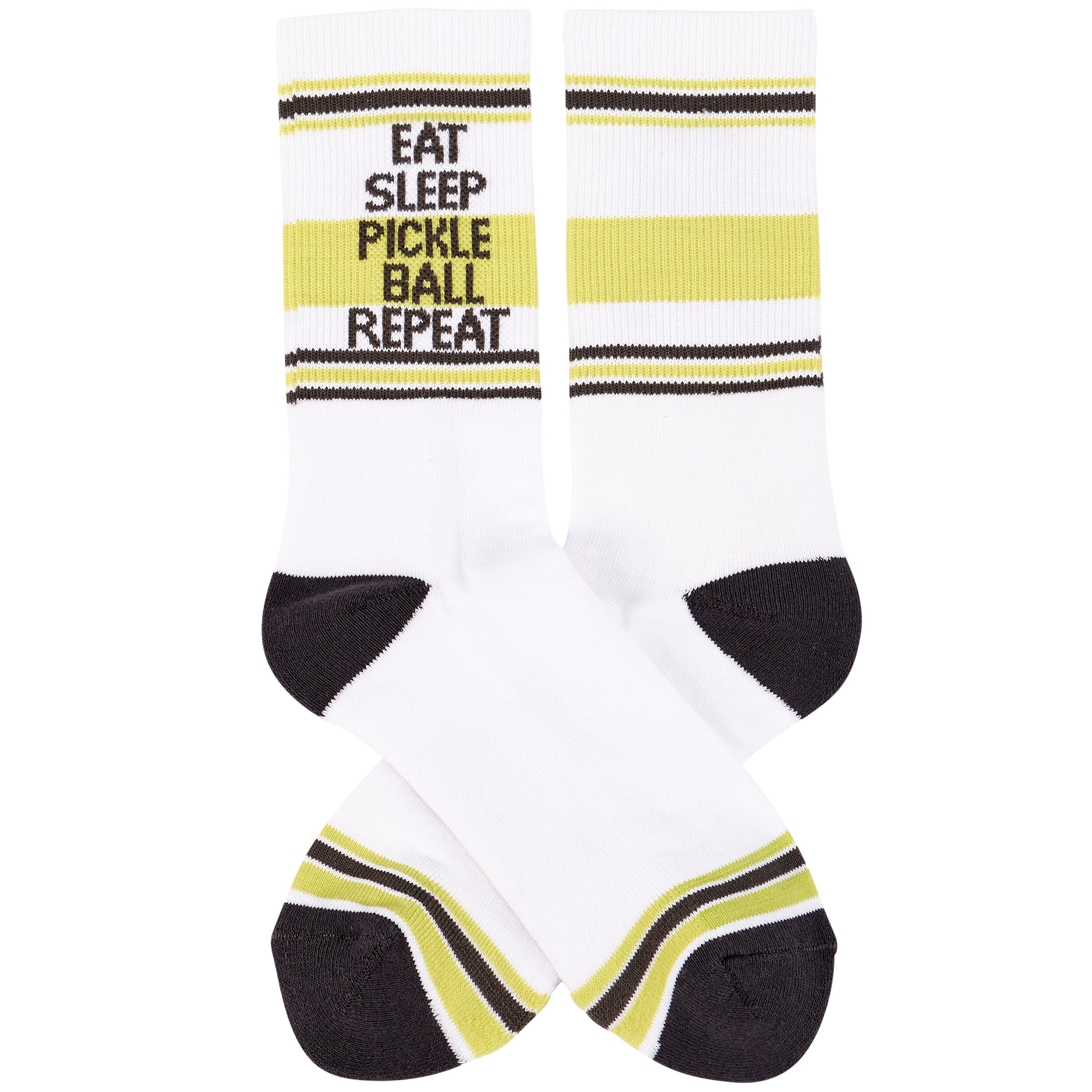 A pair of colorful socks from our Sports Collection displaying a varsity sock inspired design with a fun pickleball-themed sentiment that reads "Eat Sleep Pickleball Repeat." These giftable socks are made with a cotton, nylon, and spandex blend for a one size fits most design. Our Eat Sleep Pickleball socks come with a decorative header card and a clear plastic hanger for easy rack display and gifting. A fun pickleball gift perfect for everyday self-expression.