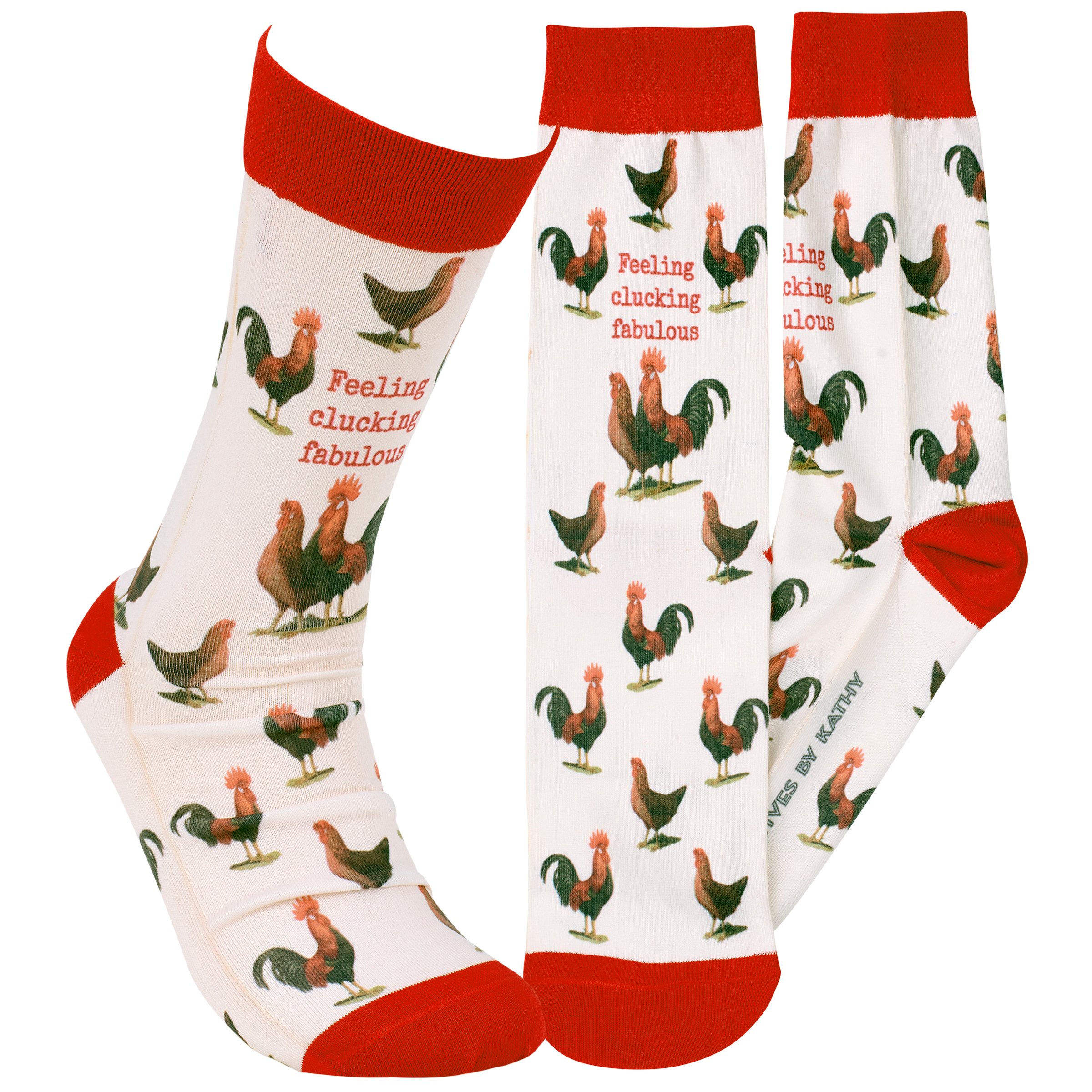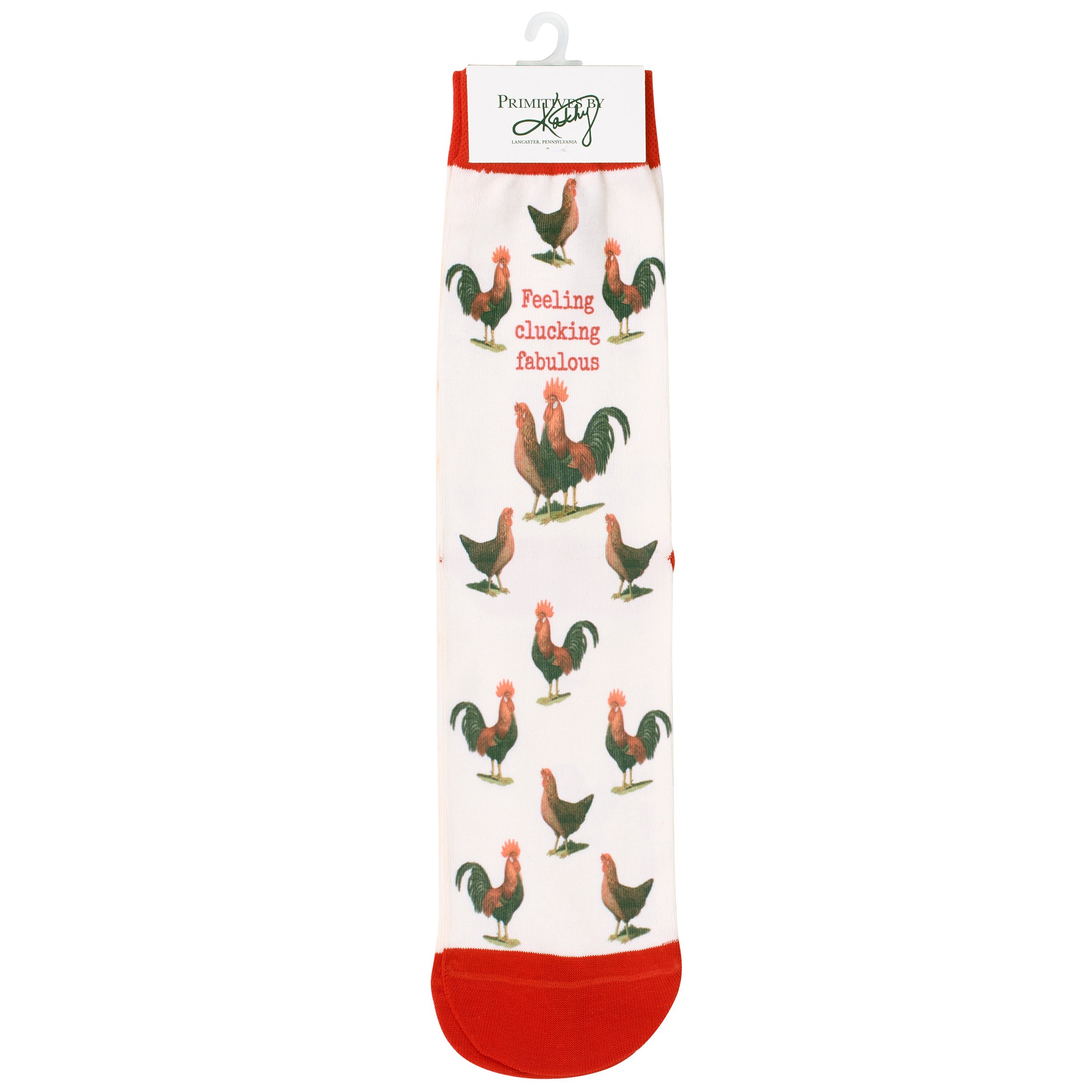 A pair of fun socks from our Farmhouse Collection featuring an all-over design displaying vintage art of roosters and chickens with a funny farm animal pun on the front that reads "Feeling Clucking Fabulous" as well as red color accents on the cuff, heel, and toe. These giftable socks are made with a spandex blend for a one size fits most design. Our Feeling Clucking Fabulous socks come with a decorative header card and a clear plastic hanger for easy rack display and gifting. A fun farm themed gift perfect for everyday self-expression.