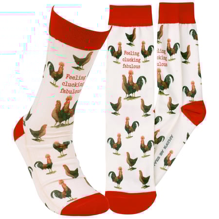A pair of fun socks from our Farmhouse Collection featuring an all-over design displaying vintage art of roosters and chickens with a funny farm animal pun on the front that reads "Feeling Clucking Fabulous" as well as red color accents on the cuff, heel, and toe. These giftable socks are made with a spandex blend for a one size fits most design. Our Feeling Clucking Fabulous socks come with a decorative header card and a clear plastic hanger for easy rack display and gifting. A fun farm themed gift perfect for everyday self-expression.