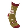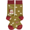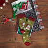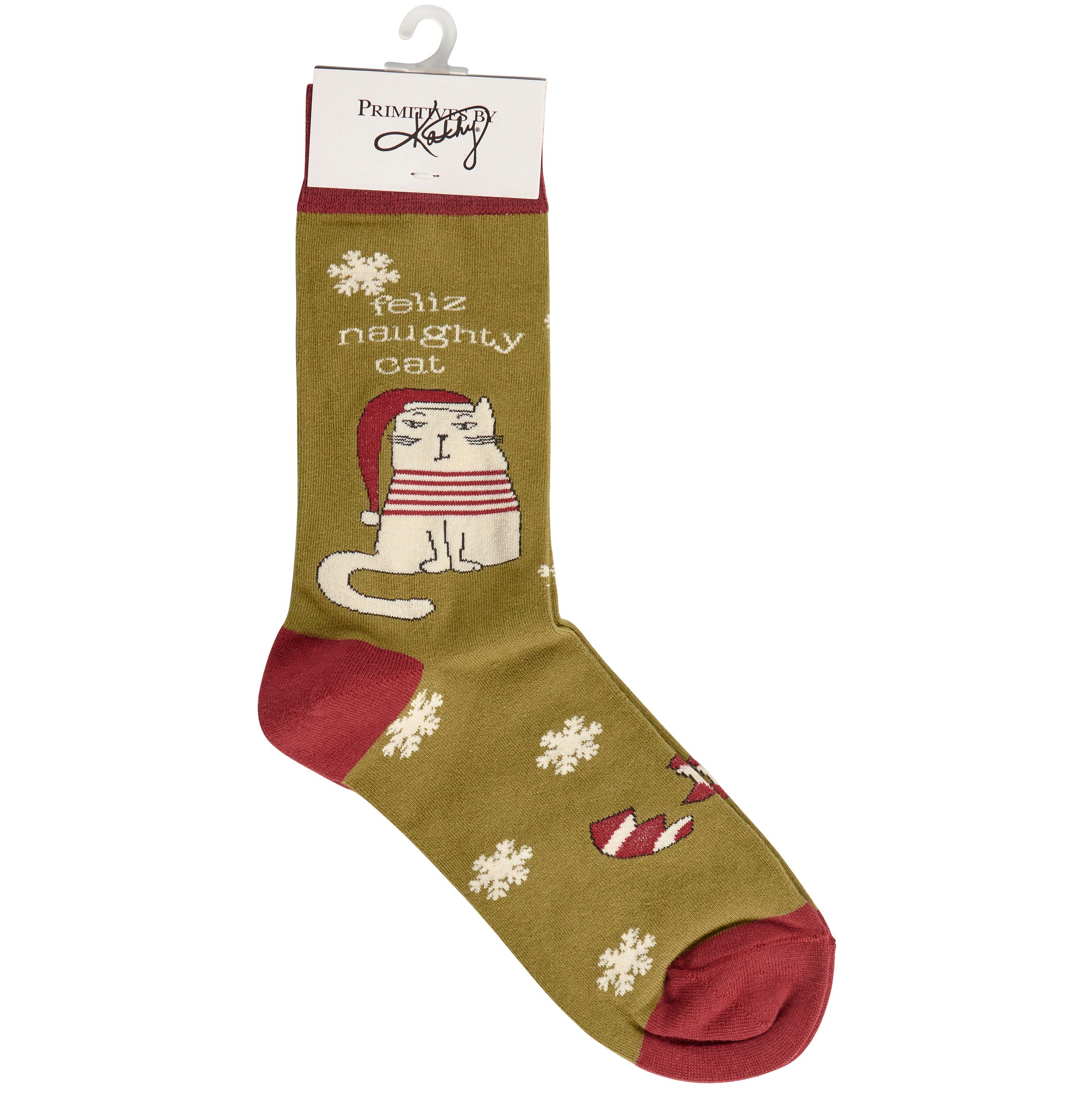 A pair of colorful woven socks from our Holiday Pet Collection displaying a sassy cat in a Santa hat and broken ornament with a fun pet-themed sentiment that reads "Feliz Naughty Cat." Seasonal socks feature a one size fits most design made with cotton, nylon, and spandex. Our Feliz Naughty Cat socks come with a header card and a clear plastic hanger for display. A fun pet-themed gift perfect for seasonal self-expression.