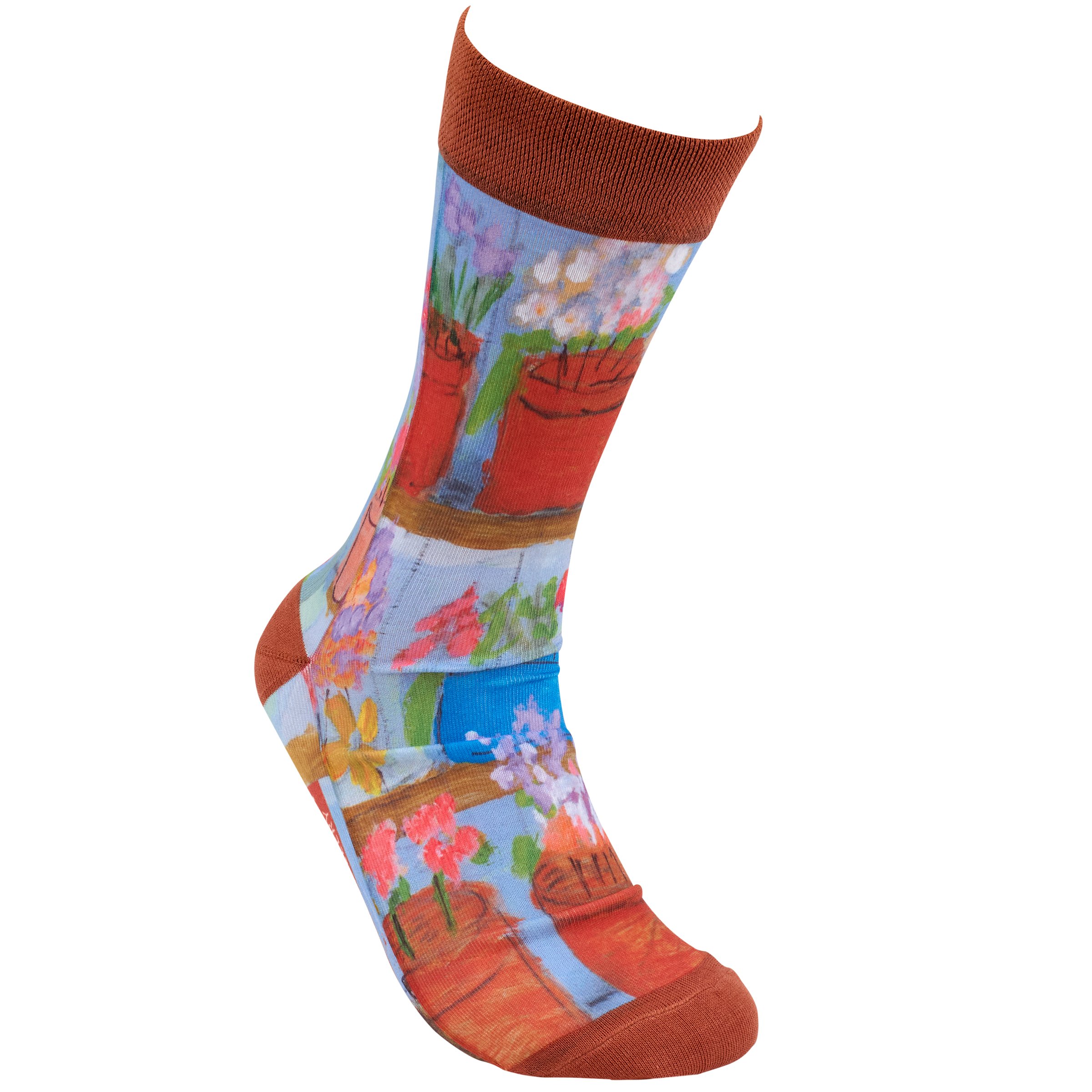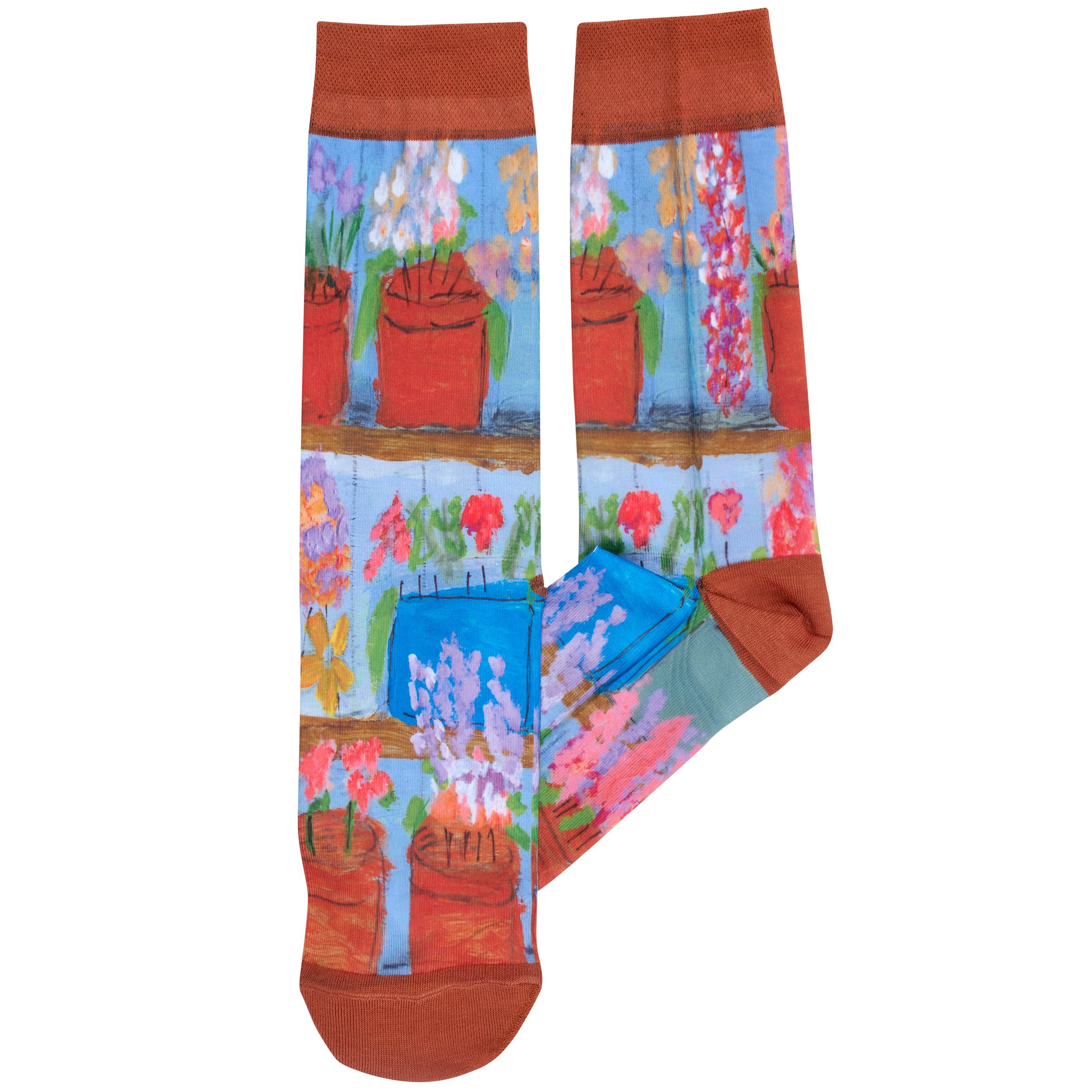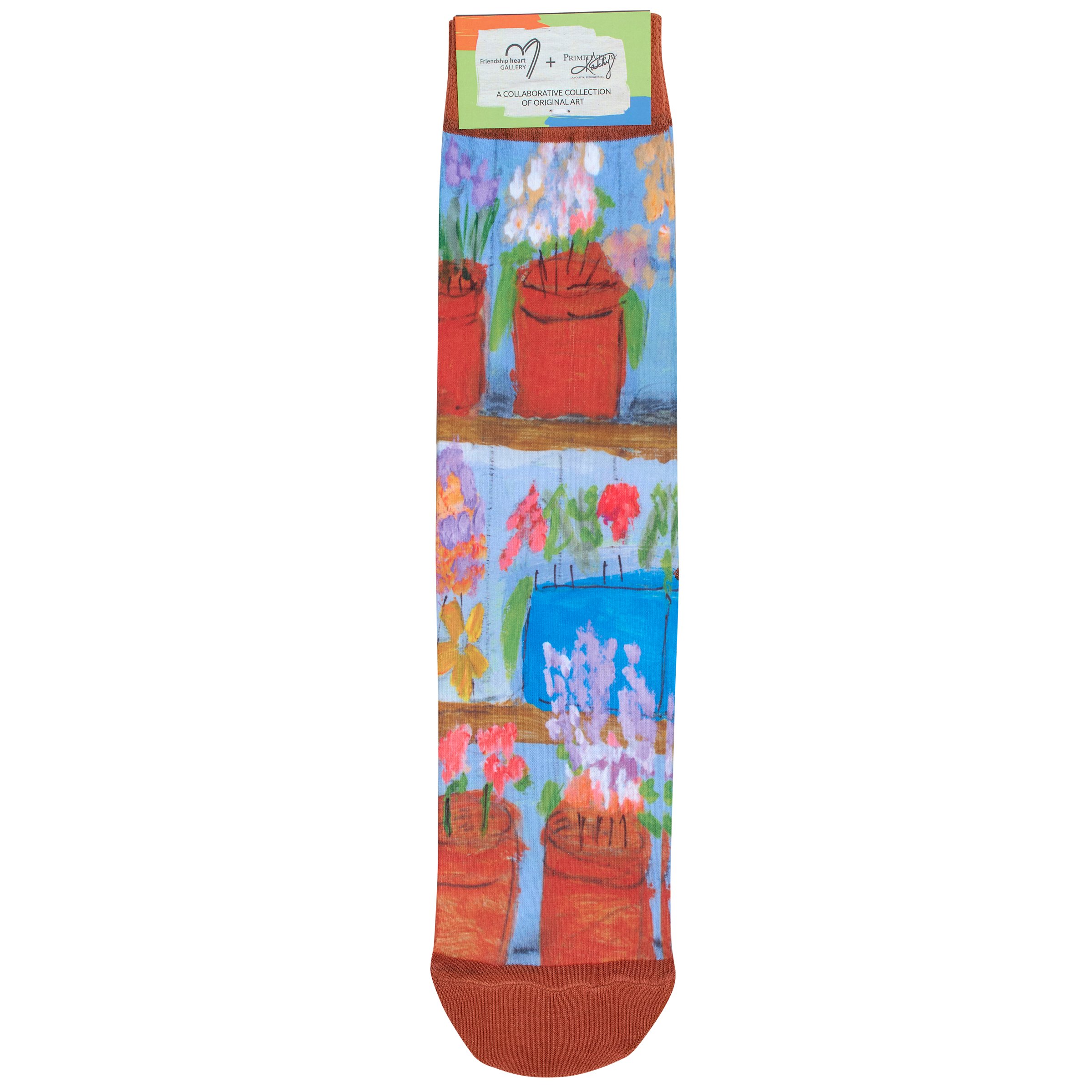 A pair of colorful socks from our Friendship Heart Gallery Collection featuring an all-over design displaying original art of shelves in a flower shop created at the Friendship Heart Gallery in Lancaster, PA which supports artists with intellectual disabilities and autism. Artist socks also feature brown color accents on the cuff, heel, and toe. These giftable socks are made with a spandex blend for a one size fits most design. Our Flower Shop socks come with a decorative header card and a clear plastic hanger for easy rack display and gifting. A thoughtful gift that supports artists in local communities. Perfect for mismatching with other colorful socks to wear during Rock Your Socks events. On March 21st people all around the world come together every year and celebrate World Down Syndrome Day by wearing brightly colored, mismatched socks to represent the unique talents and abilities of people with Down syndrome.