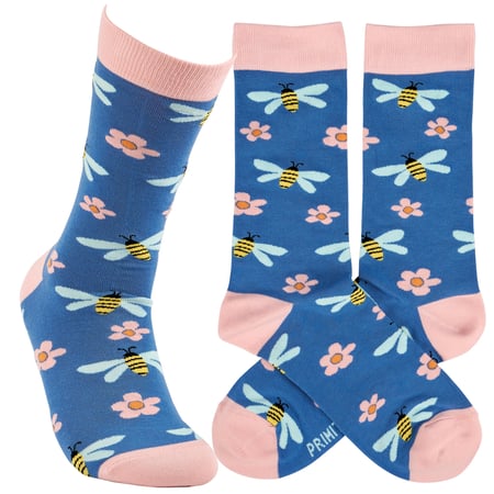 A pair of colorful socks from our Inspiration & Blooms Collection displaying a vibrant pattern of flowers and bees with pink color accents on the cuff, heel, and toe. These giftable socks are made with a cotton, nylon, and spandex blend for a one size fits most design. Our Flowers And Bees socks come with a decorative header card and a clear plastic hanger for easy rack display and gifting. An inspirational gift perfect for everyday self-expression.