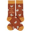 A pair of colorful socks from our Homestead Collection displaying unique hand illustrated designs of chickens with a fun sentiment that reads "Fluent In Fowl Language." Socks feature a one size fits most design made with cotton, nylon, and spandex. Our Fowl Language socks come with a header card and a clear plastic hanger for display. A fun farmer-themed gift perfect for everyday self-expression.