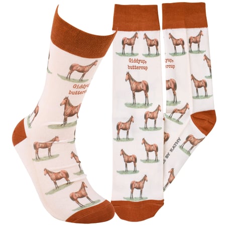 A pair of fun socks from our Farmhouse Collection featuring an all-over design displaying vintage art of horses with a funny horse pun on the front that reads "Giddyup, Buttercup" as well as brown color accents on the cuff, heel, and toe. These giftable socks are made with a spandex blend for a one size fits most design. Our Giddyup, Buttercup socks come with a decorative header card and a clear plastic hanger for easy rack display and gifting. A fun horse themed gift perfect for everyday self-expression.