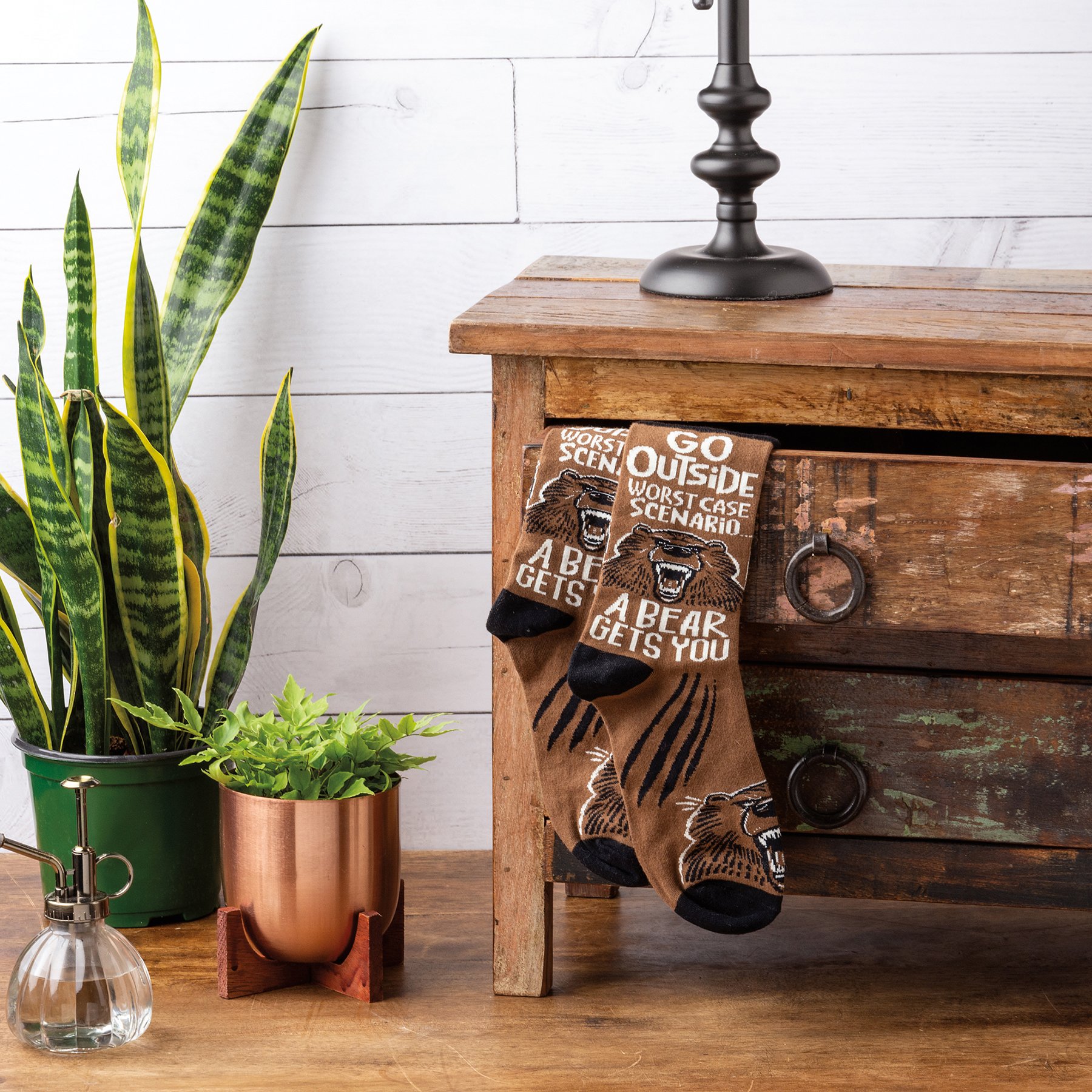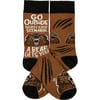 These colorful socks feature woven designs with coordinating "Go Outside Worst Case Scenario…A Bear Gets You" sentiment. Cotton, nylon, spandex. One size fits most.